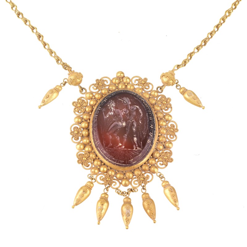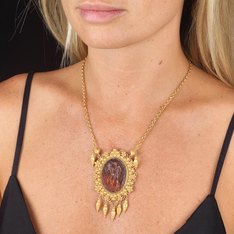 in oro giallo 18kt, composta da catena e grande pendente lavorato a sbalzo e microgranulato, recante al centro una pietra con motivo figurato inciso, lungh. cm 46, gr. 42