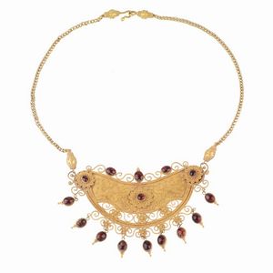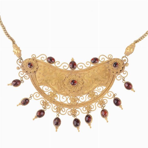in oro giallo 18kt, con ampio pendente a semiluna lavorato con la tecnica della granulazione e impreziosito da pietre taglio cabochon, lungh. cm 47, dim. pedente cm 9x5,5, gr. 49