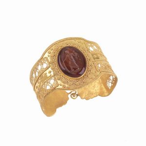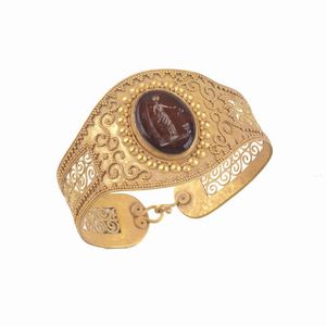 BRACCIALE RIGIDO STILE ARCHEOLOGICO MICROGRANULATO in oro giallo 18kt, traforato e lavorato con la tecnica della [..]