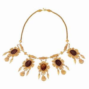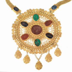 COLLANA STILE ARCHEOLOGICO CON PENDENTI in oro giallo 18kt, composta da catena e cinque pendenti con pietre figurate [..]
