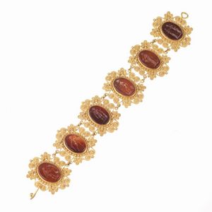 BRACCIALE STILE ARCHEOLOGICO CON PIETRE DURE in oro giallo 18kt, composto da una serie di maglie piatte circolari, [..]