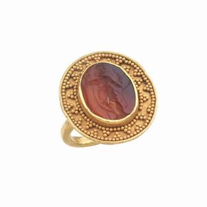 ANELLO STILE ARCHEOLOGICO in oro giallo 18kt, con al centro una pietra dura incisa entro cornice microgranulata, [..]