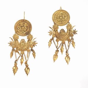 PAIO DI ORECCHINI PENDENTI STILE ARCHEOLOGICO in oro giallo 18kt, composti da vari elementi pendenti lavorati [..]