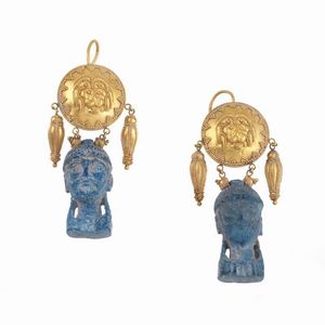 PAIO DI ORECCHINI PENDENTI STILE ARCHEOLOGICO in oro giallo 18kt, composti da elementi pendenti raffiguranti motivi [..]