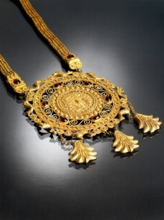 COLLANA CON GRANDE PETTORALE STILE ARCHEOLOGICO in oro giallo 18kt, realizzata a maglia tessita da cui pende un [..]