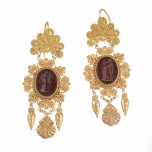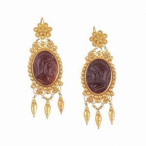 PAIO DI ORECCHINI PENDENTI STILE ARCHEOLOGICO in oro giallo 18kt, lavorati a sbalzo e con la tecnica della granulazione, [..]