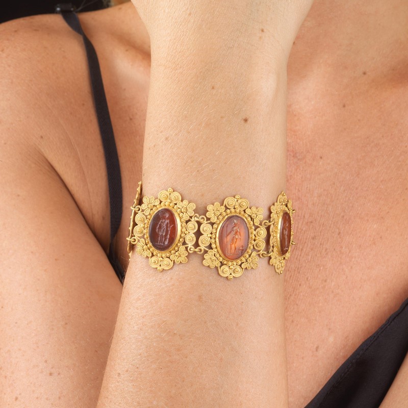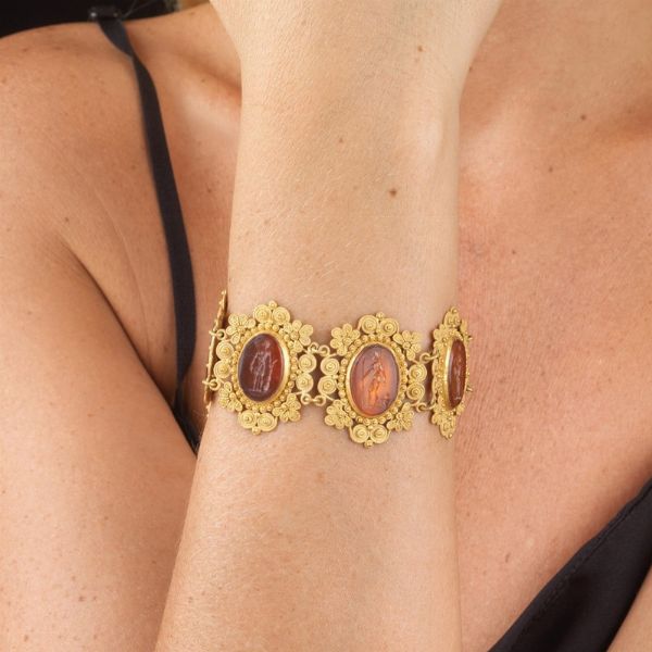 in oro giallo 18kt, composto da una serie di maglie a forma di tralci fioriti microgranulati e recanti al centro pietre incise con raffigurati uomini e donne dell'Età Classica, dim. cm 3x17, gr. 43