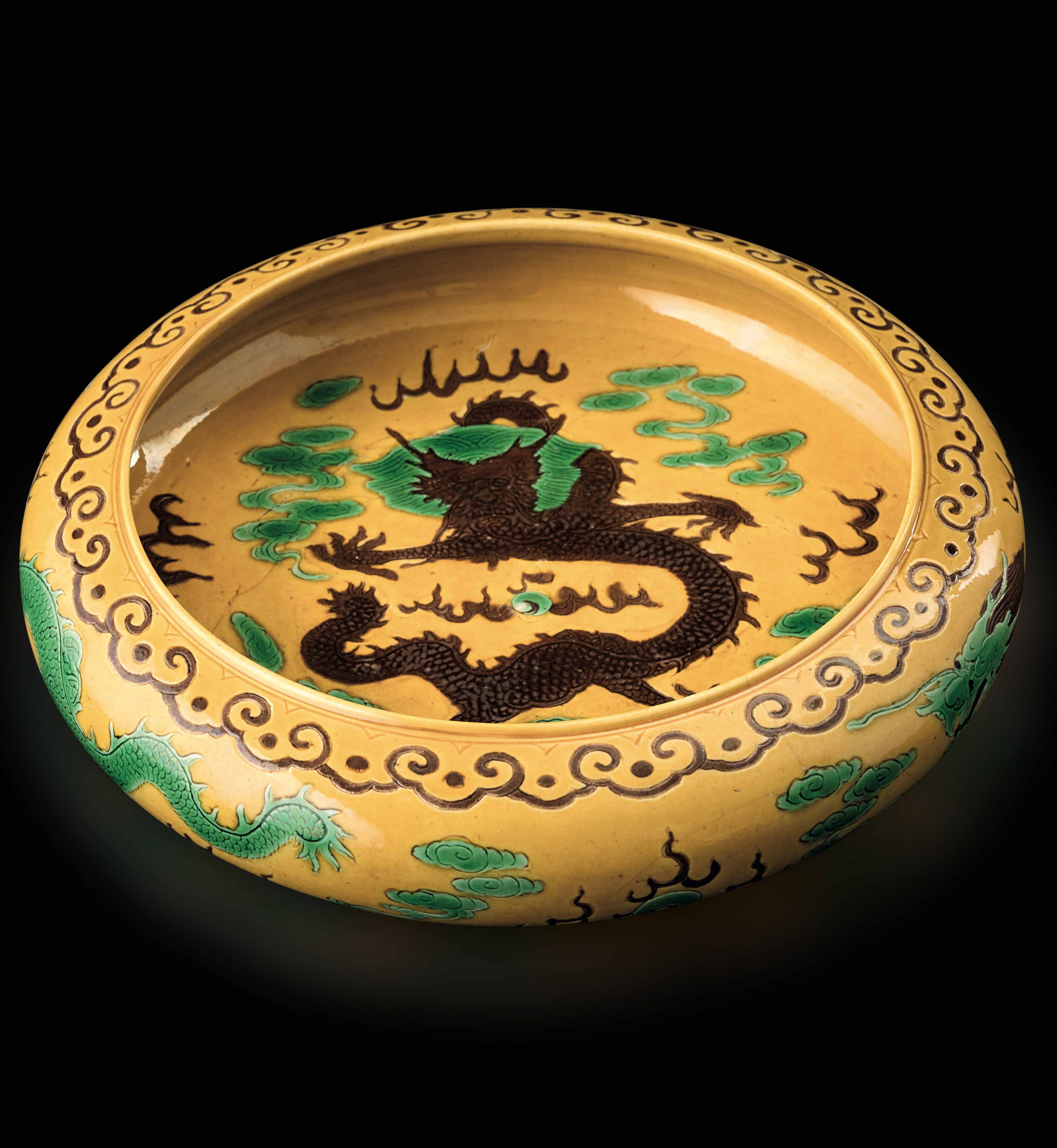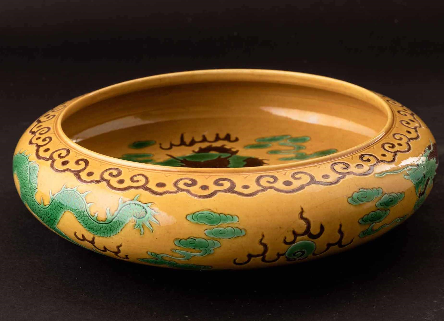 Ciotola in porcellana a smalti Sancai con figura centrale di drago tra le nuvole, [..]