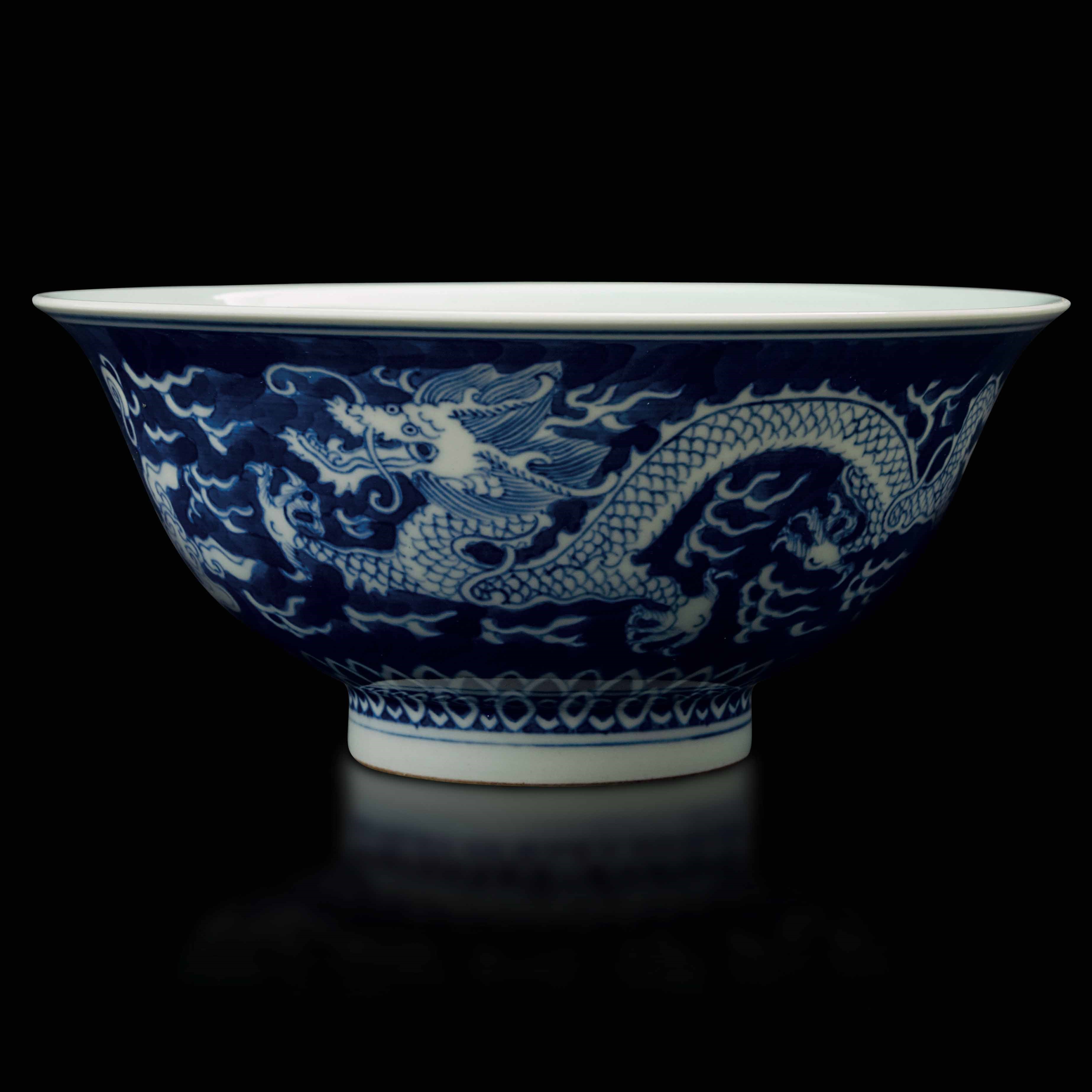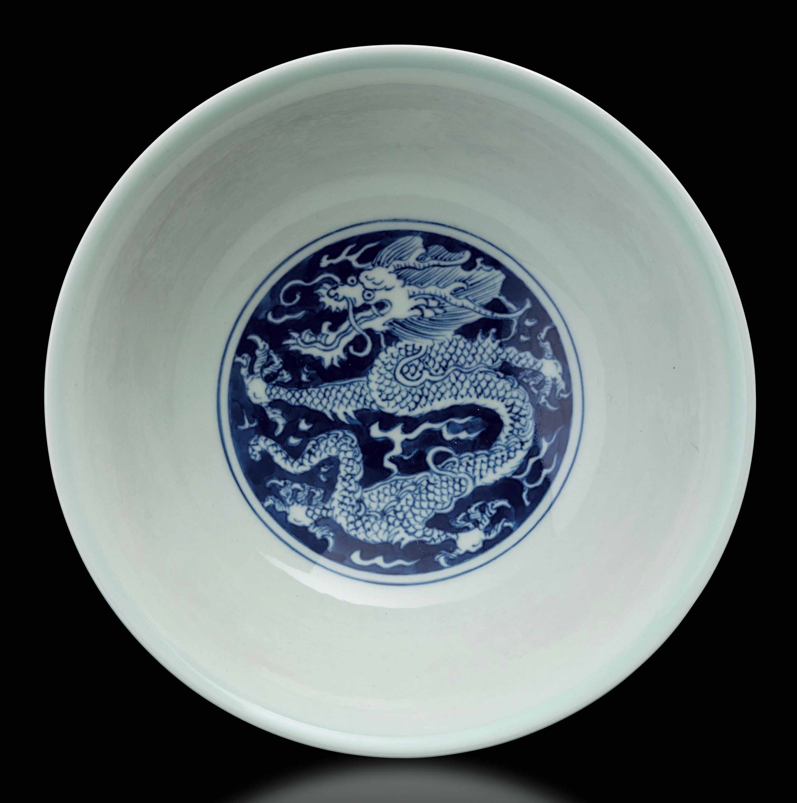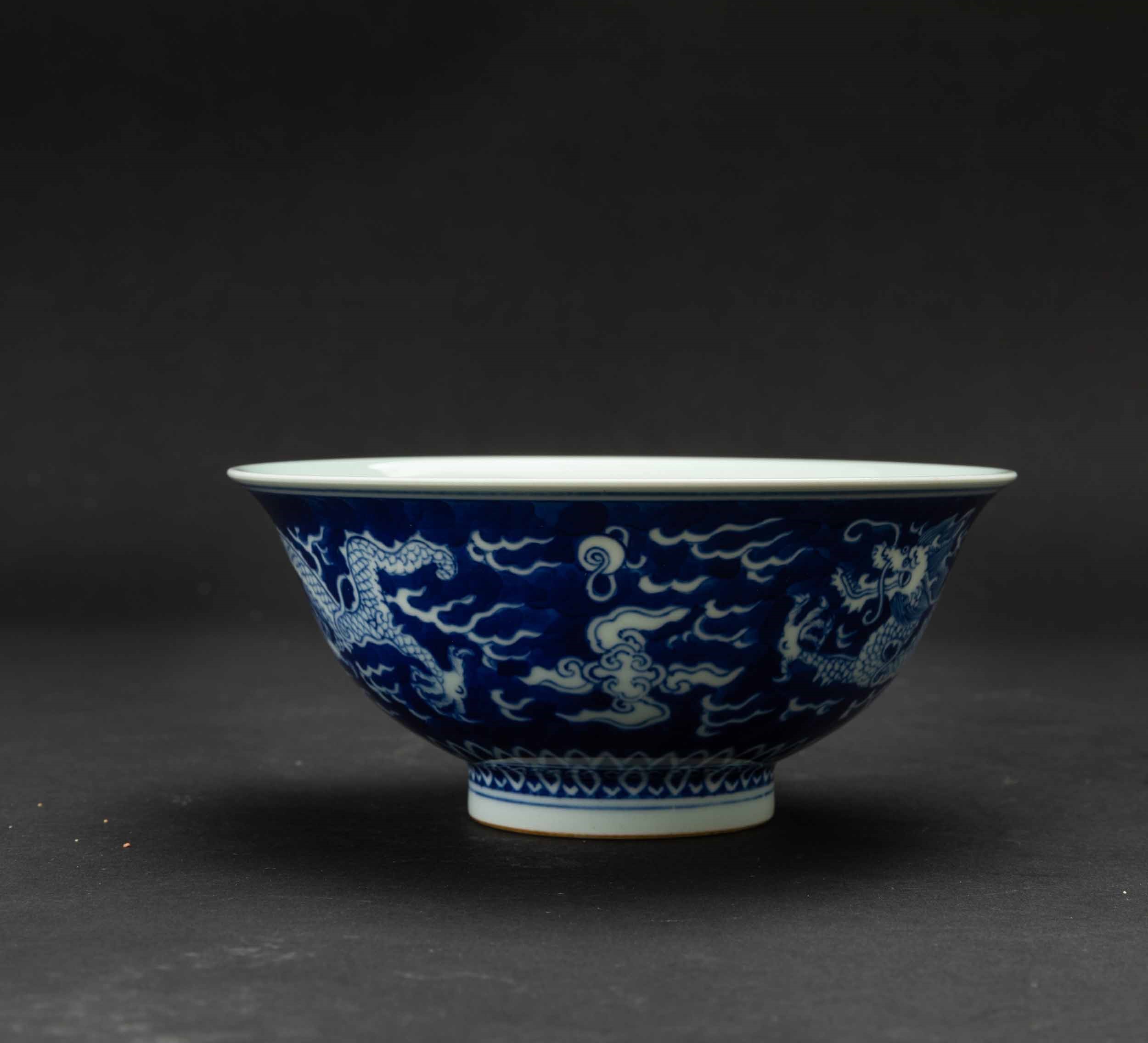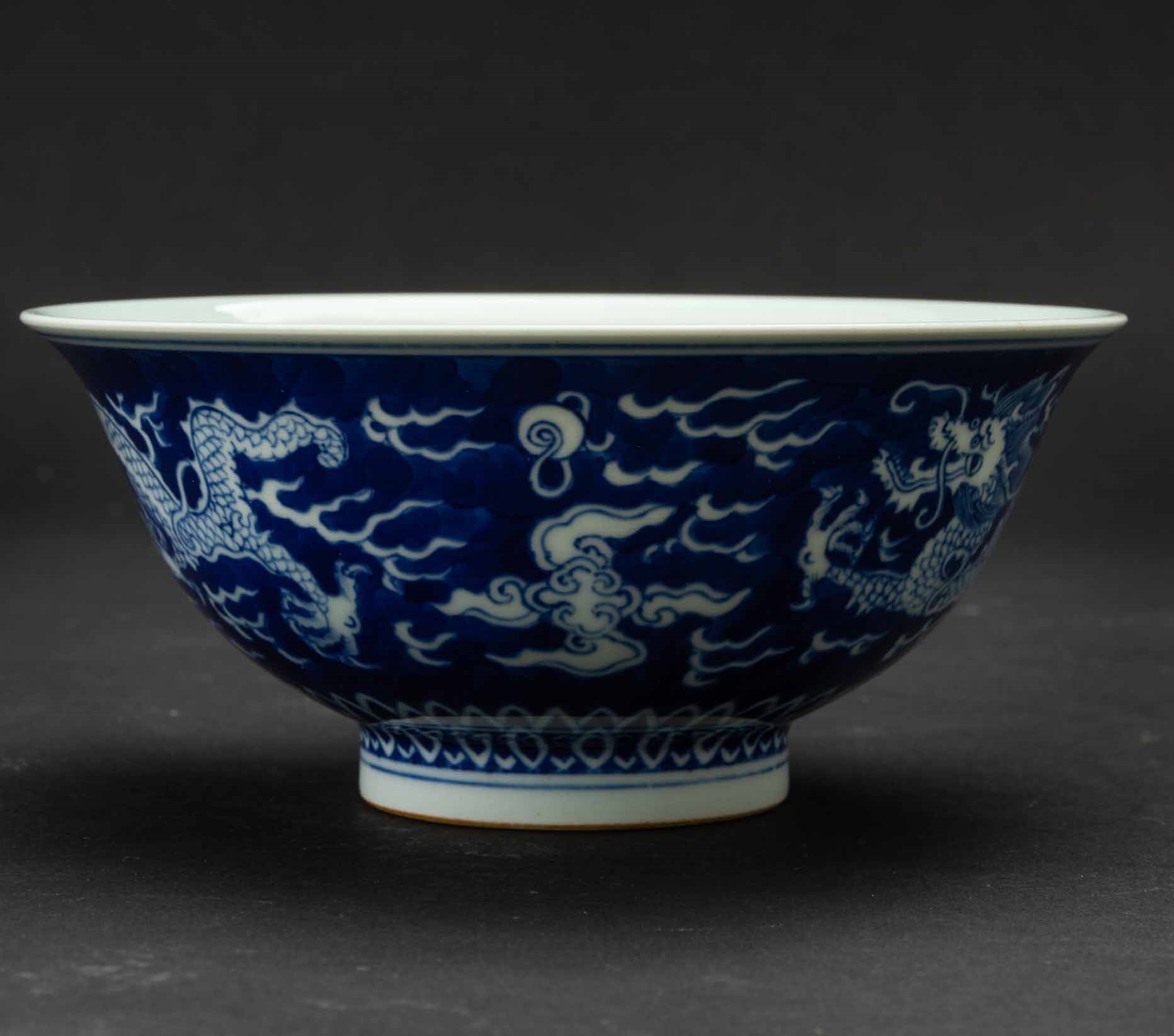 Ciotola in porcellana bianca e blu con figure di draghi tra le nuvole, Cina, Repubblica, [..]
