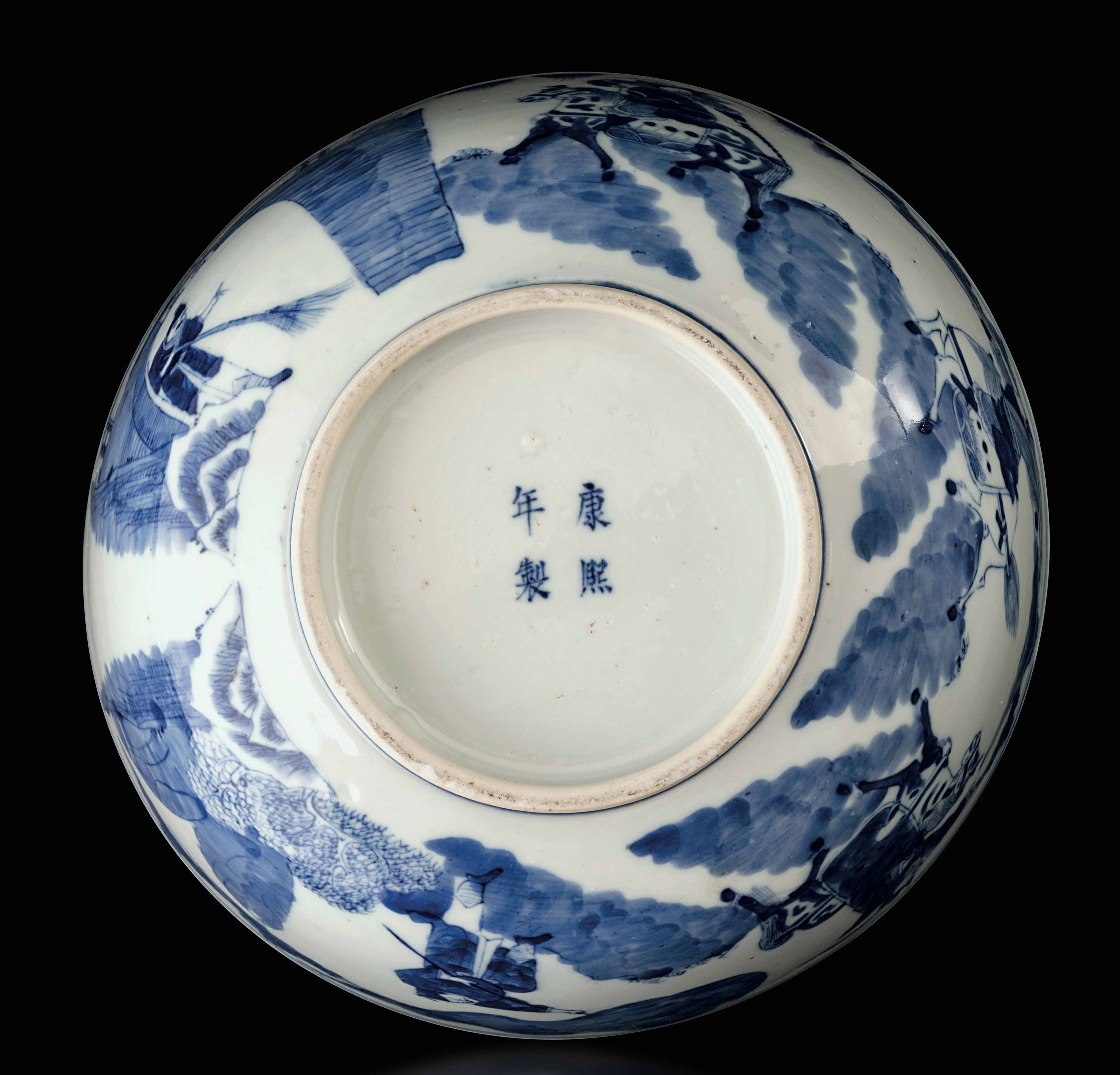 Ciotola in porcellana bianca e blu con scene di vita comune e figura centrale di [..]