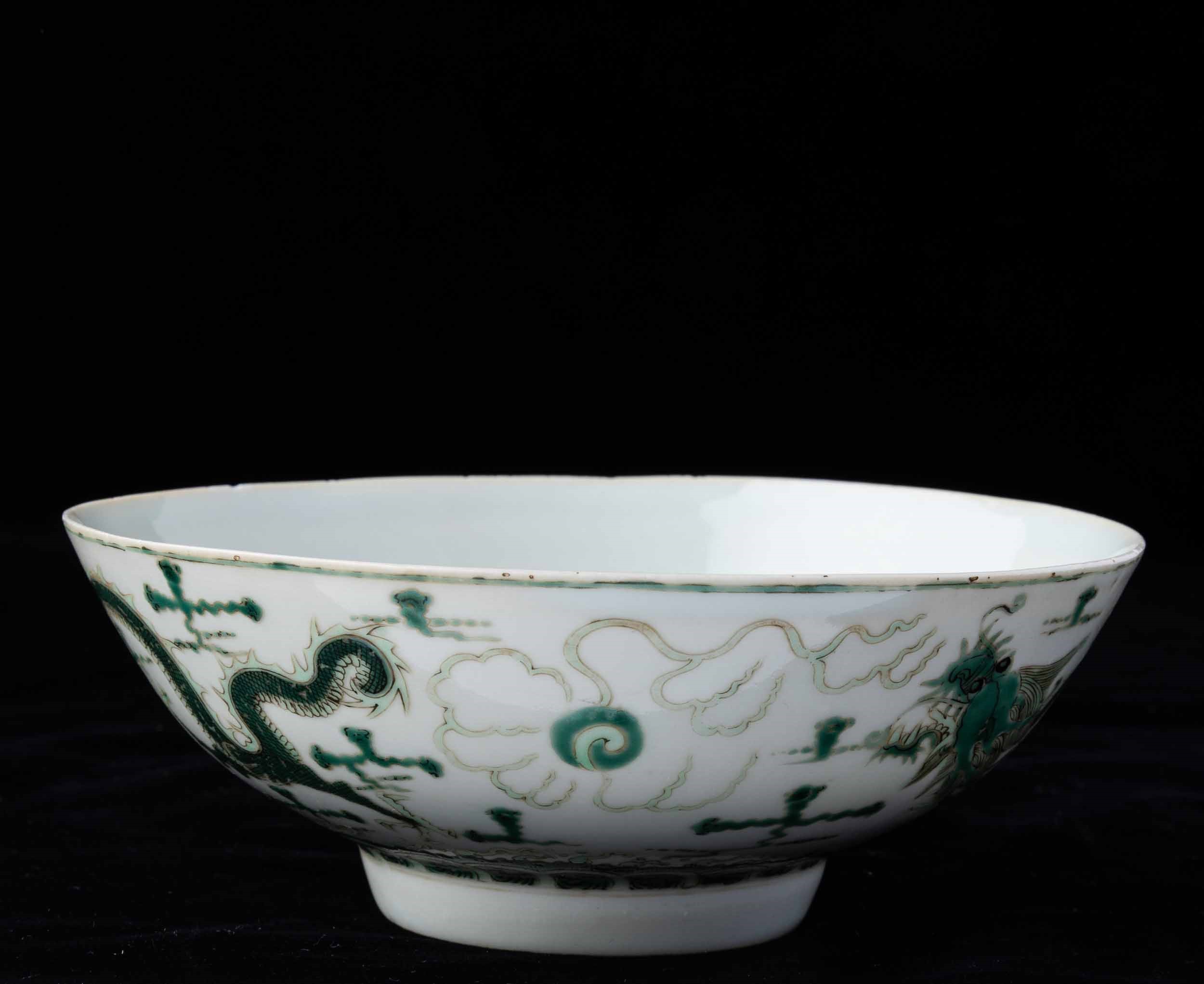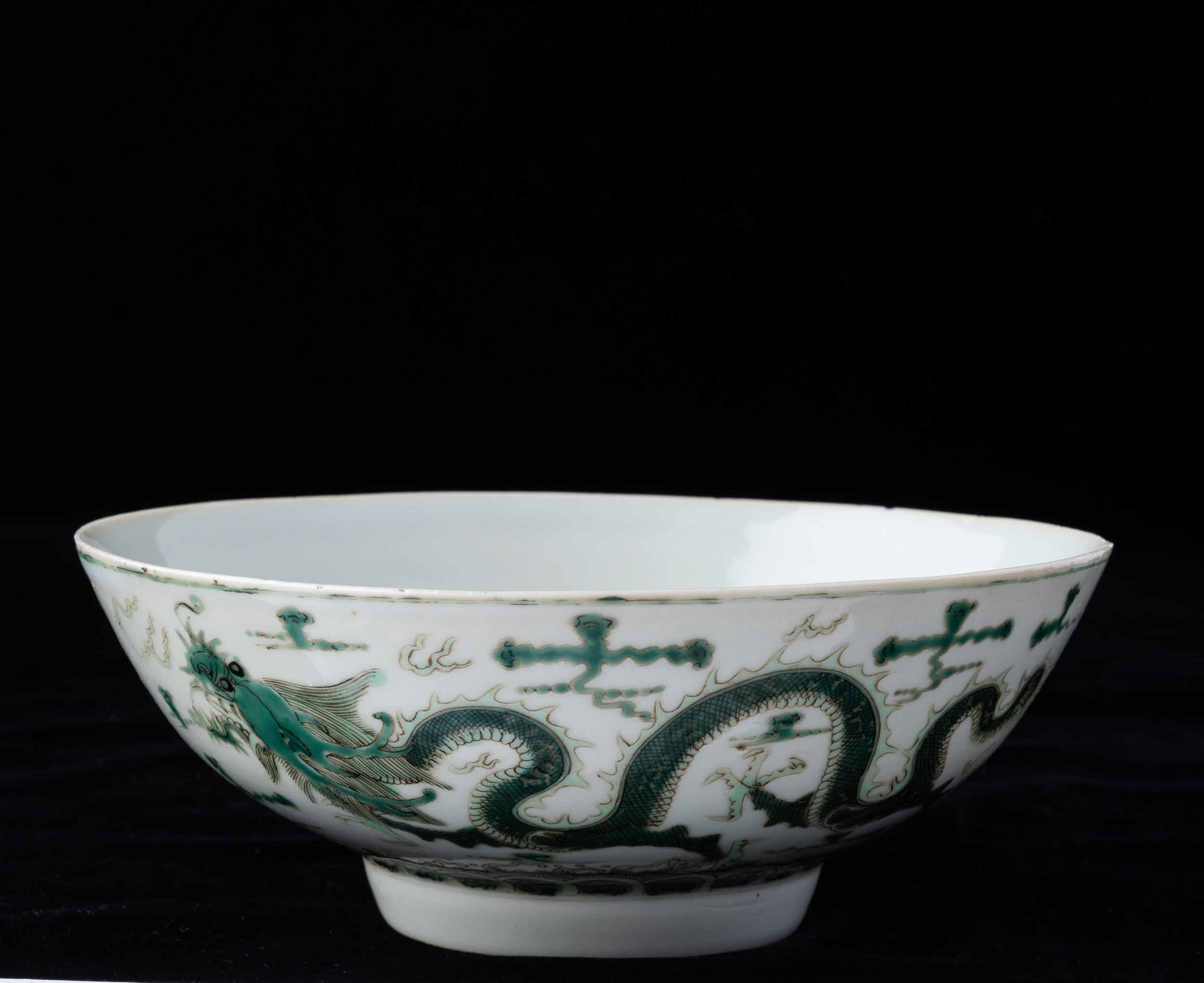 Ciotola in porcellana con figure di draghi tra le nuvole sui toni del verde, Cina, [..]
