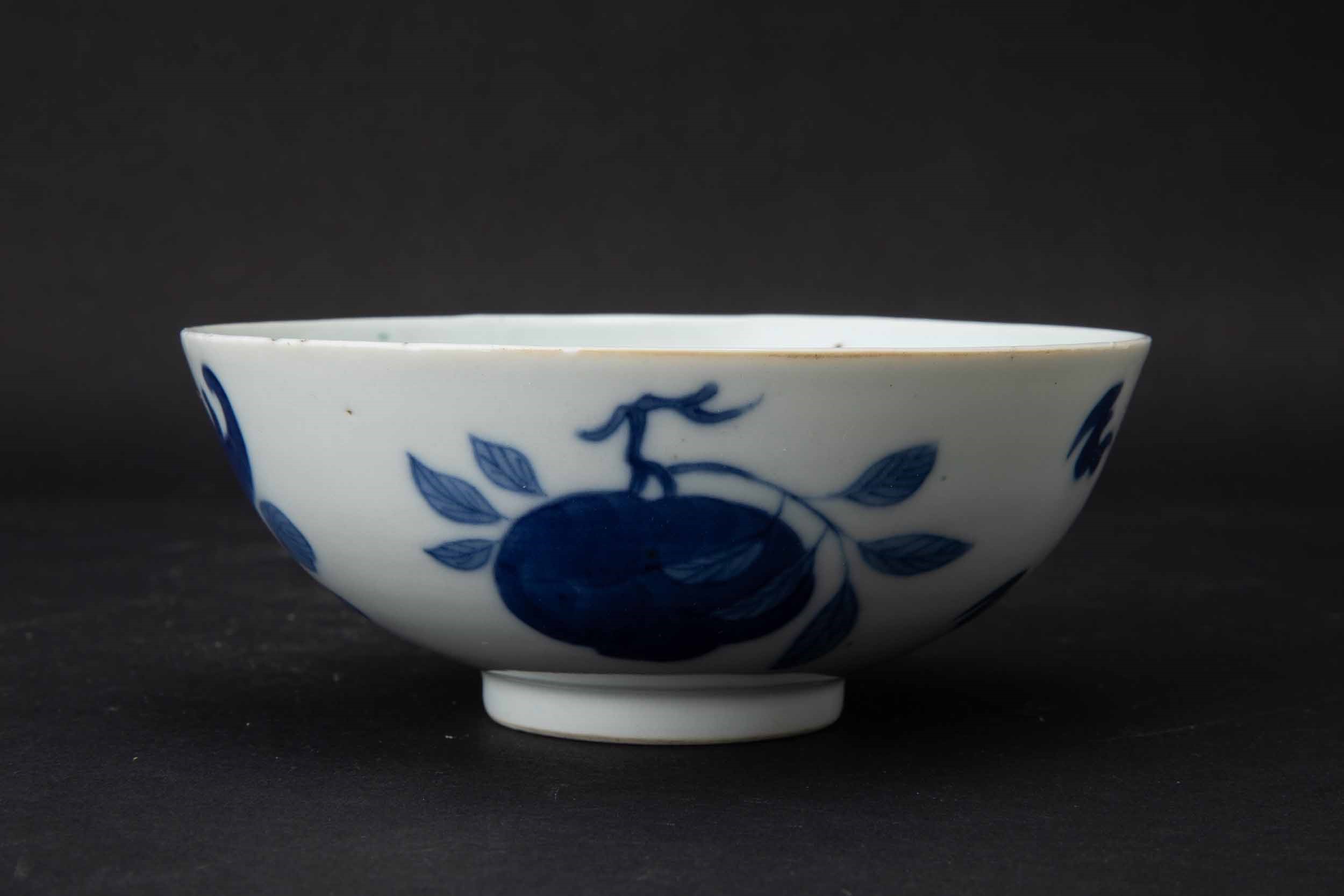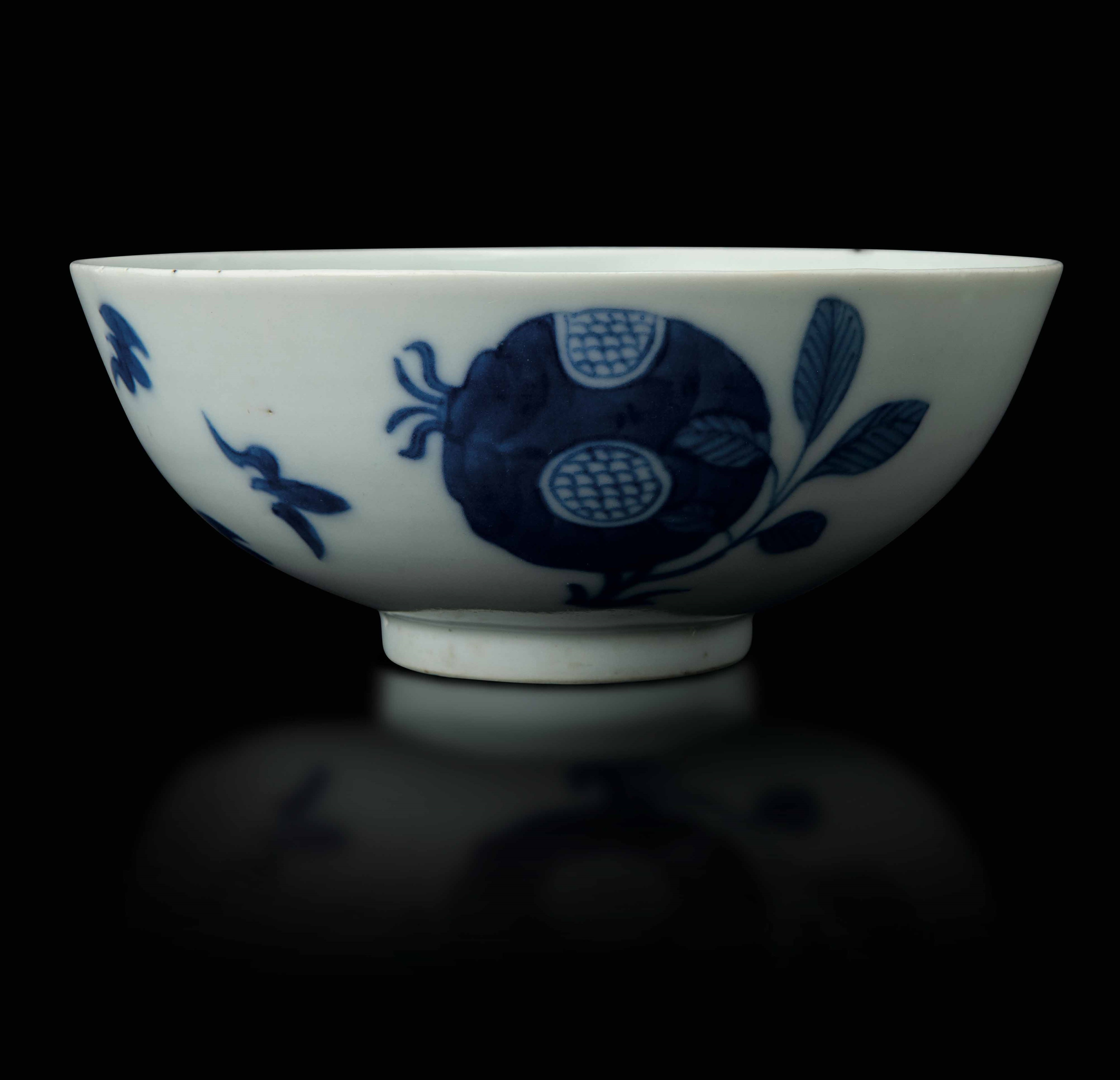 Ciotolina in porcellana bianca e blu con decori a melograno e simboli taoisti, Cina, [..]