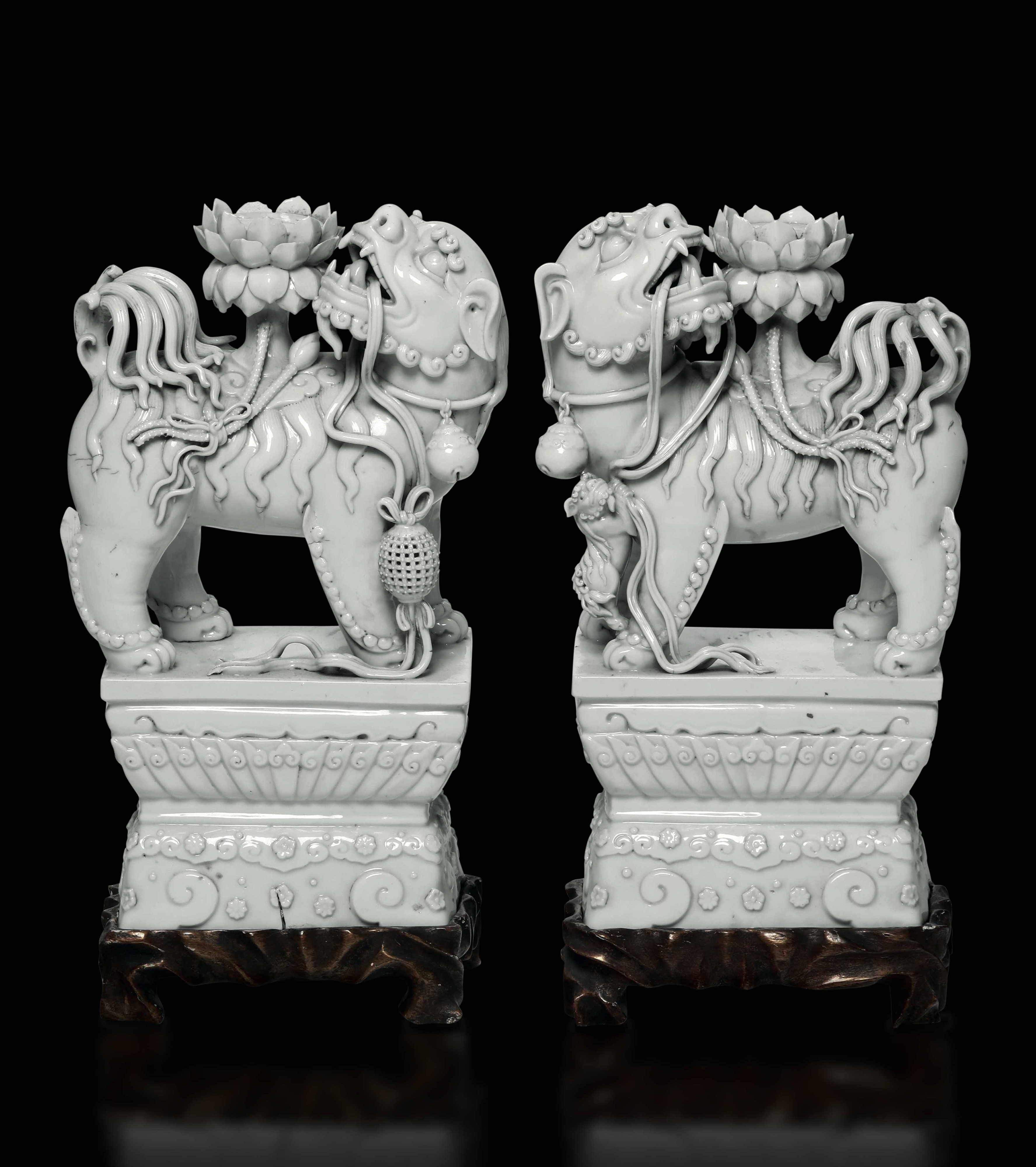 Coppia di candelieri a foggia di drago con fiori di loto in porcellana Blanc de [..]