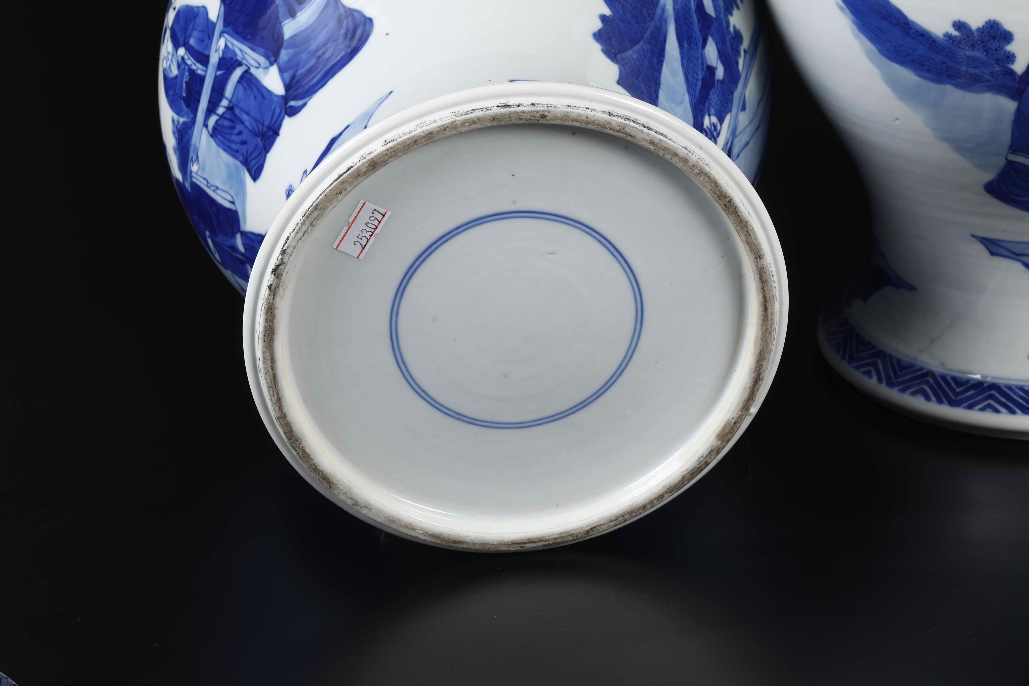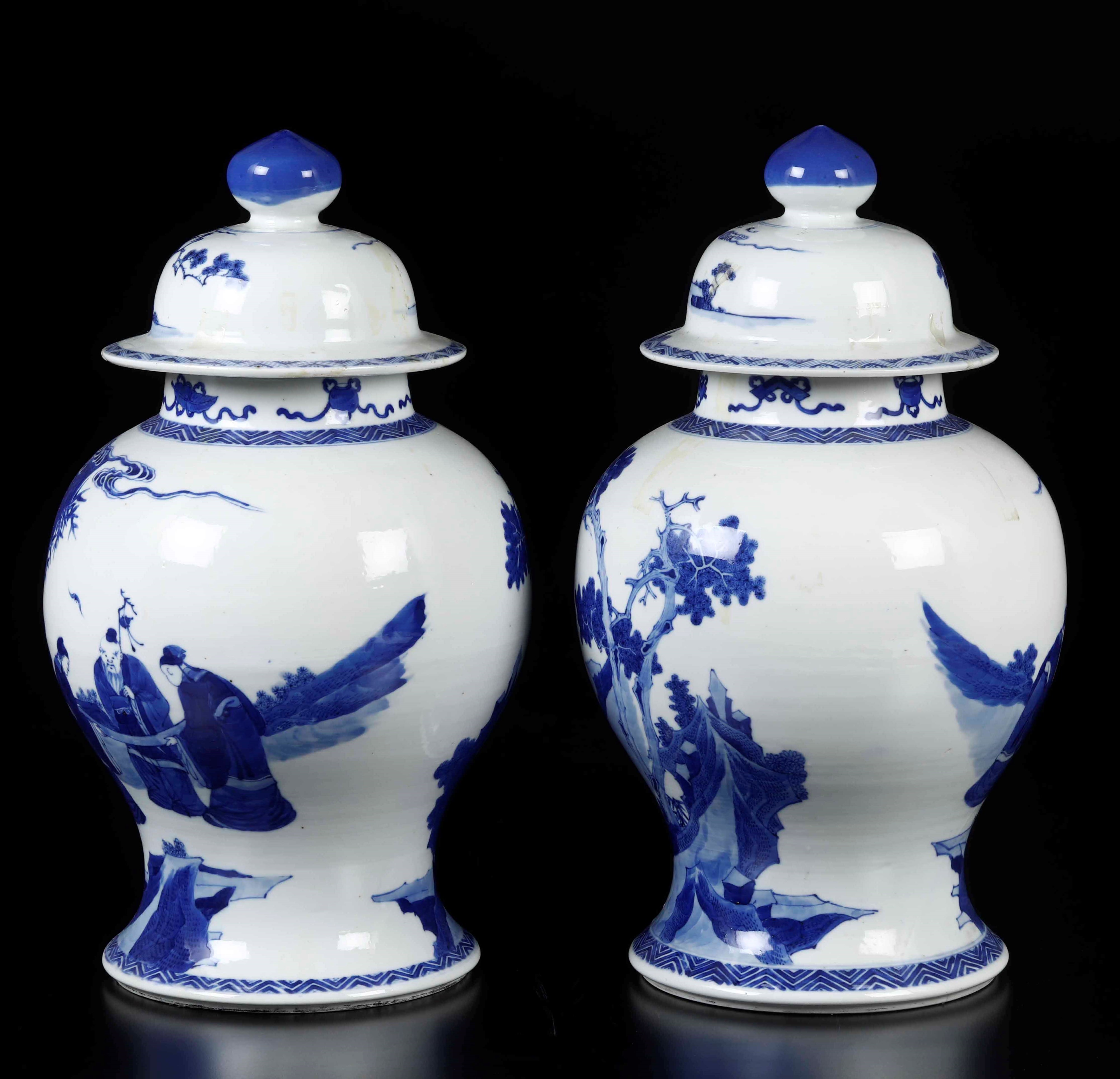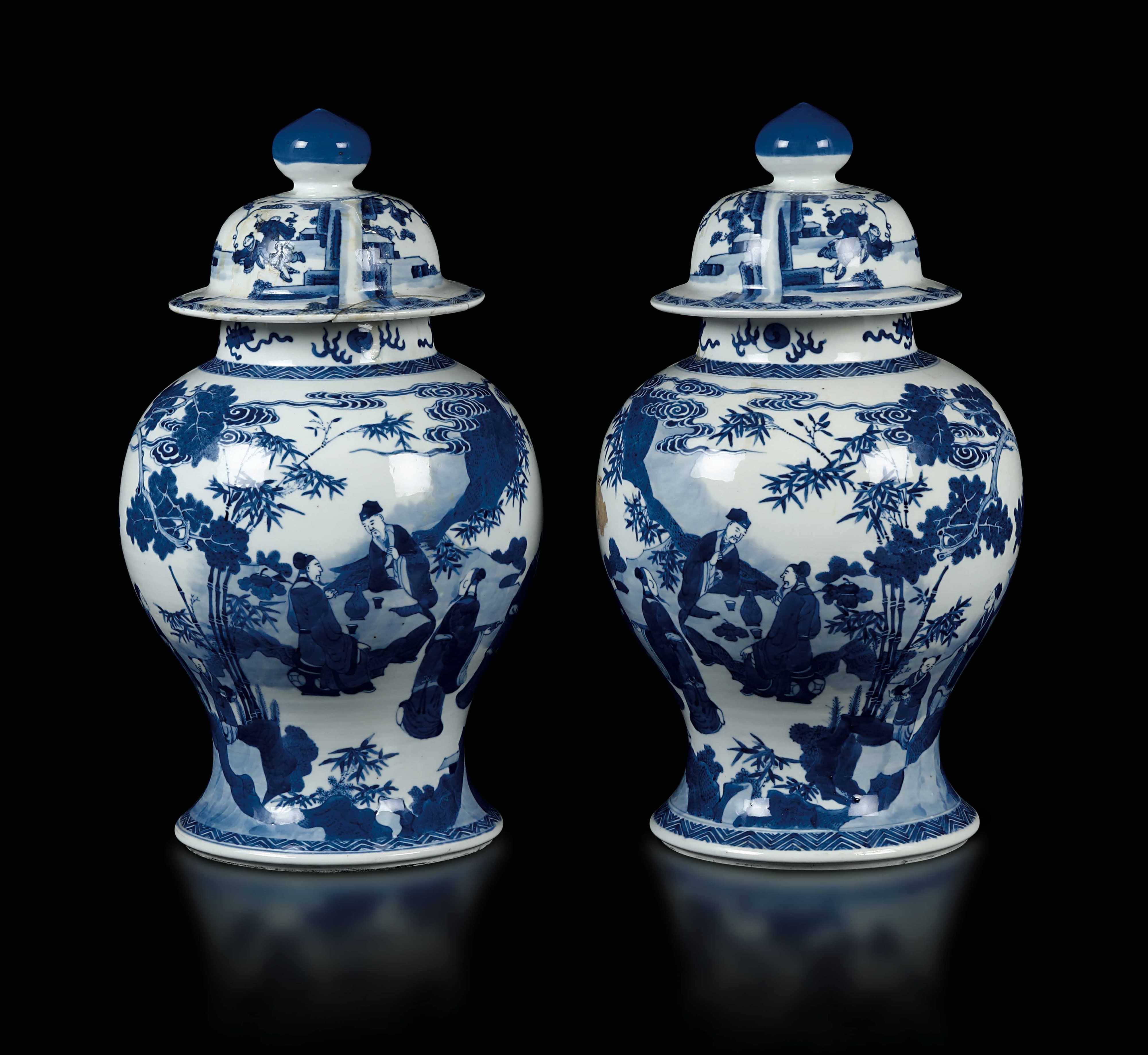 Coppia di potiches in porcellana bianca e blu con raffigurazione di saggi entro [..]