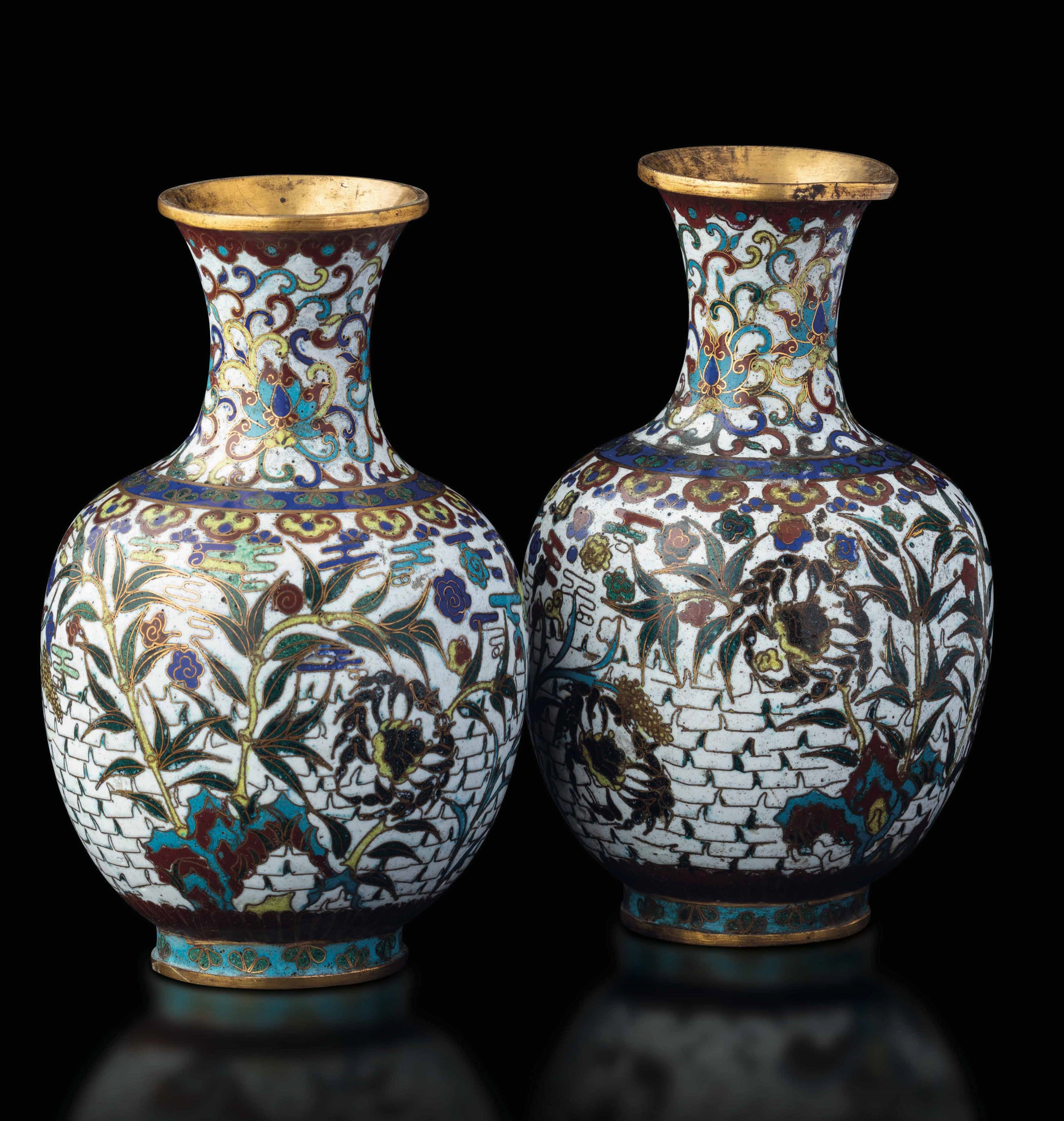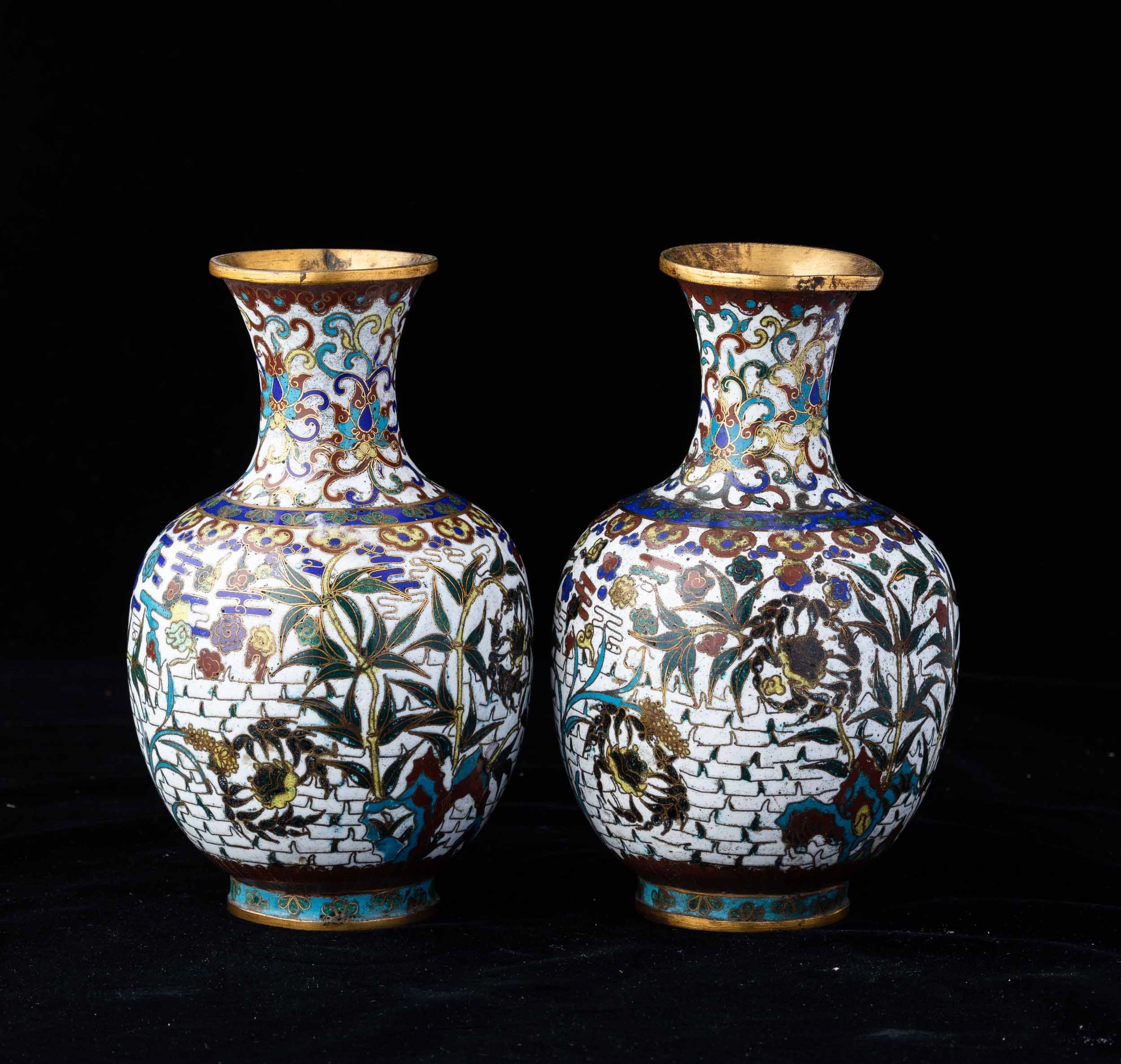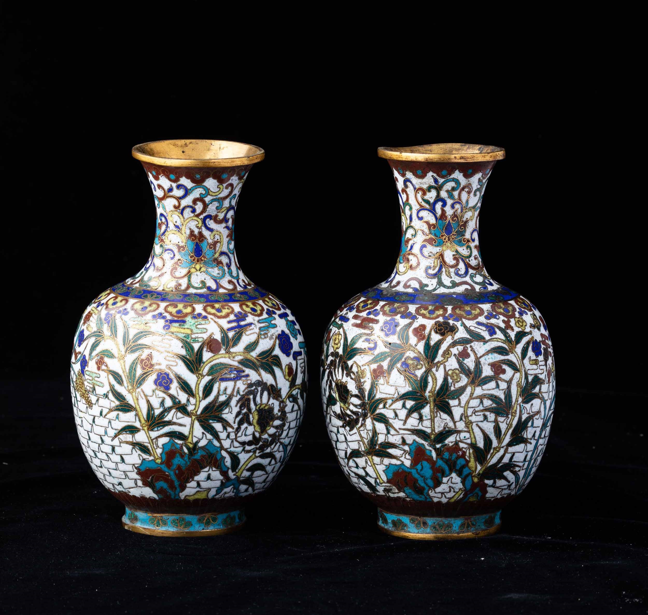 Coppia di vasi a smalti cloisonnè con decori vegetali e a fiore di loto su fondo [..]