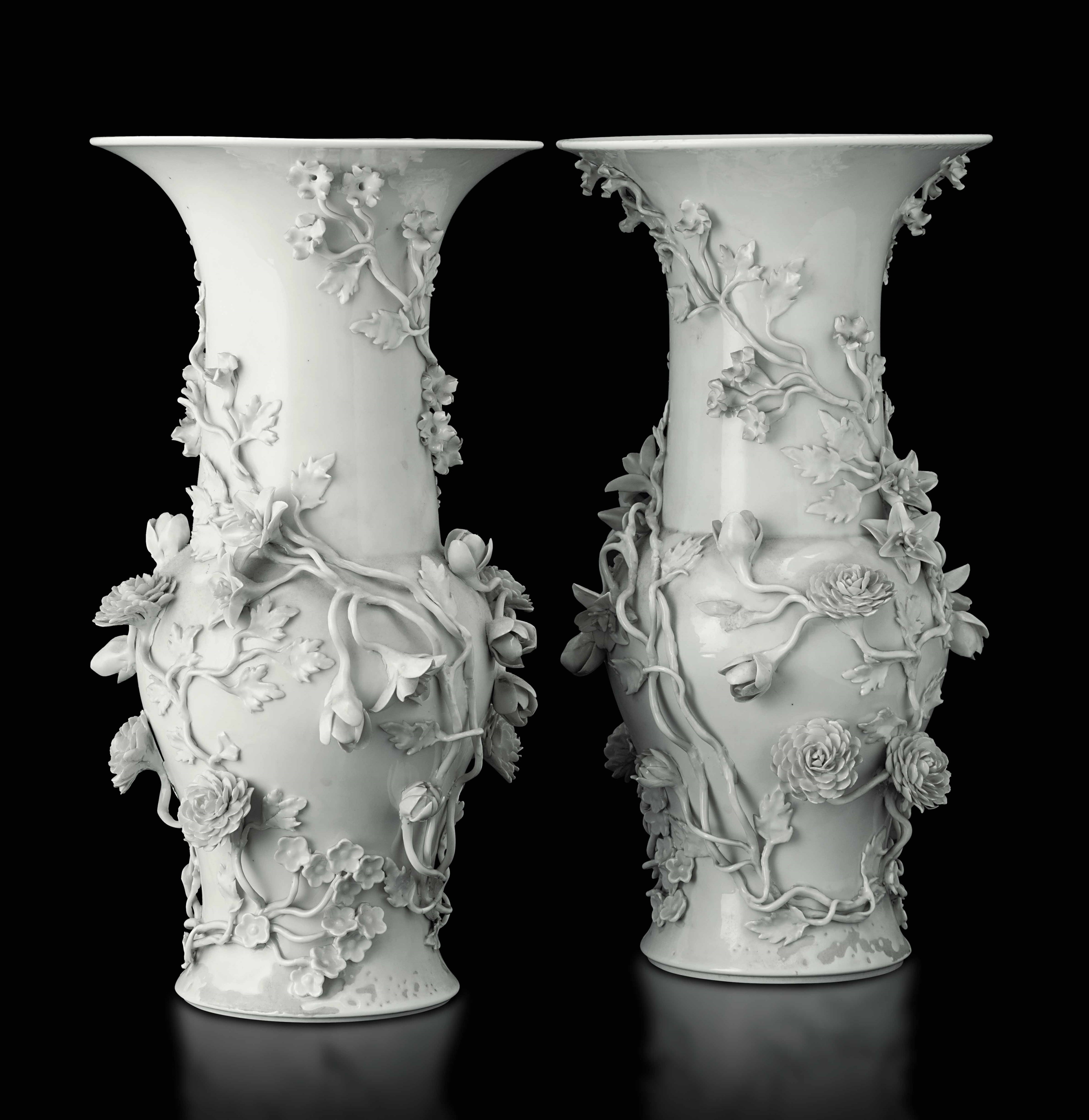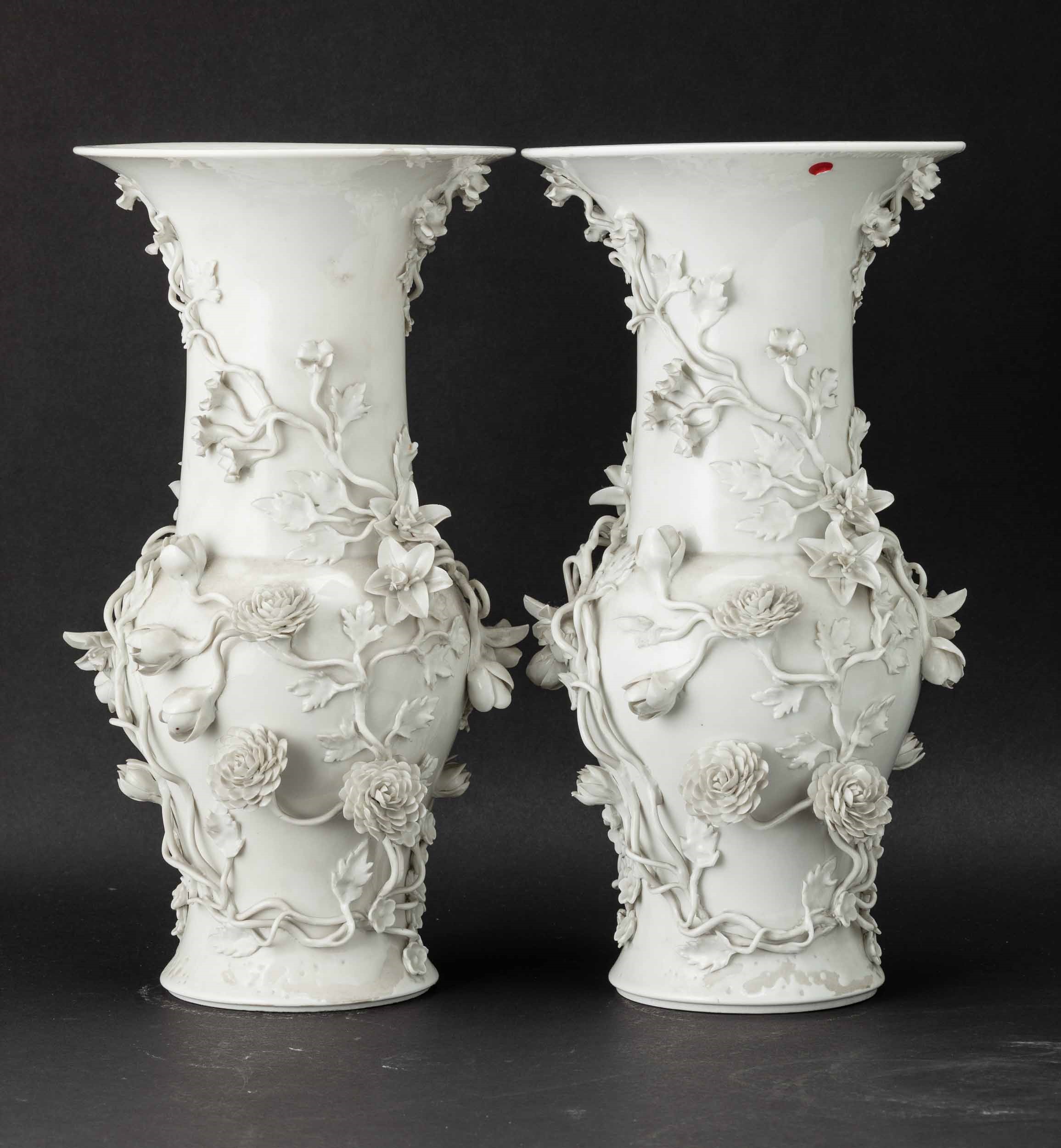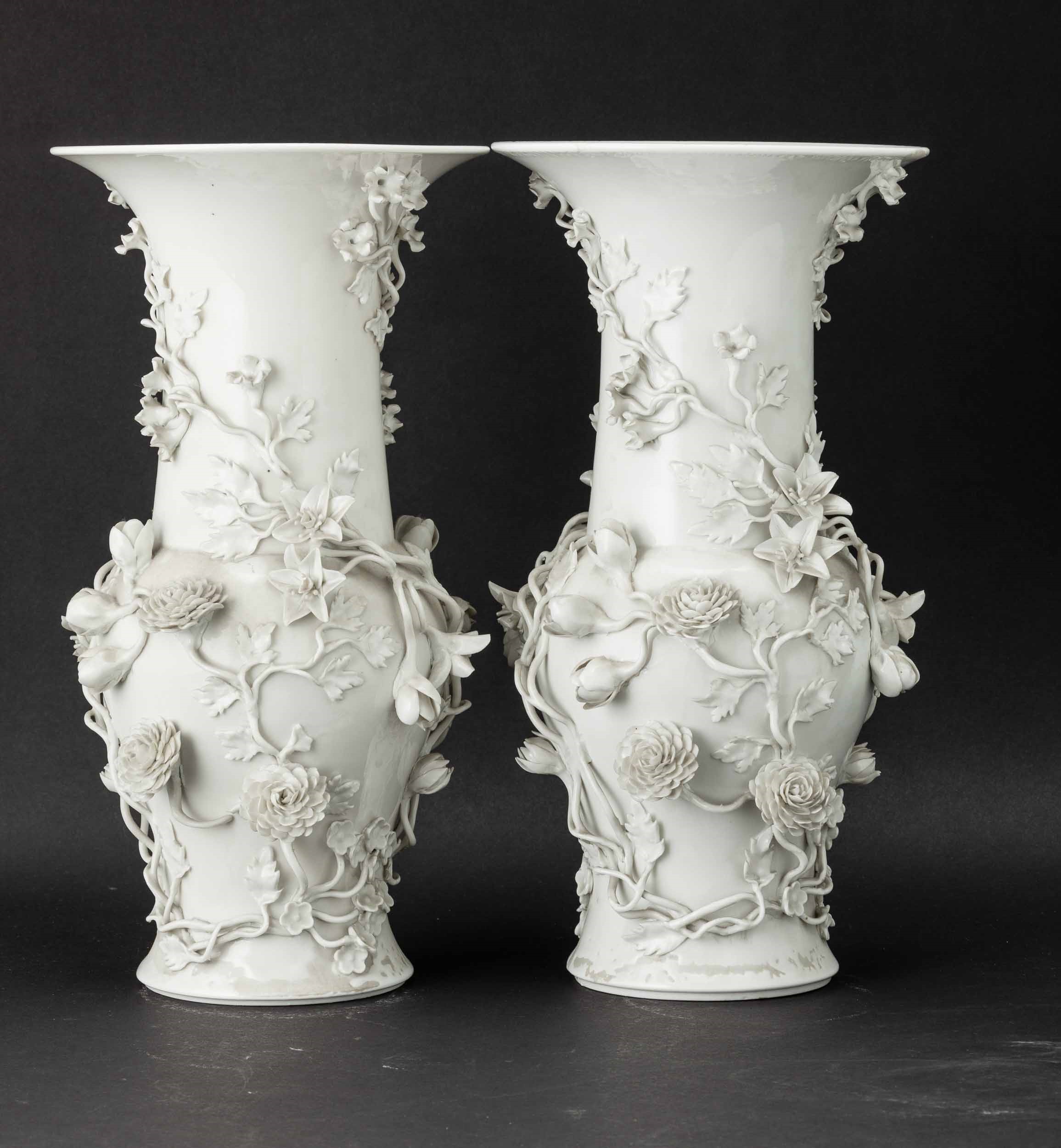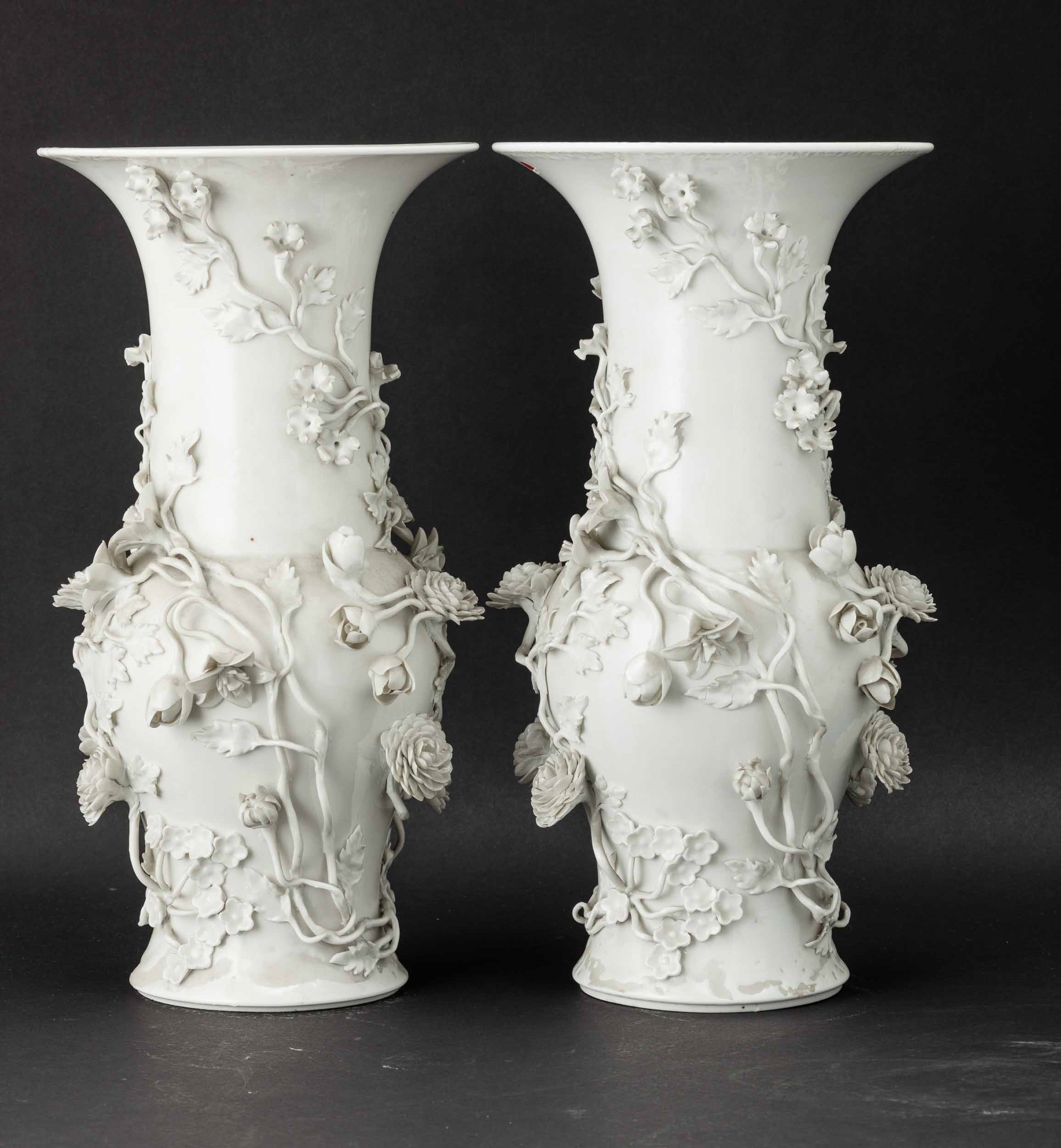 Coppia di vasi in porcellana Blanc de Chine con decori floreali a rilievo, Cina, [..]