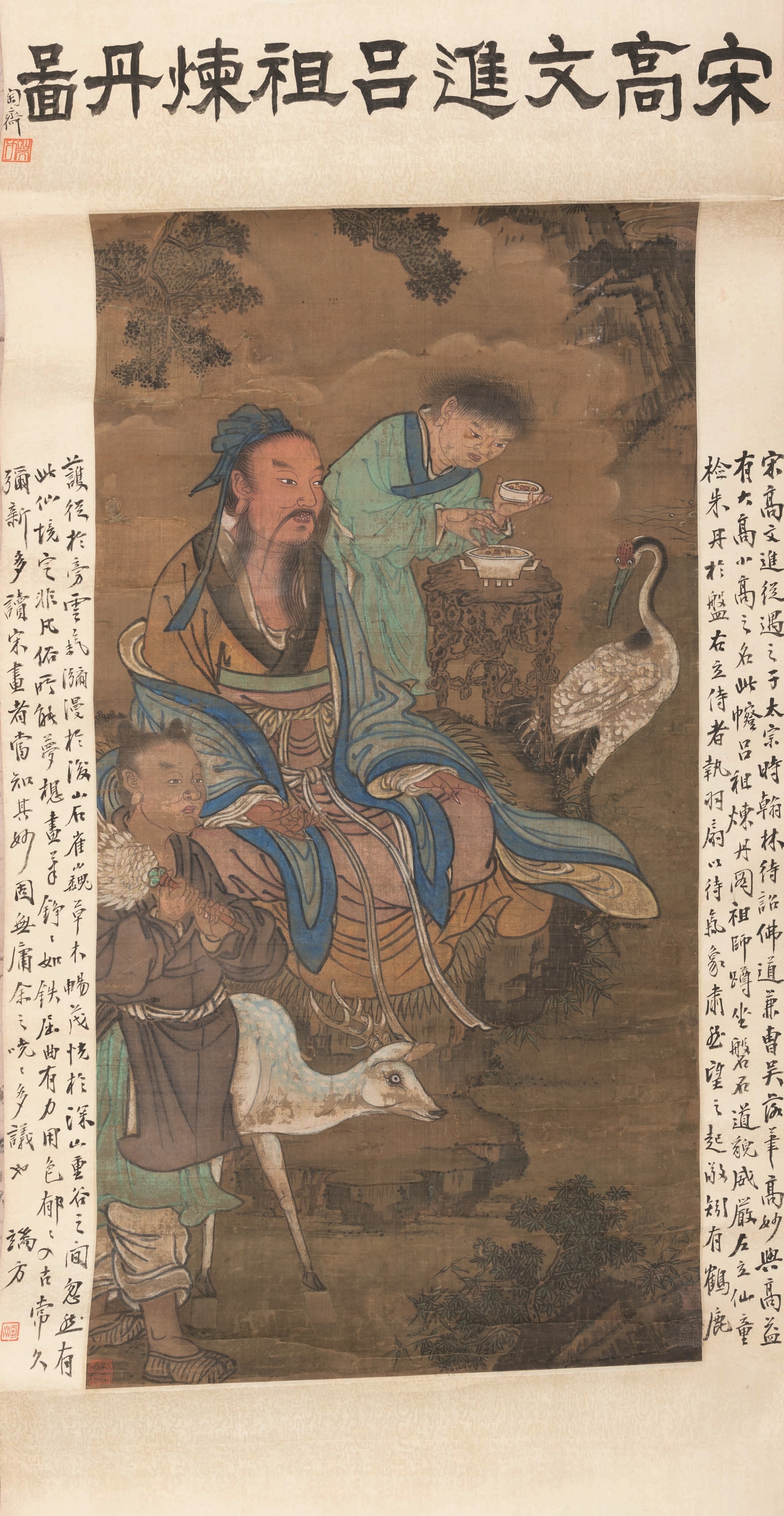 Dipinto su seta raffigurante saggio con discepoli entro paesaggio e iscrizioni, [..]