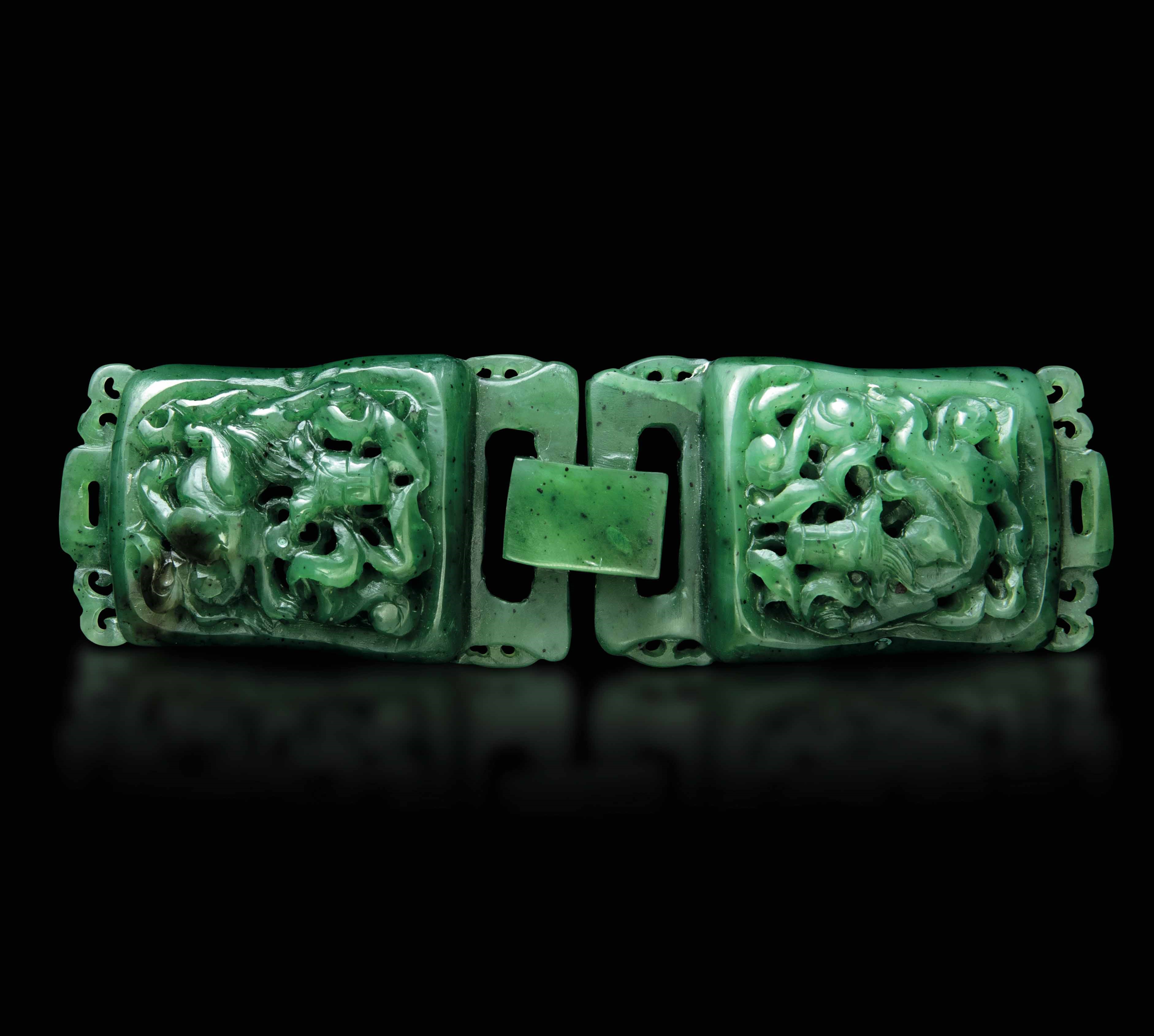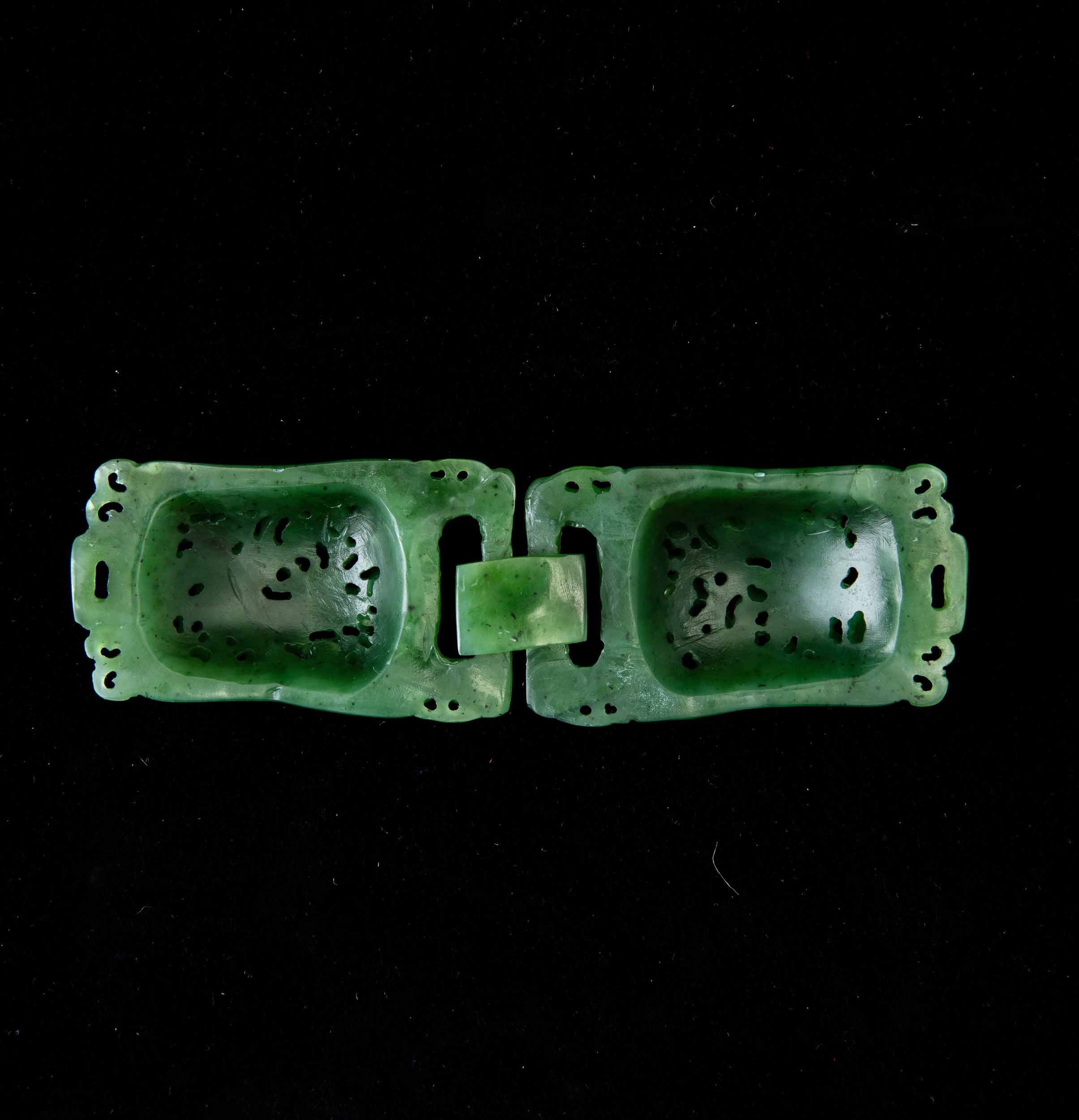 Fibbia scolpita in giada verde spinacio con decoro di draghi a traforo e a rilievo, [..]