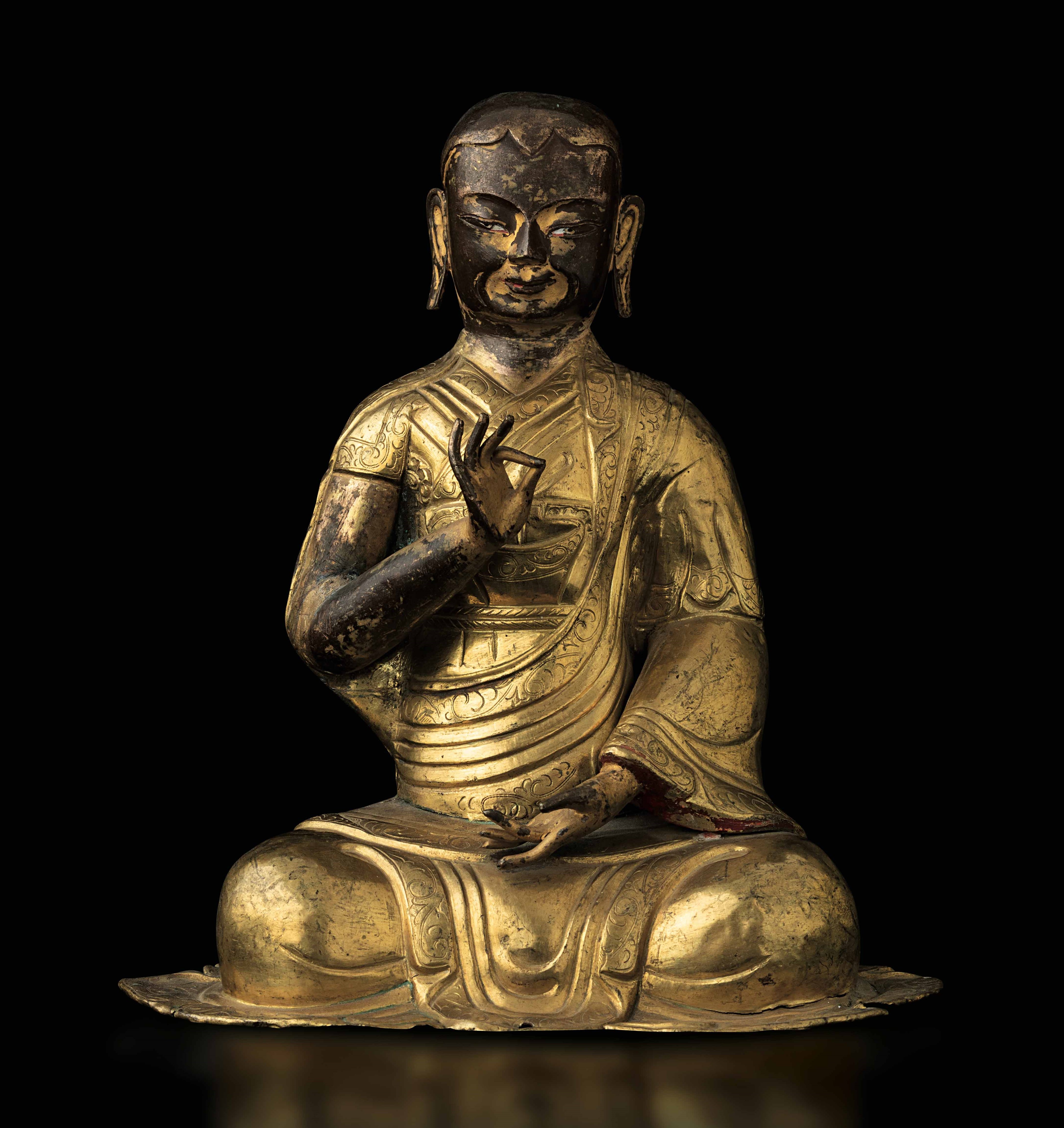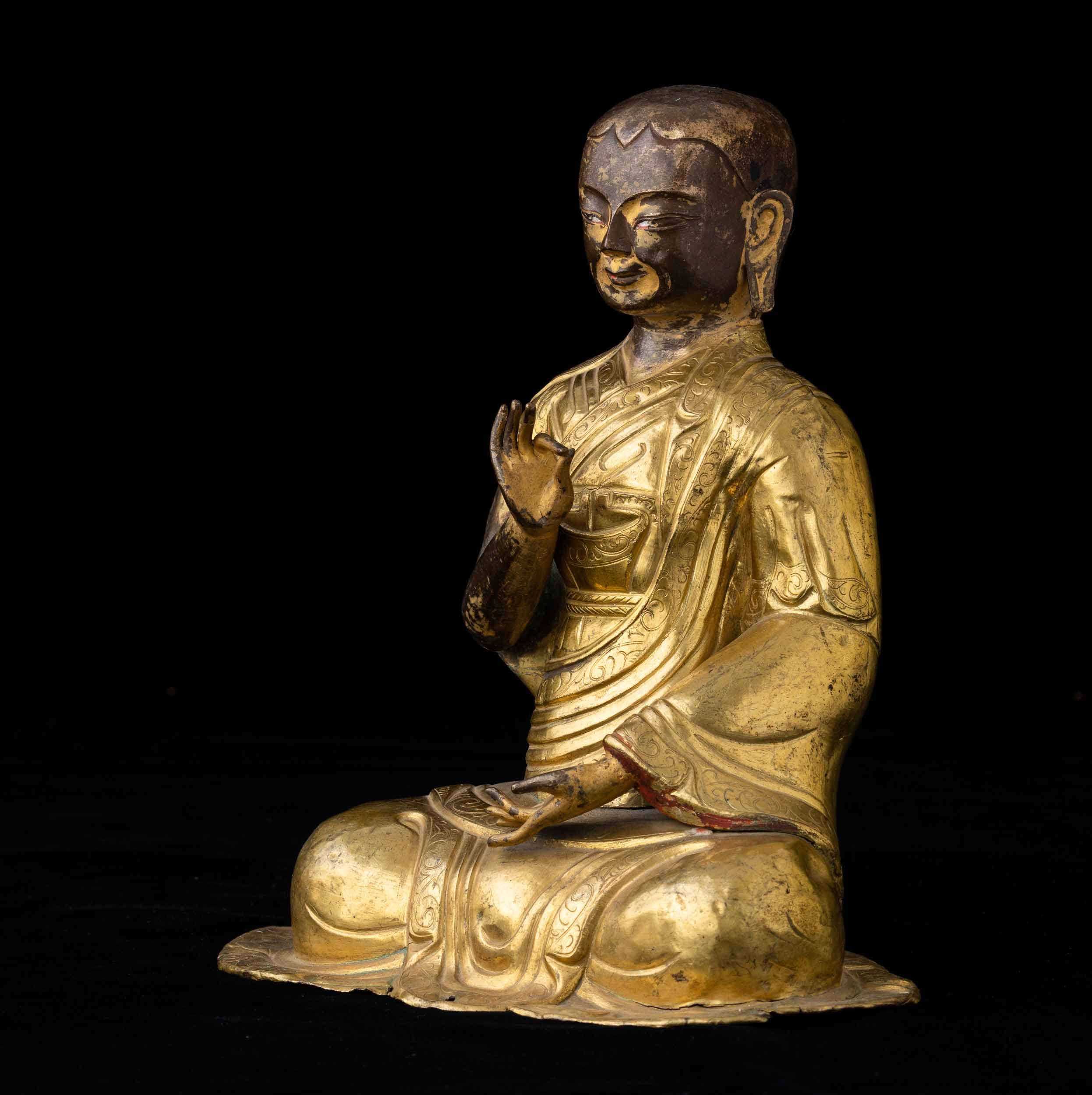 Figura di monaco in rame parzialmente dorato con tracce di policromia, Tibet, XVIII [..]