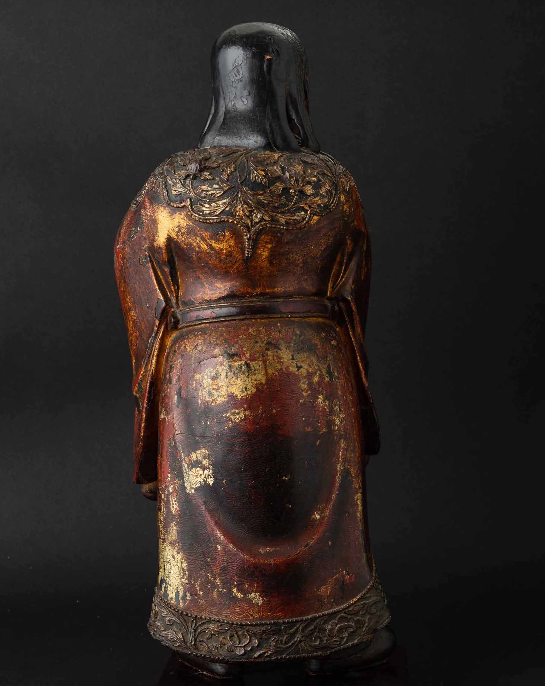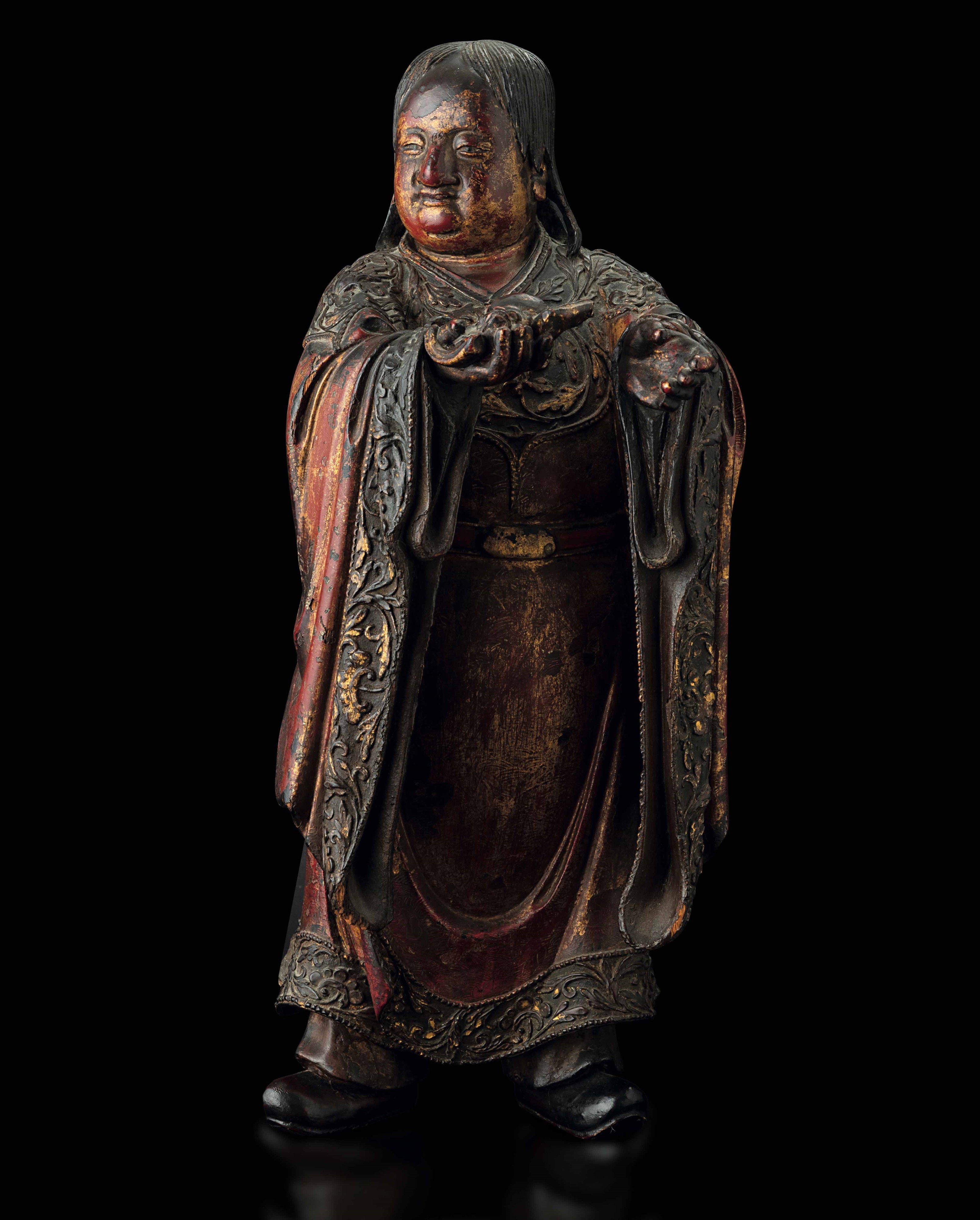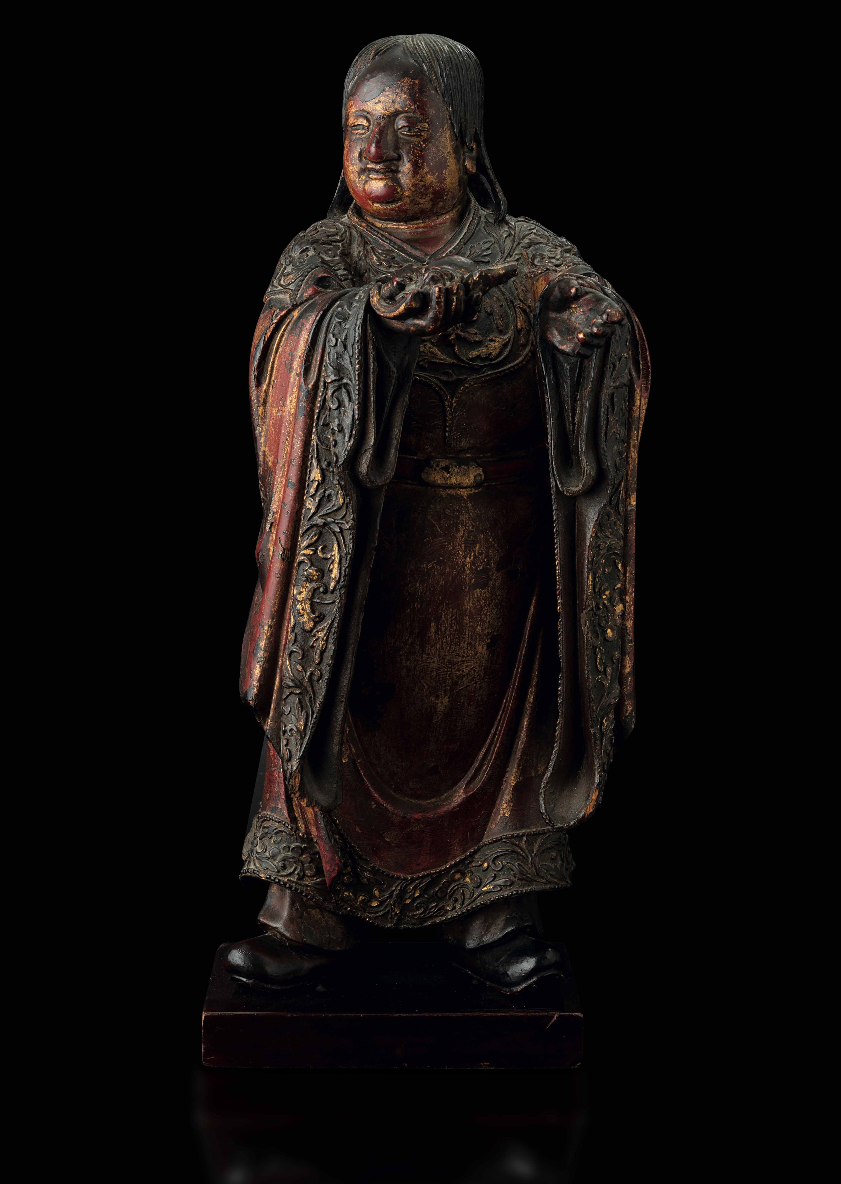 Figura di personaggio con frutti in legno laccato e parzialmente dorato, Cina, Dinastia [..]