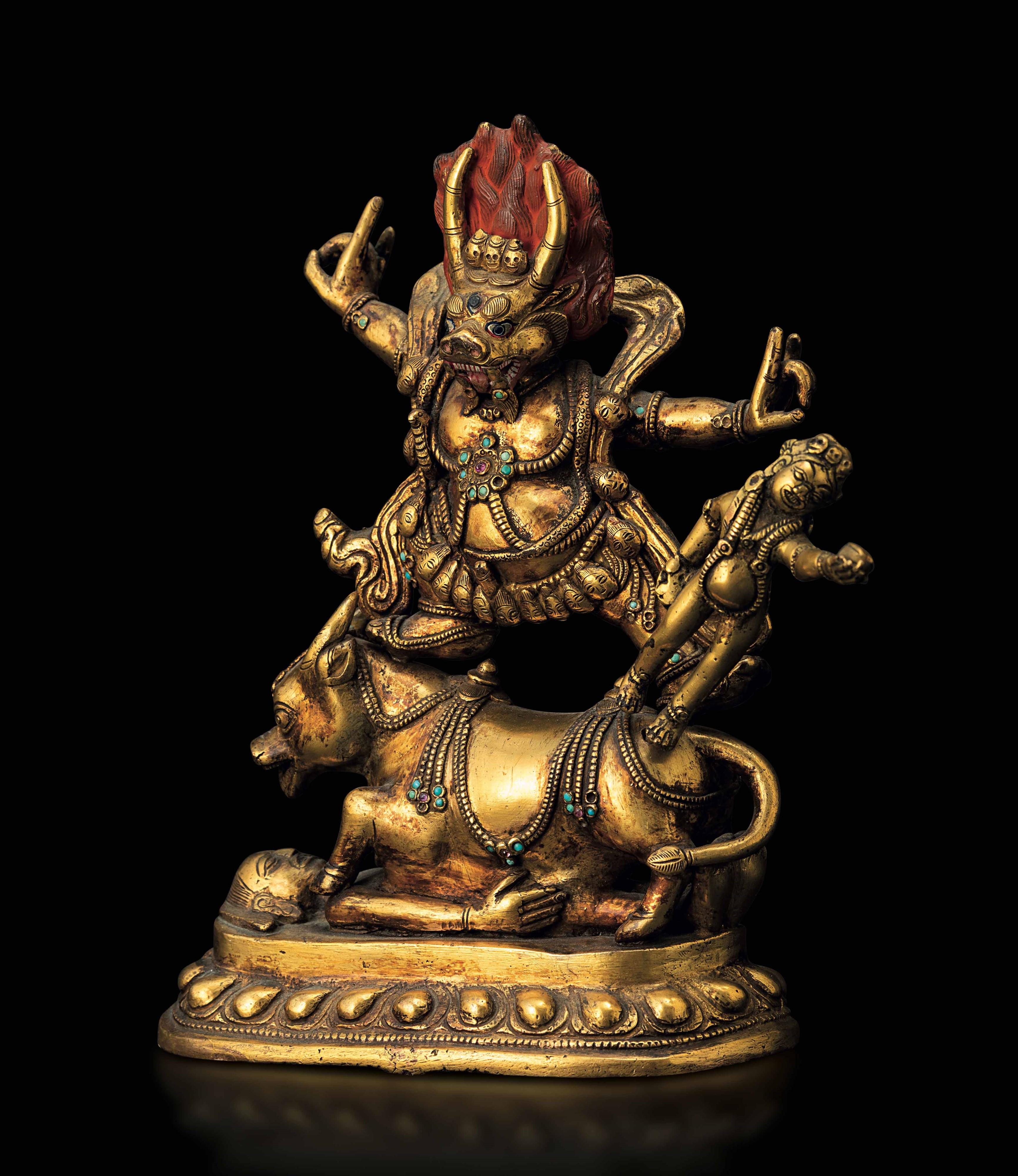 Figura di Yama Lord of Hell in bronzo dorato con tracce di policromia e innesti [..]