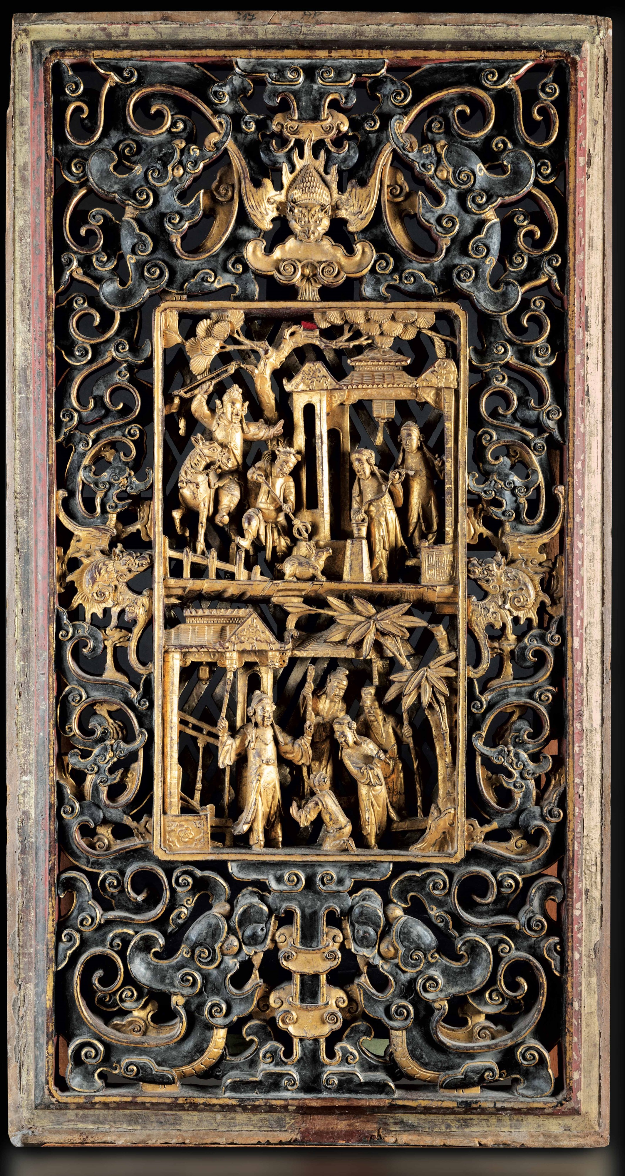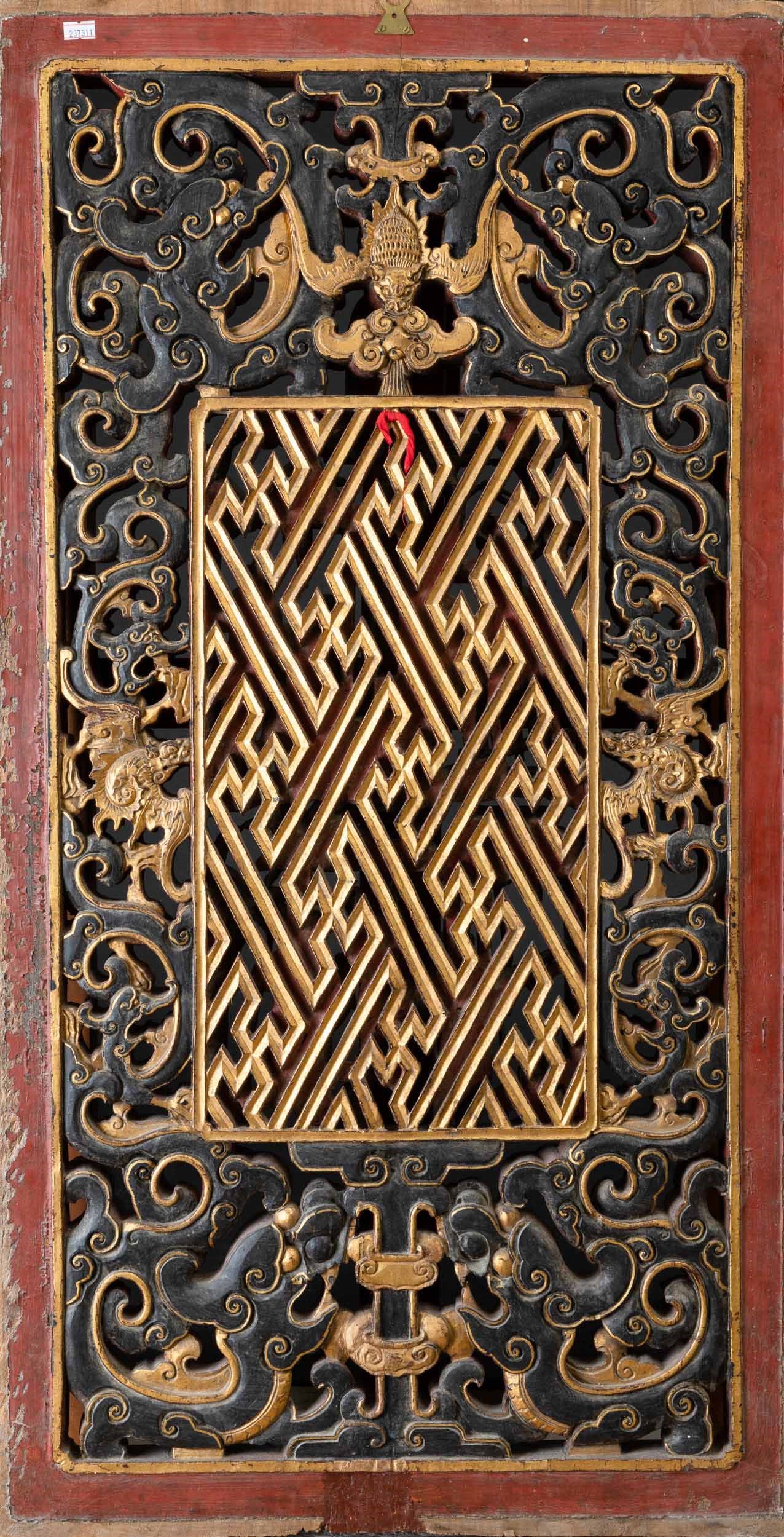Fregio scolpito in legno laccato e dorato raffigurante cavalieri e figure di pipistrelli, [..]