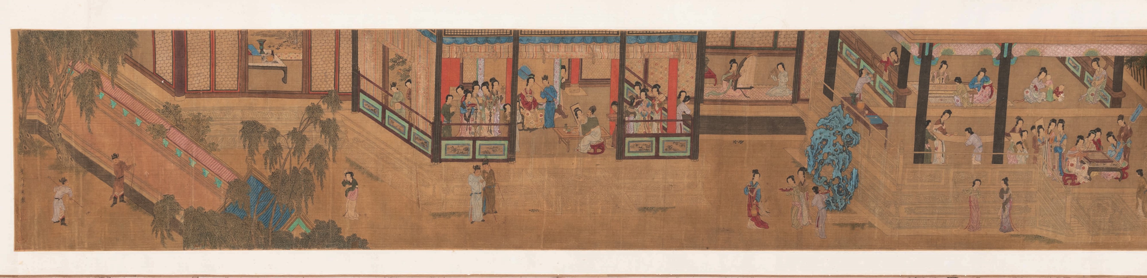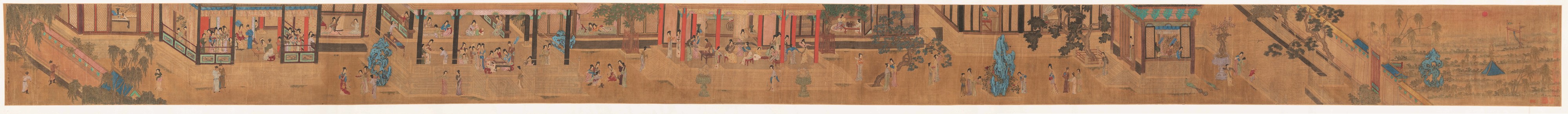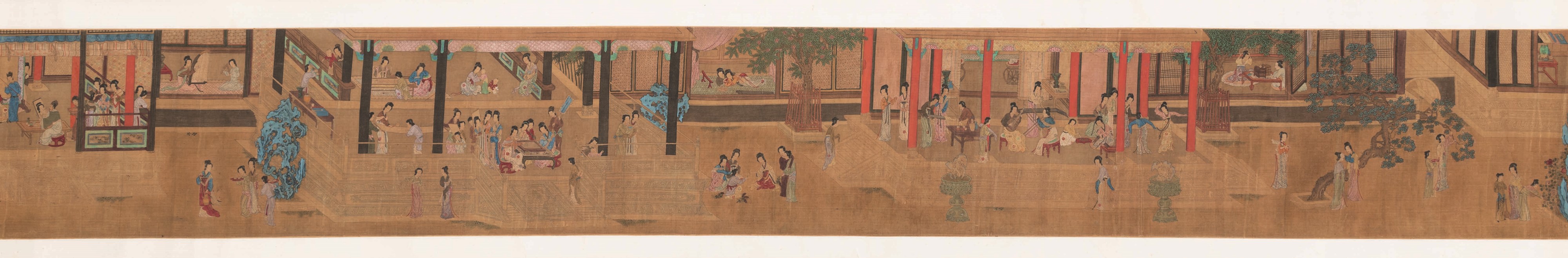 Grande dipinto su seta raffigurante scena di vita comune con cortigiane e altri [..]