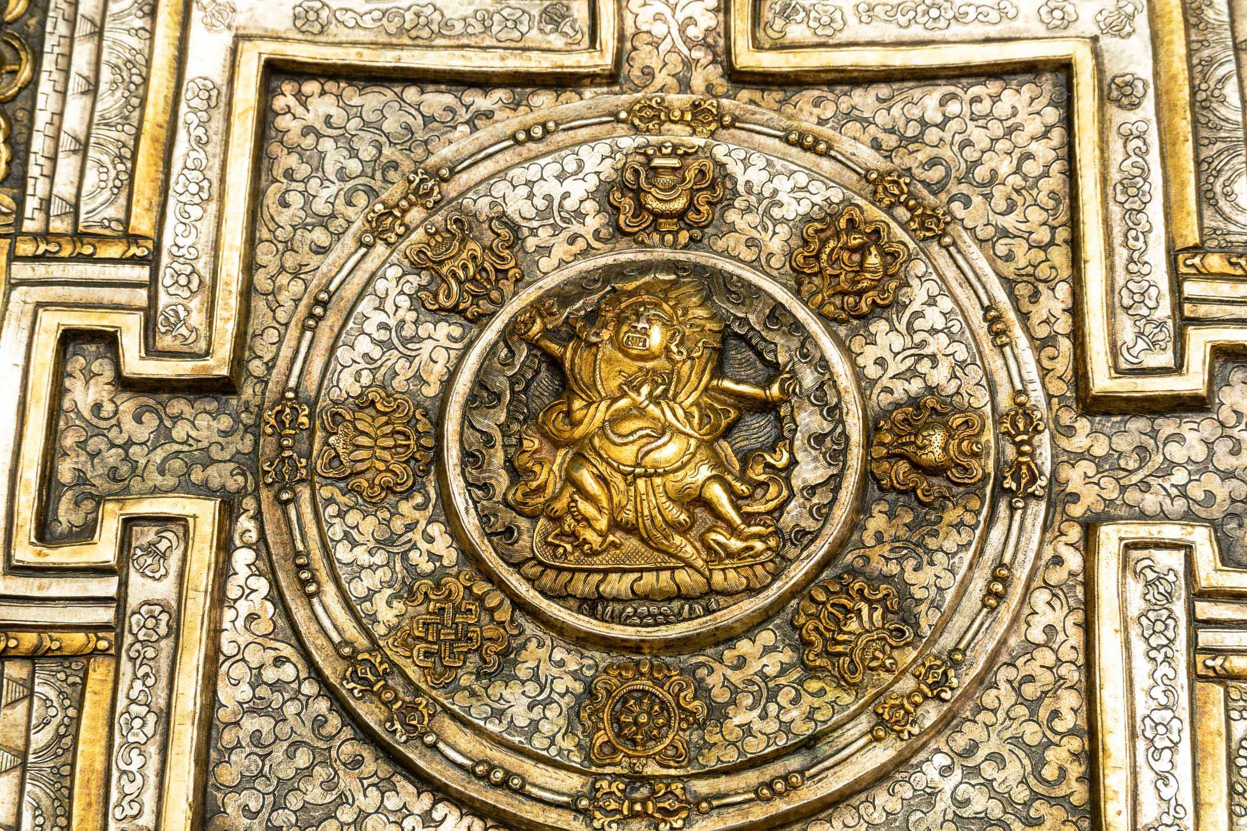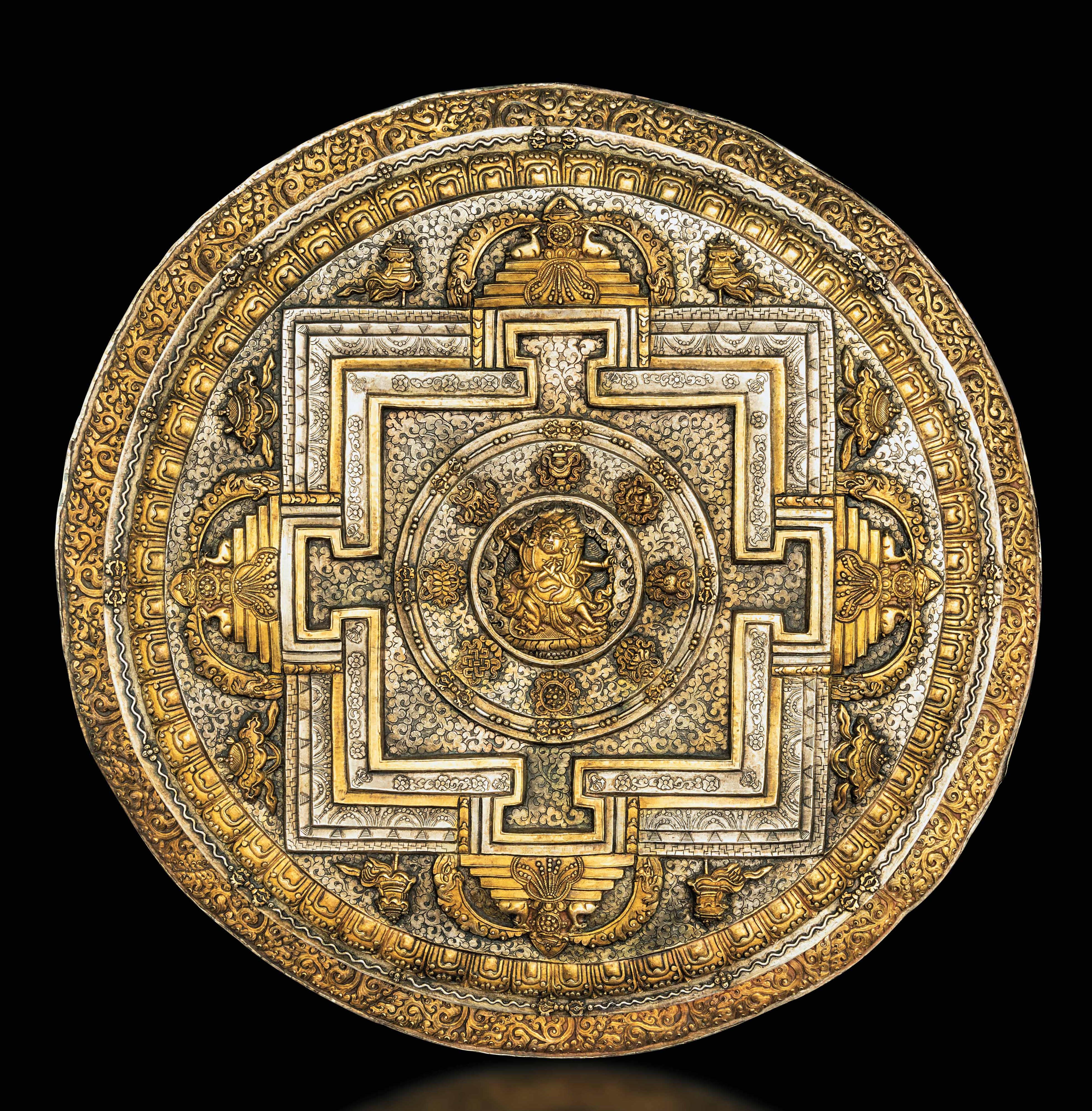 Grande e finissima placca circolare in argento cesellato e parzialmente dorato con [..]