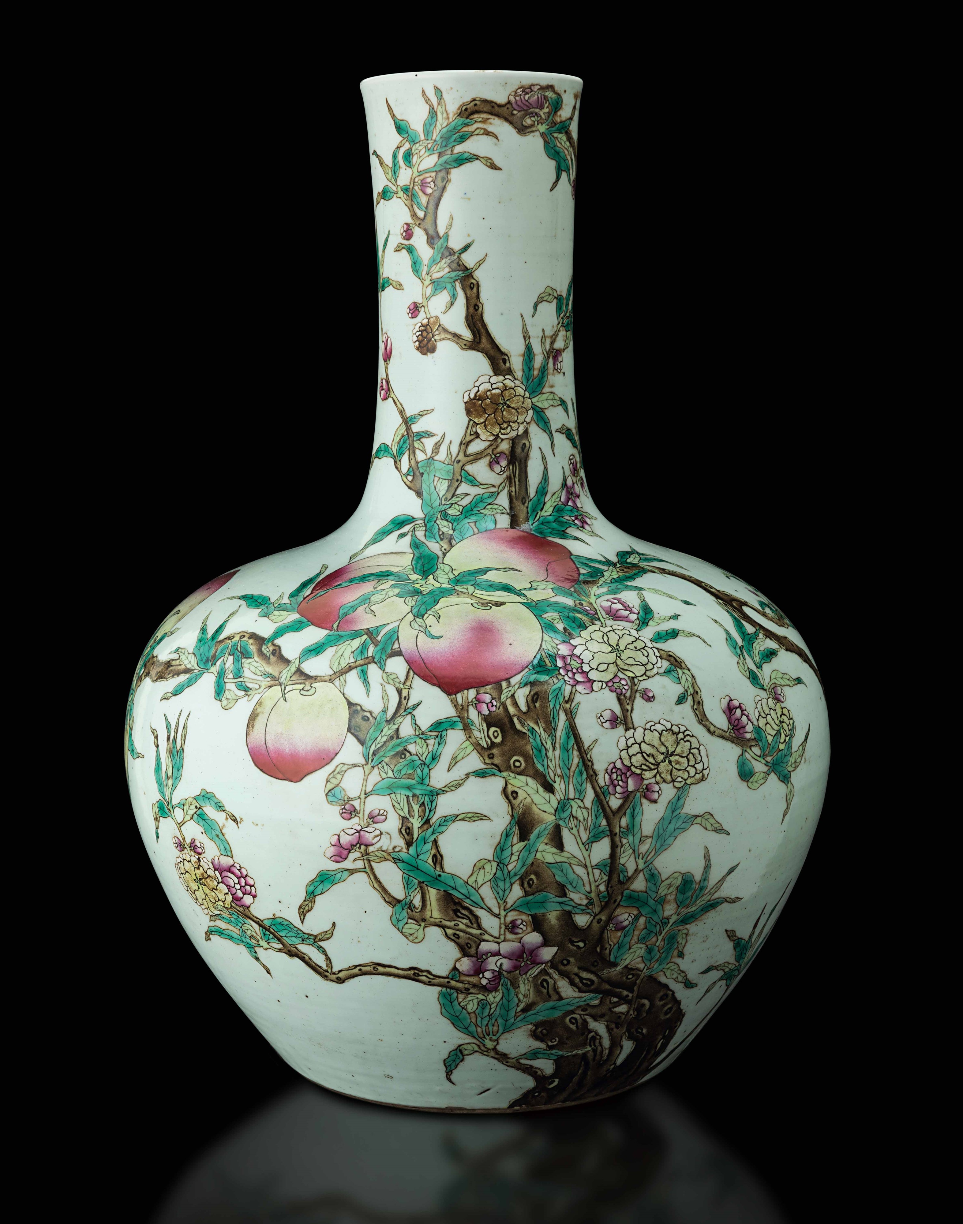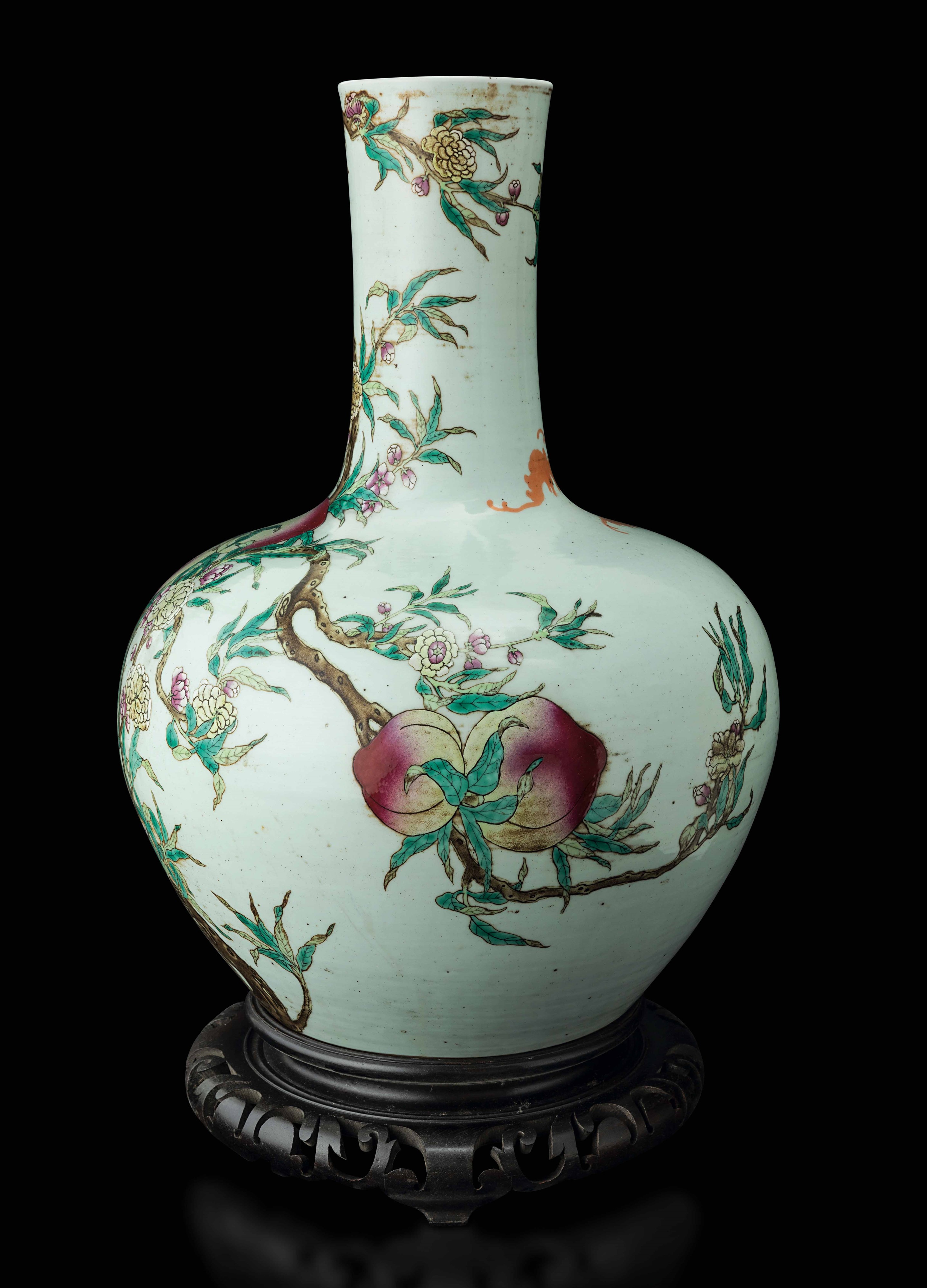 Grande e importante vaso Tianqiuping in porcellana con decoro di pesche e pipistrelli, [..]