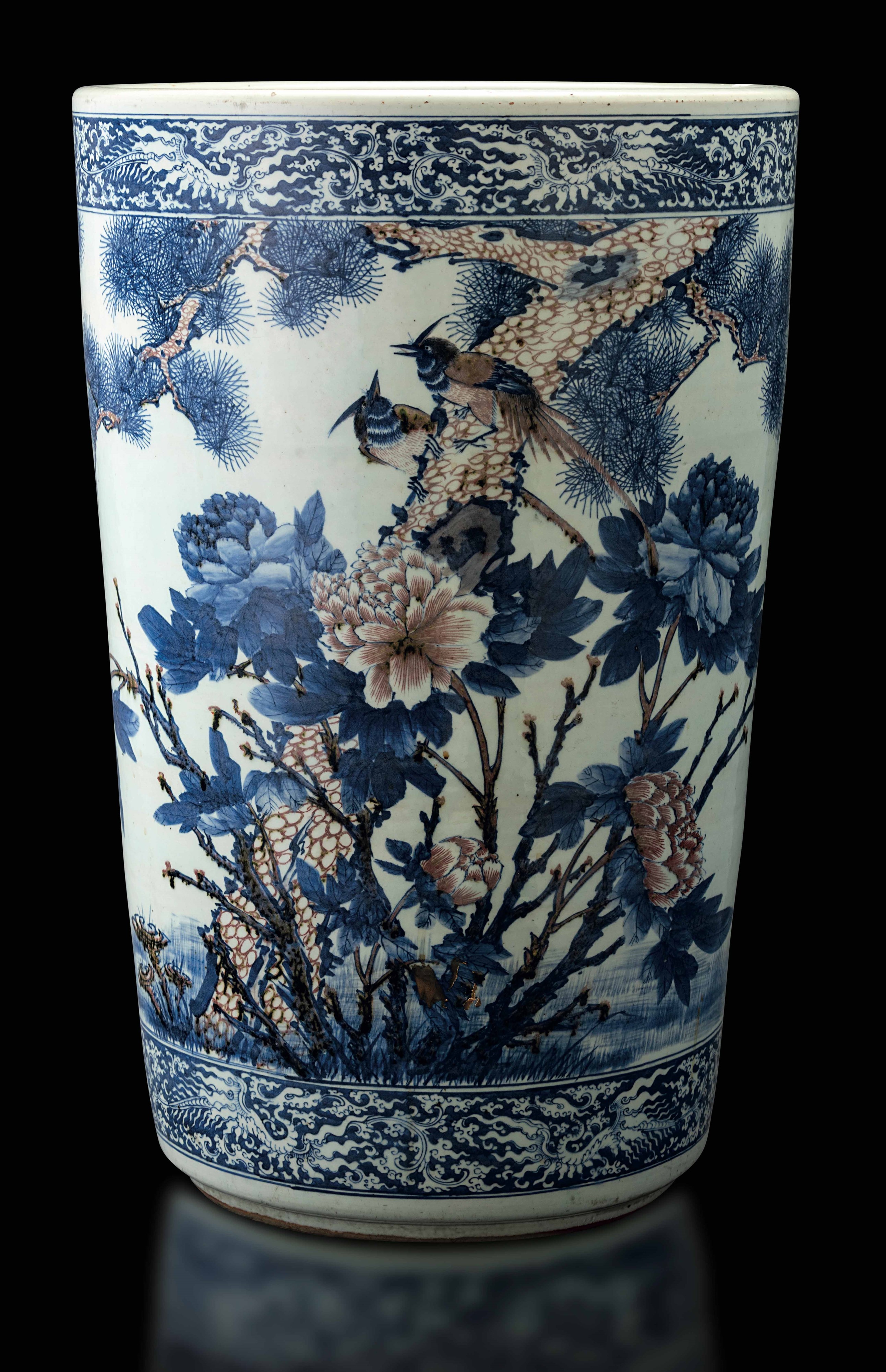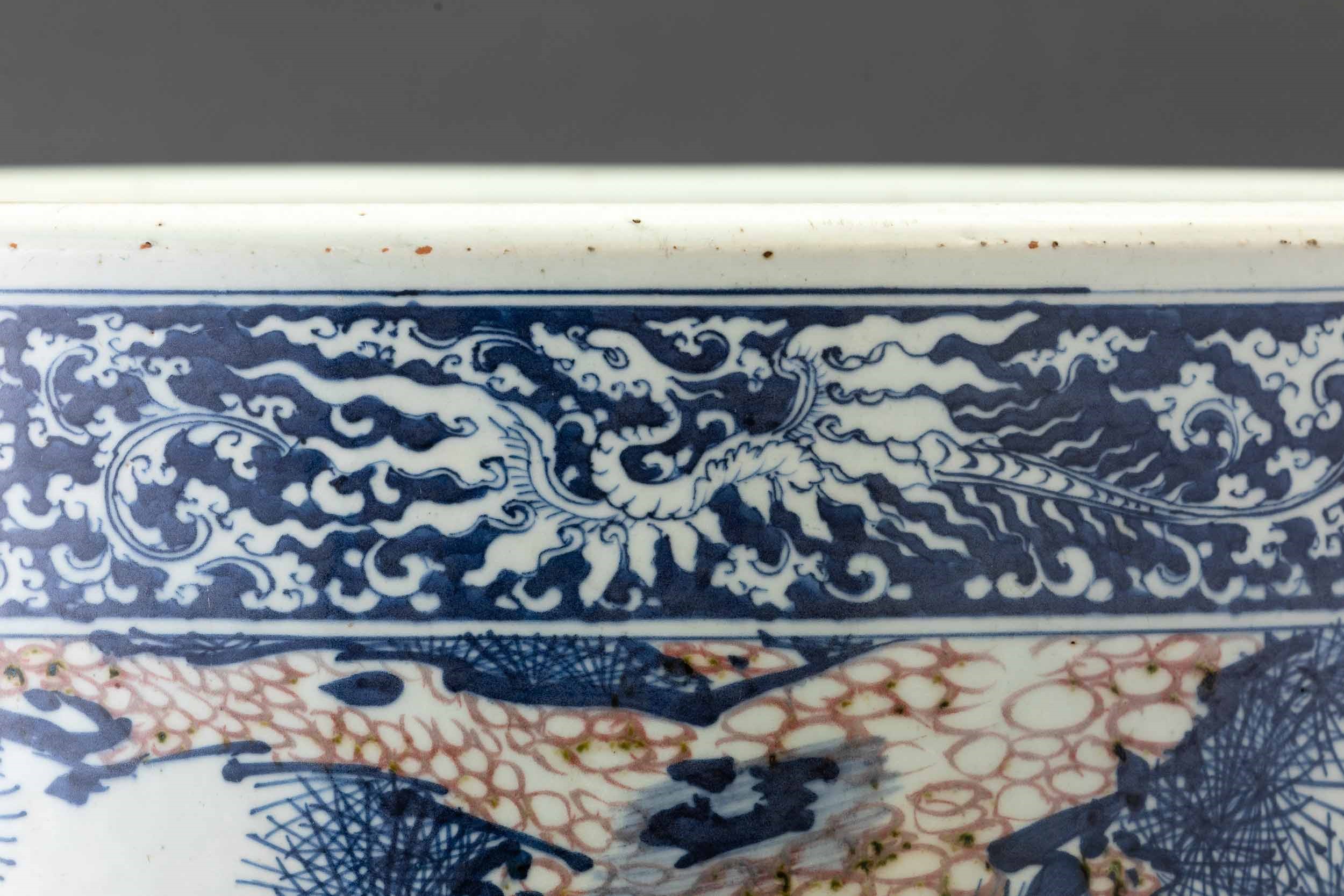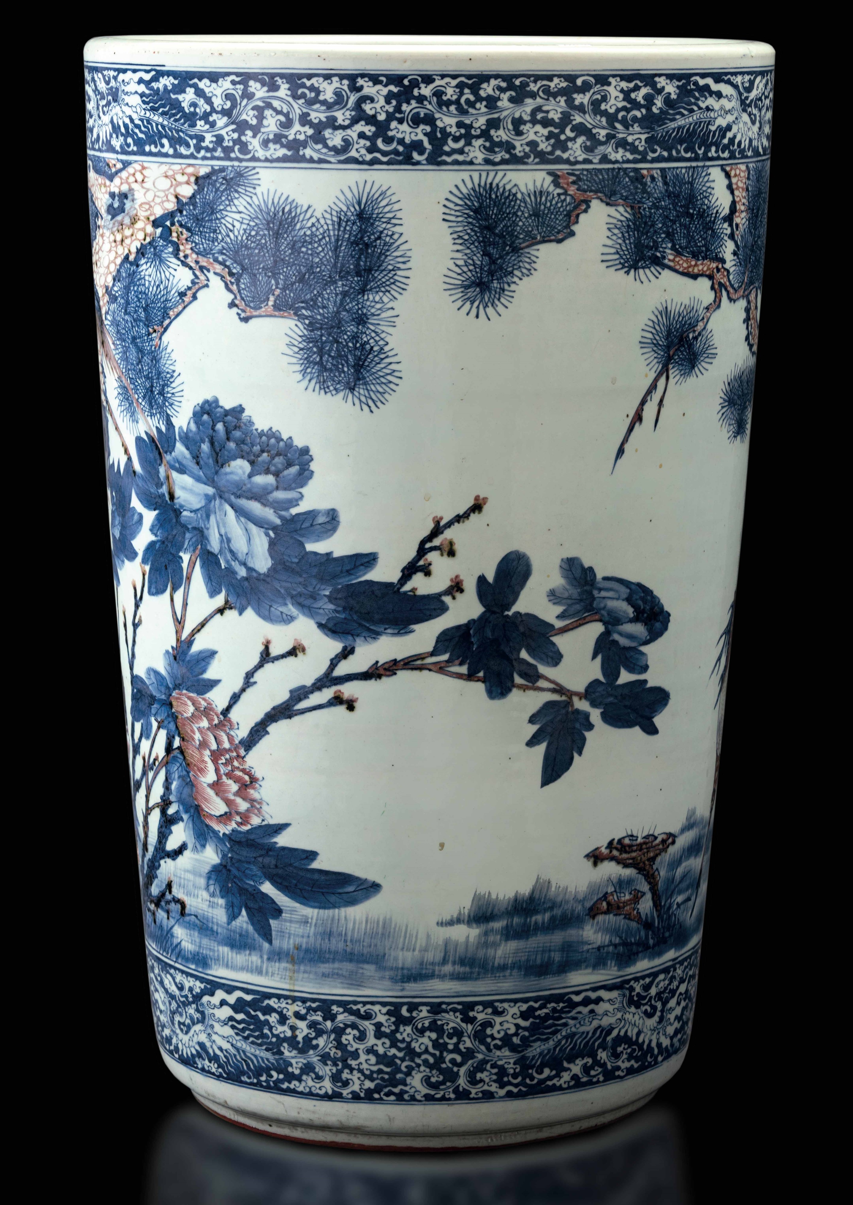 Grande e straordinaria giardiniera in porcellana a decoro blu e rosso ferro sotto [..]