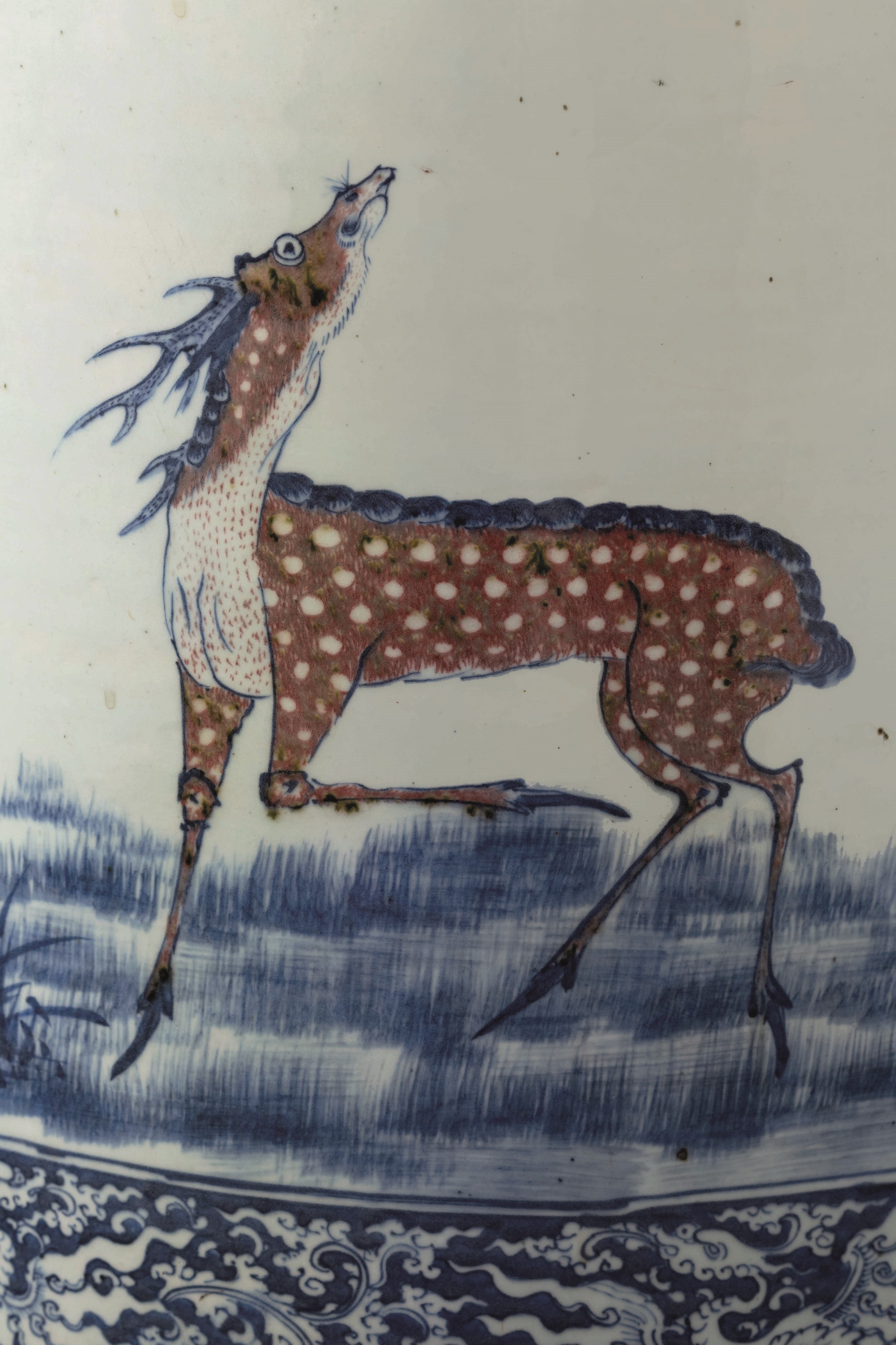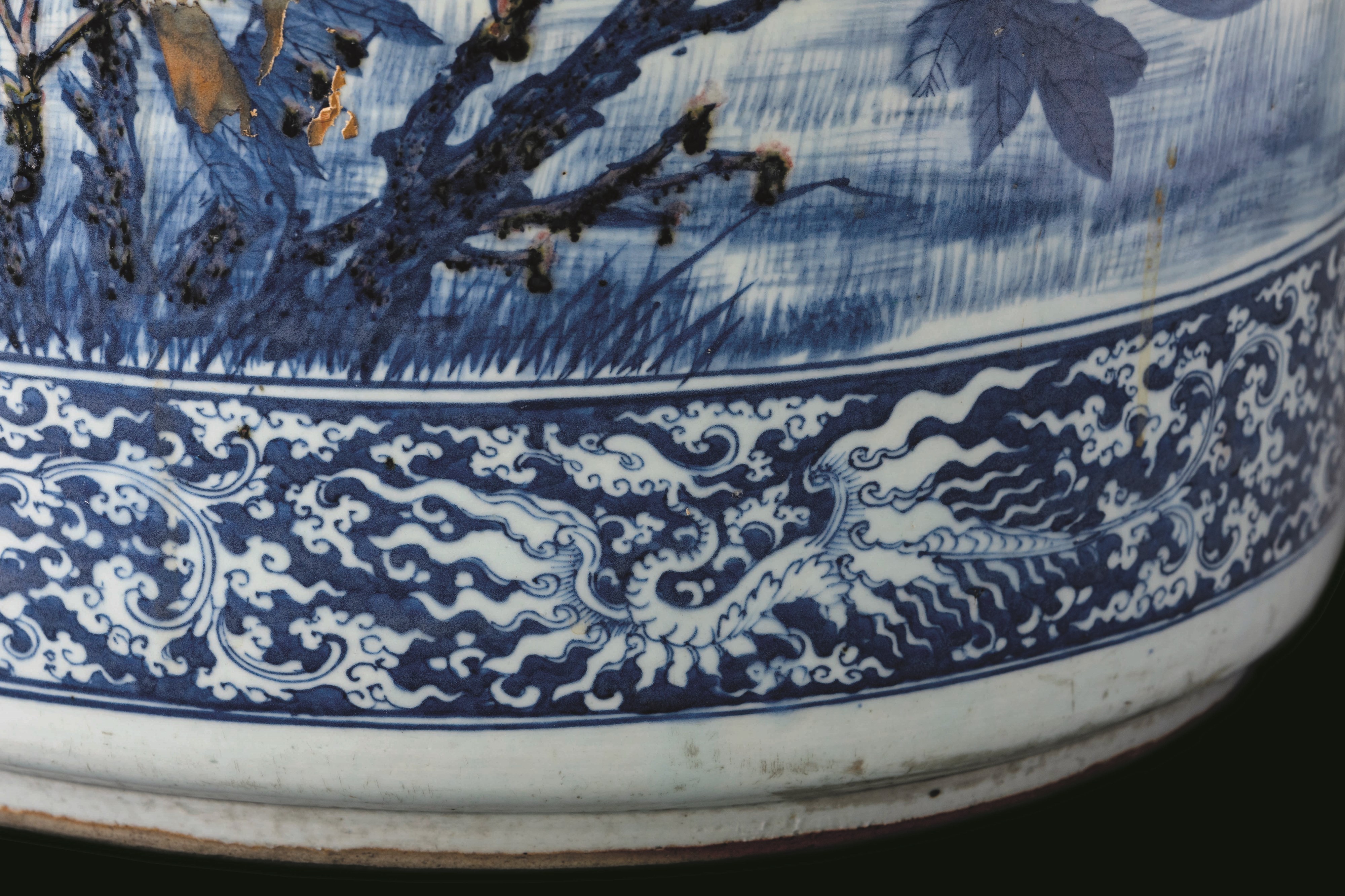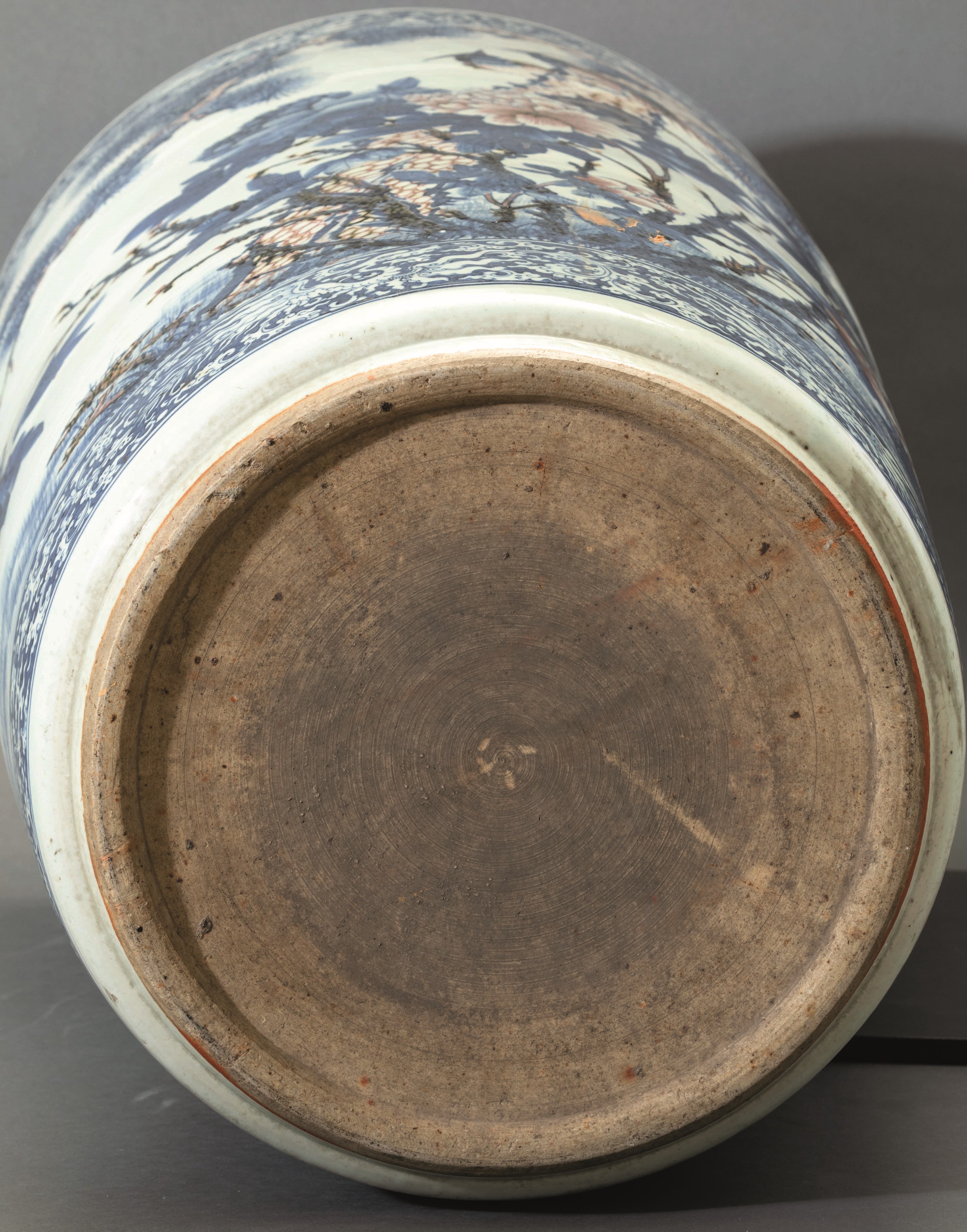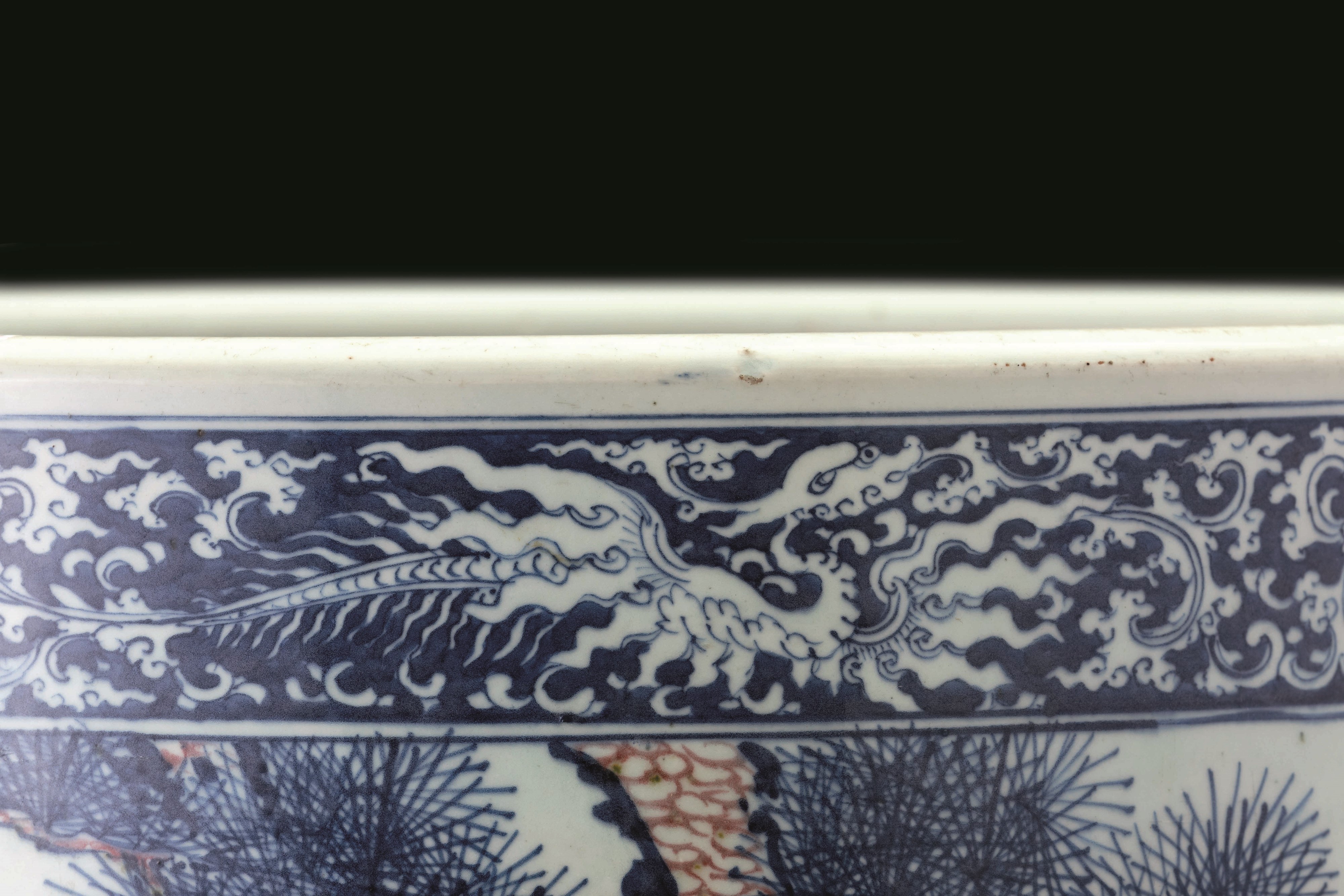 Grande e straordinaria giardiniera in porcellana a decoro blu e rosso ferro sotto [..]