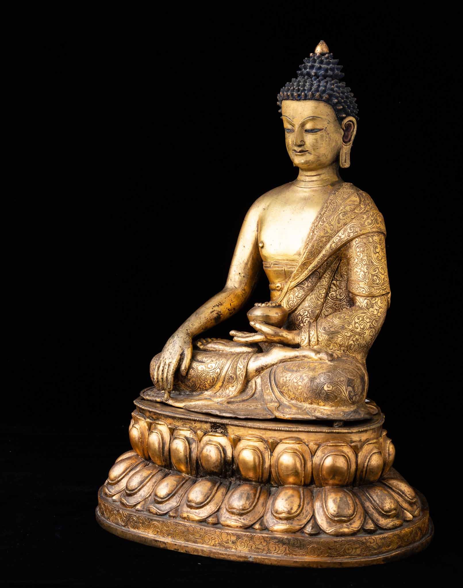 Grande figura di Buddha Sakyamuni seduto su doppio fiore di loto in bronzo dorato [..]