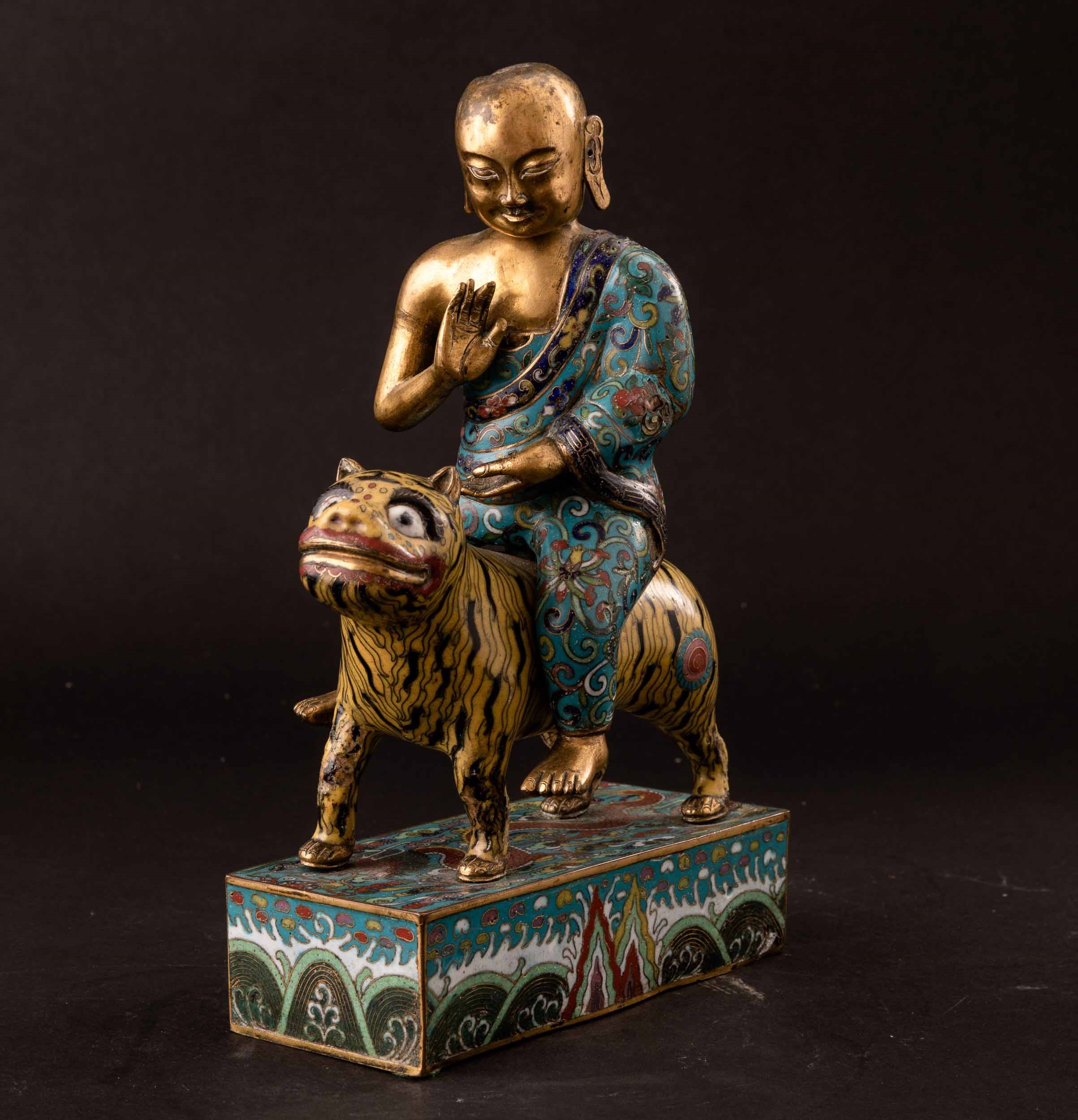 Gruppo a smalti cloisonnè raffigurante saggio su tigre, Cina, Dinastia Qing, epoca [..]