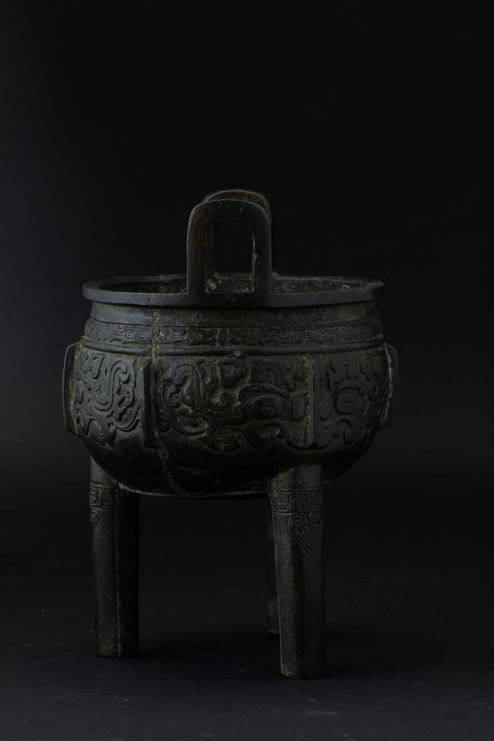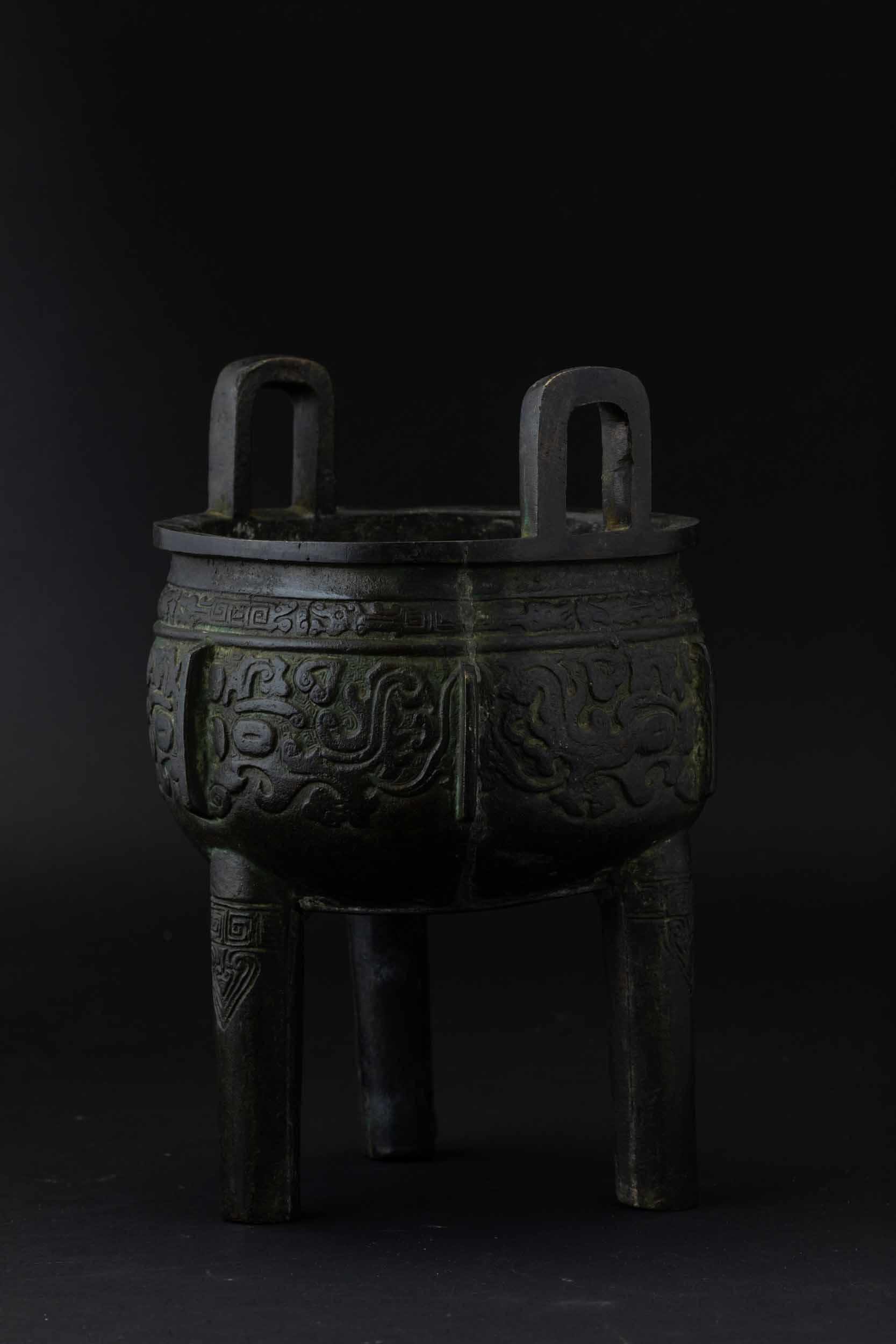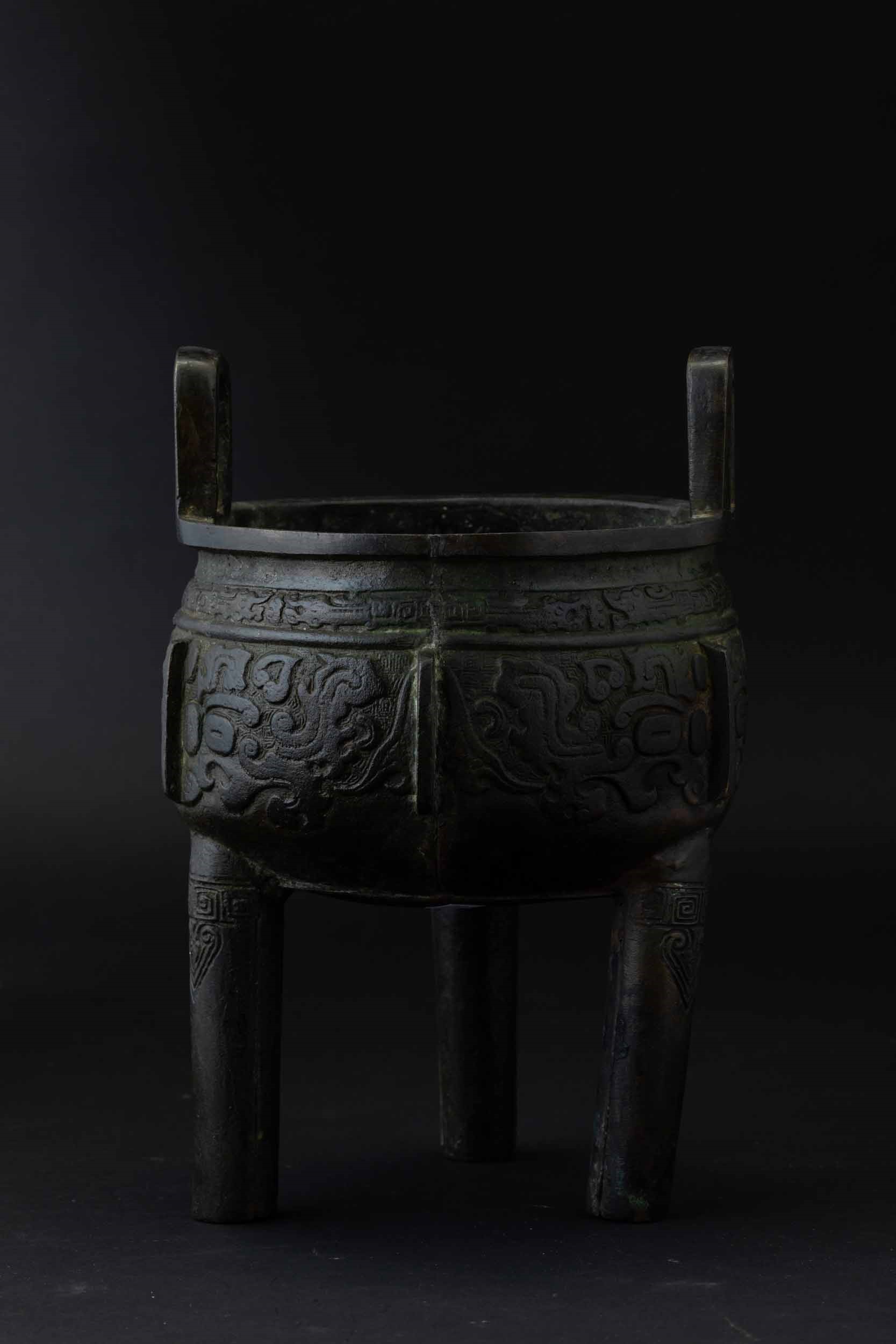 Incensiere tripode in bronzo con decori d'ispirazione arcaica incisi, Cina, Dinastia [..]