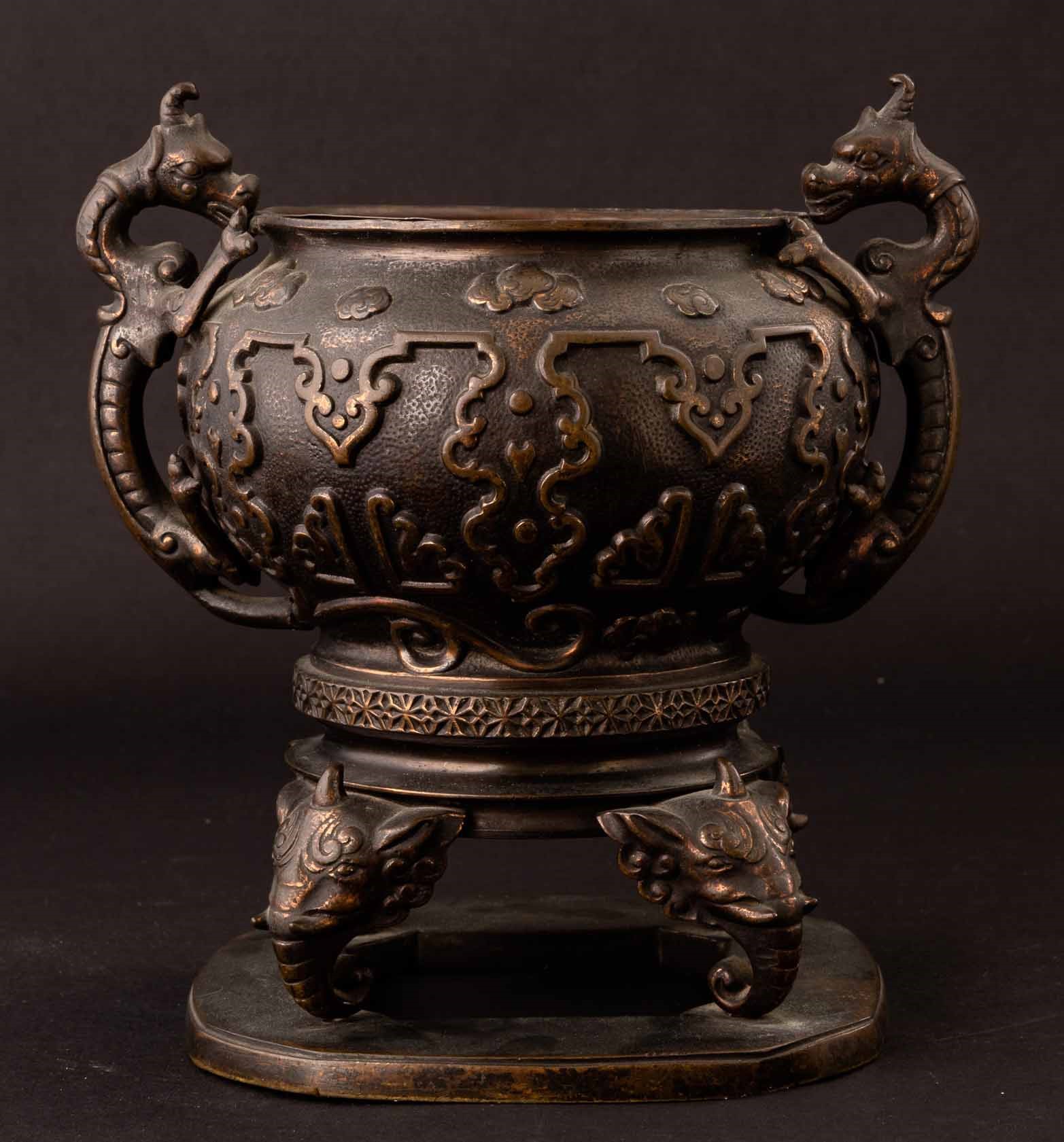 Incensiere tripode in bronzo con manici a foggia di draghetto e decori a rilievo, [..]