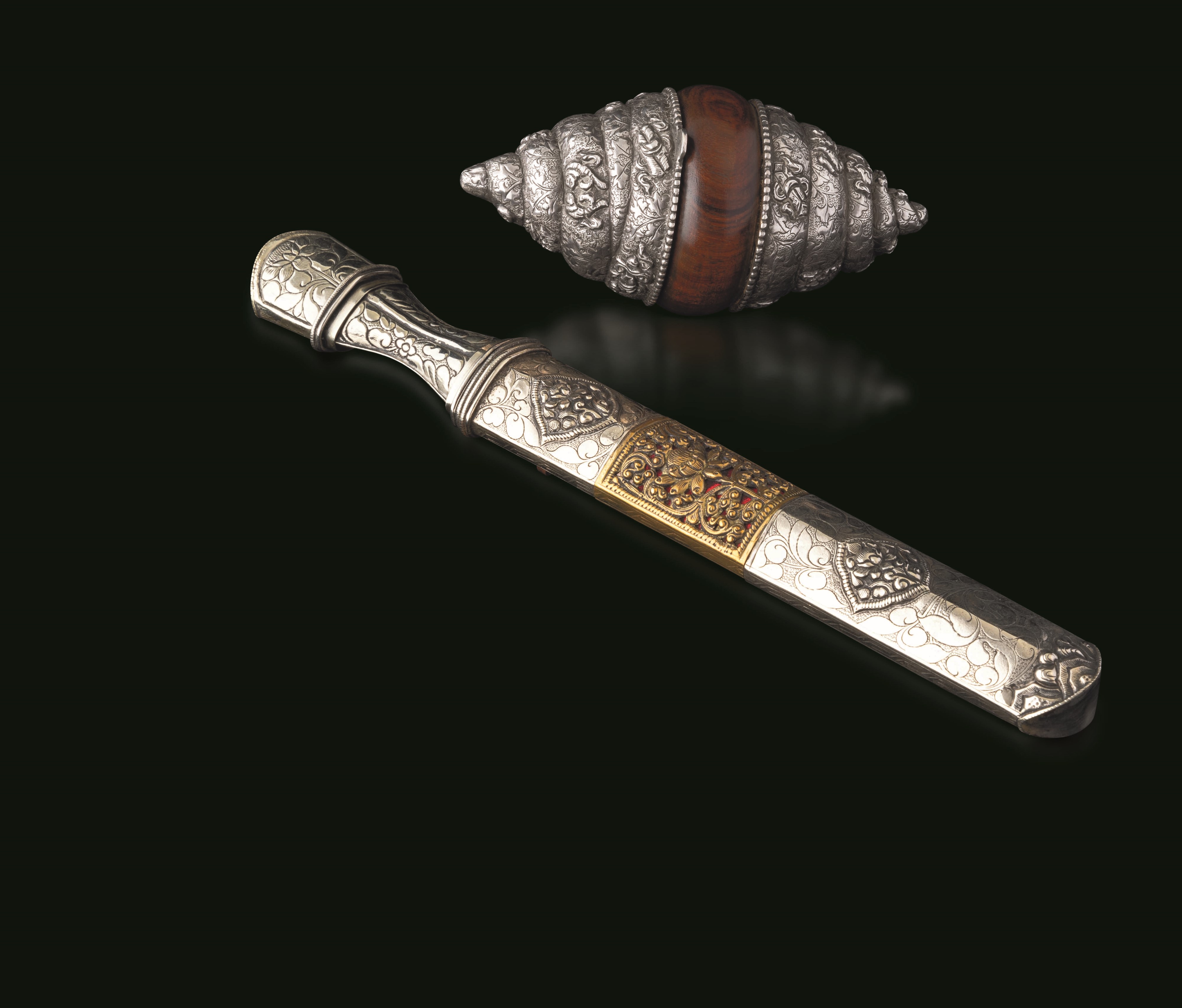 Lotto composto da un contenitore in legno e argento e pugnale rituale in argento [..]