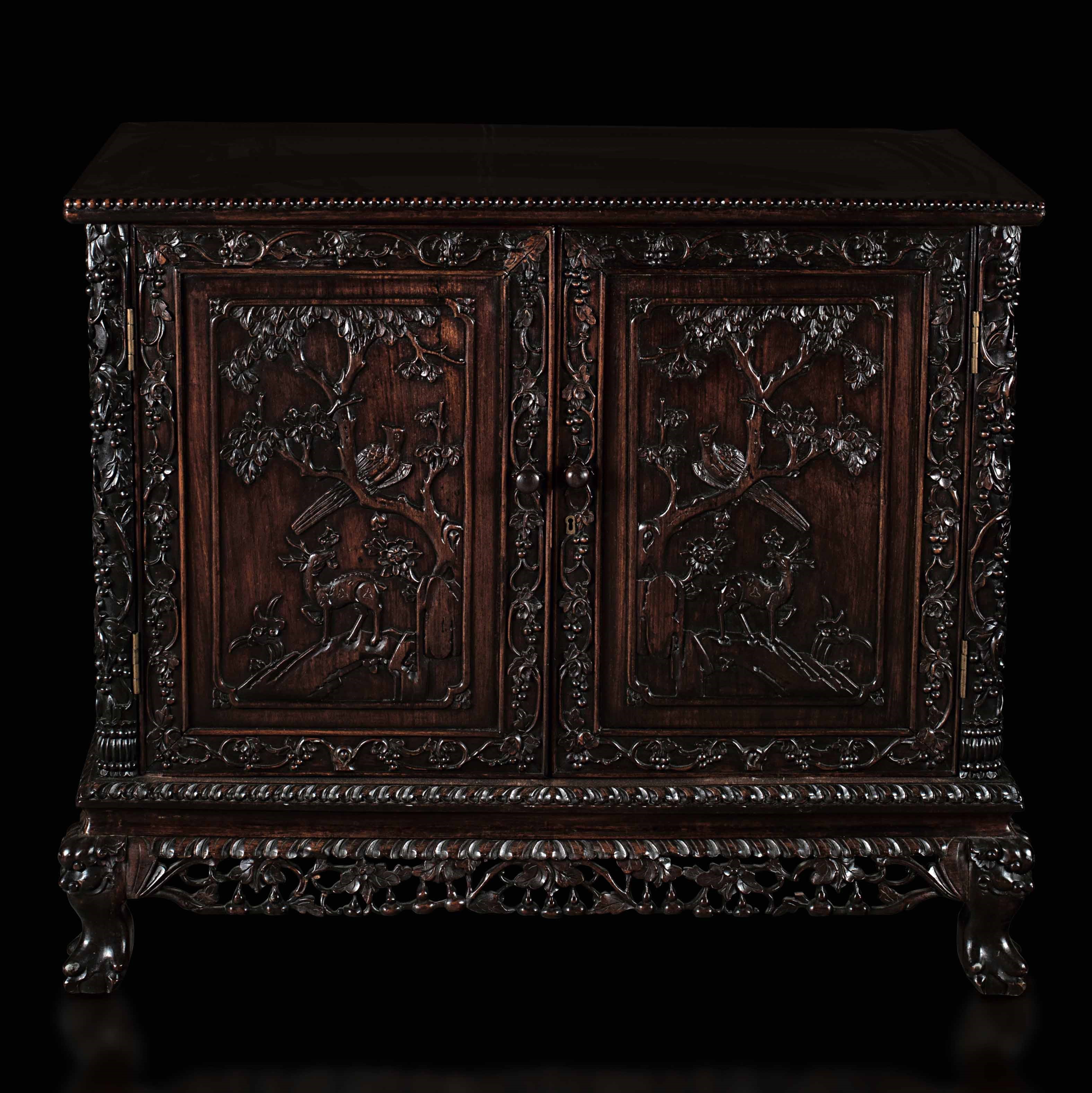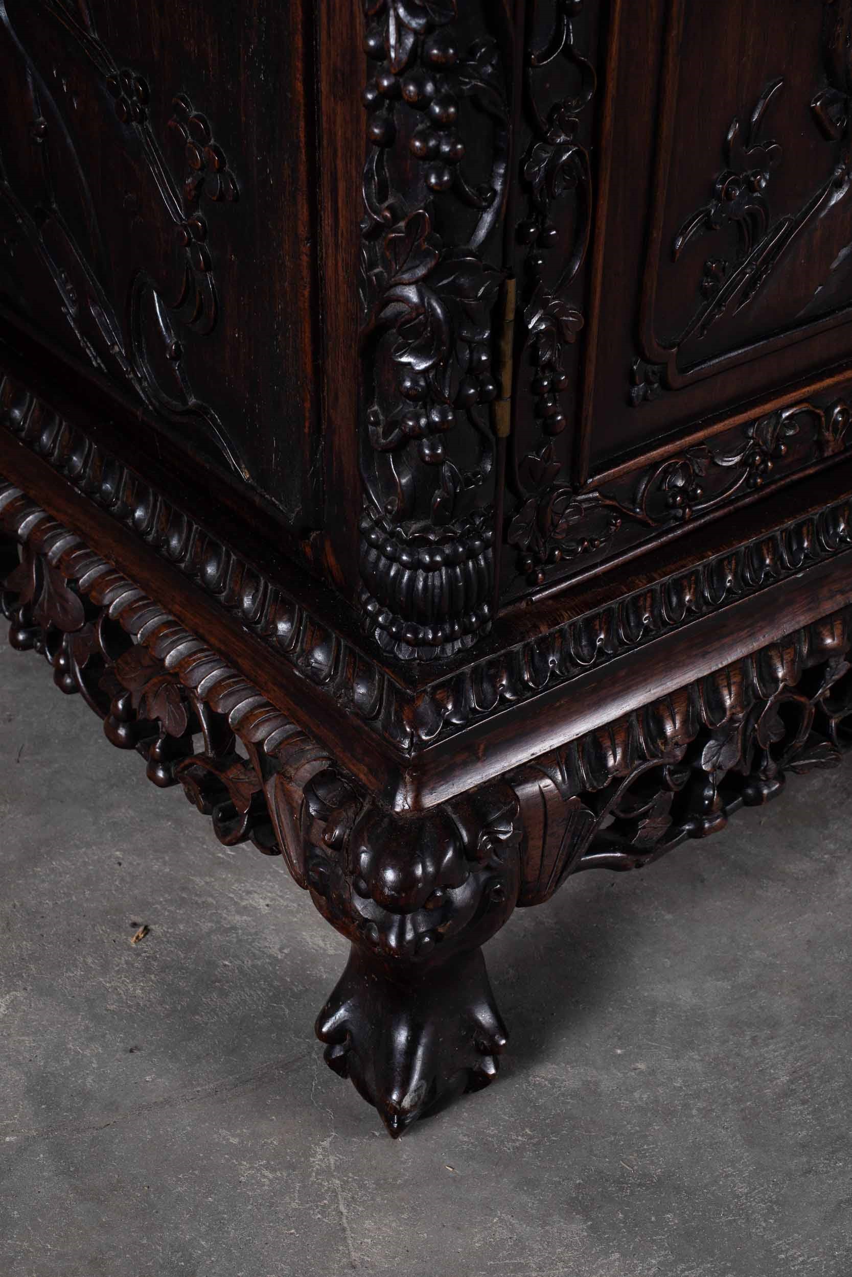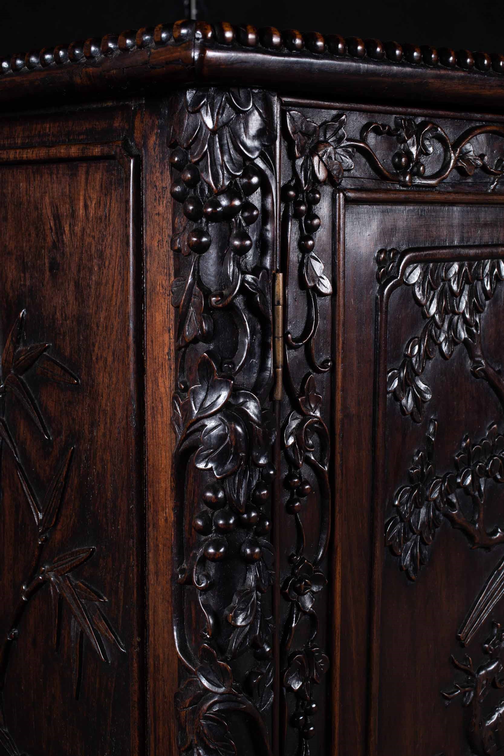 Mobile basso a doppia anta in legno di Hongmu con soggetti naturalistici a rilievo, [..]
