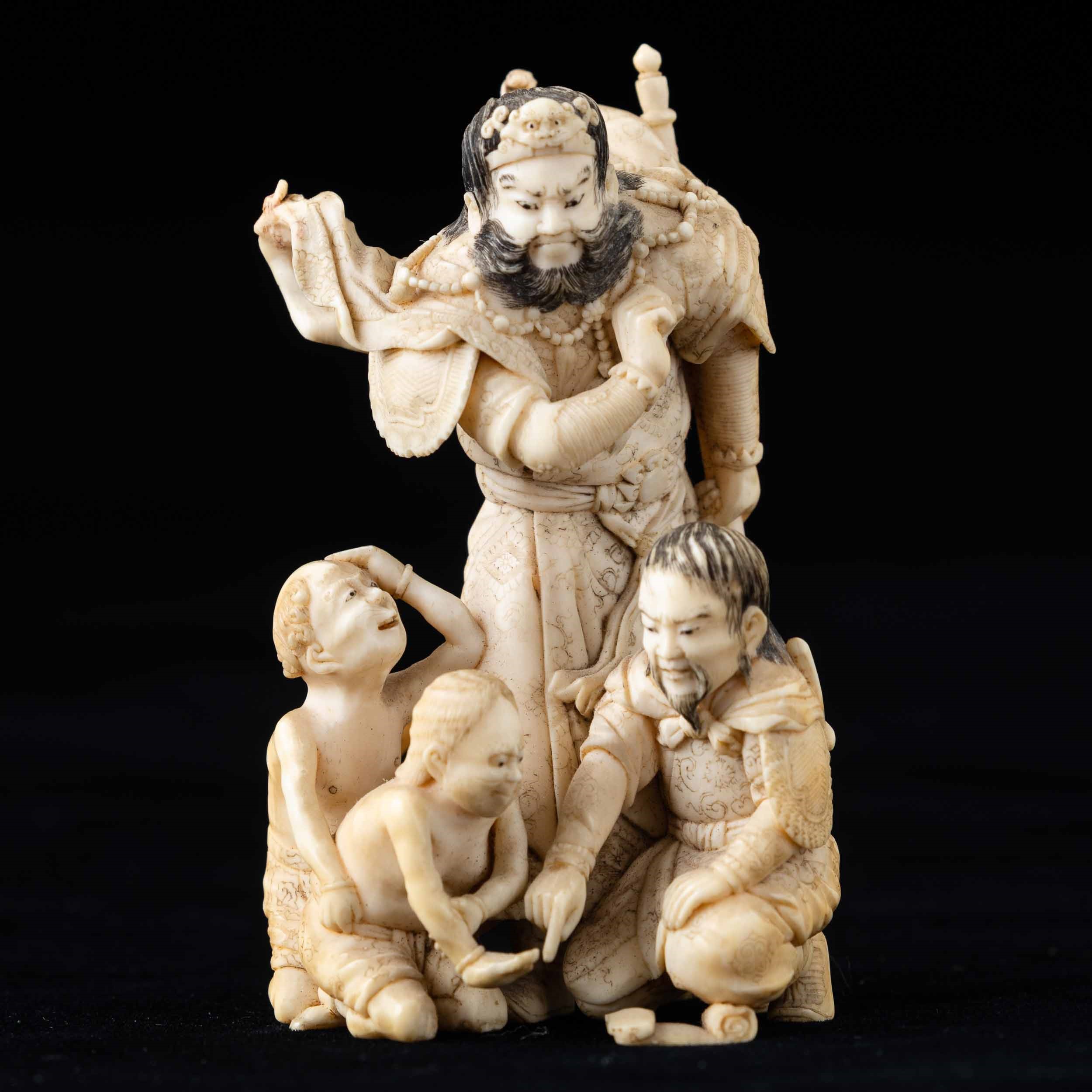 Okimono scolpito in avorio parzialmente dipinto raffigurante guerrieri con fanciulli, [..]