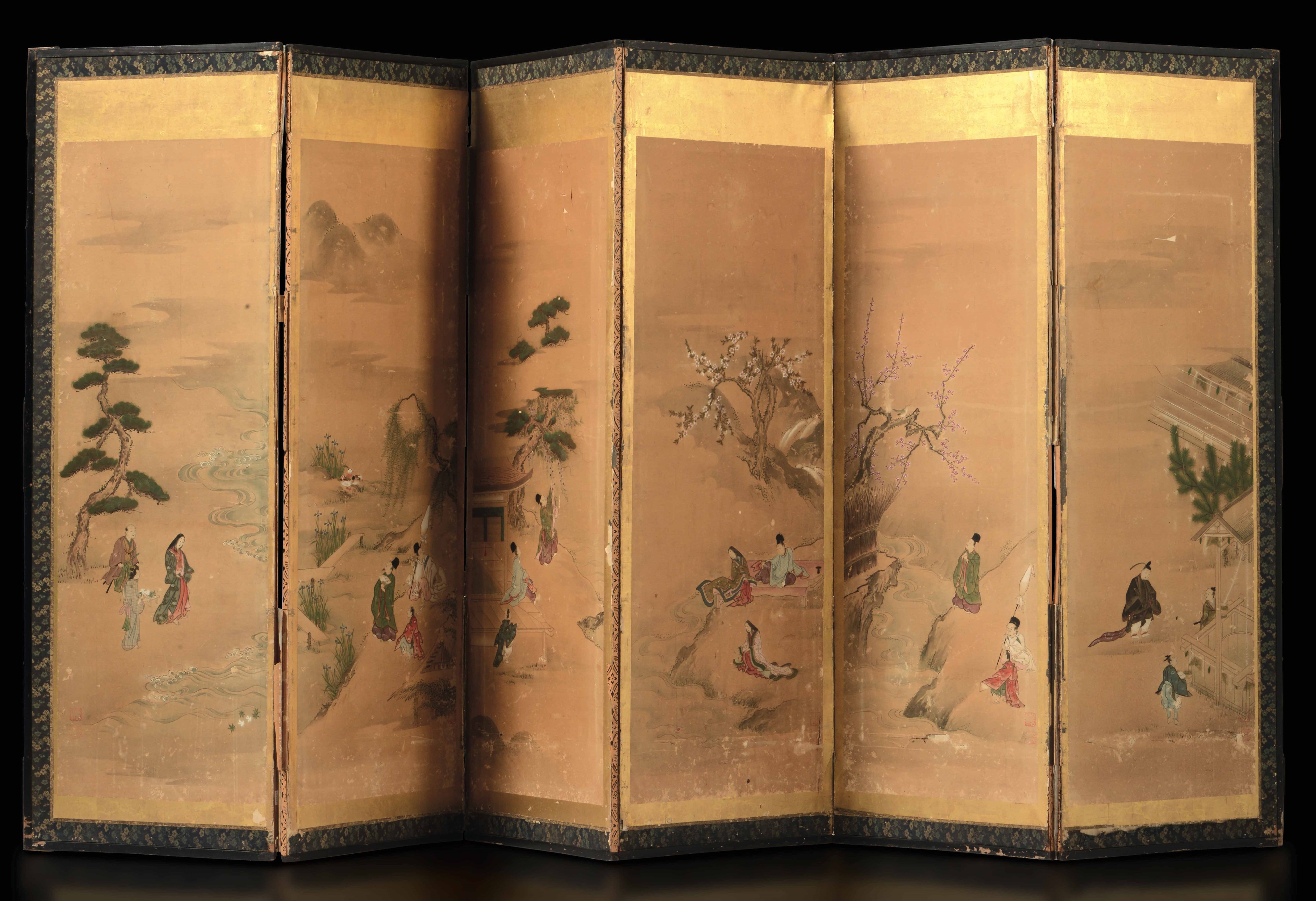Paravento a sei ante con dipinti su carta raffiguranti scene di vita comune, Giappone, [..]