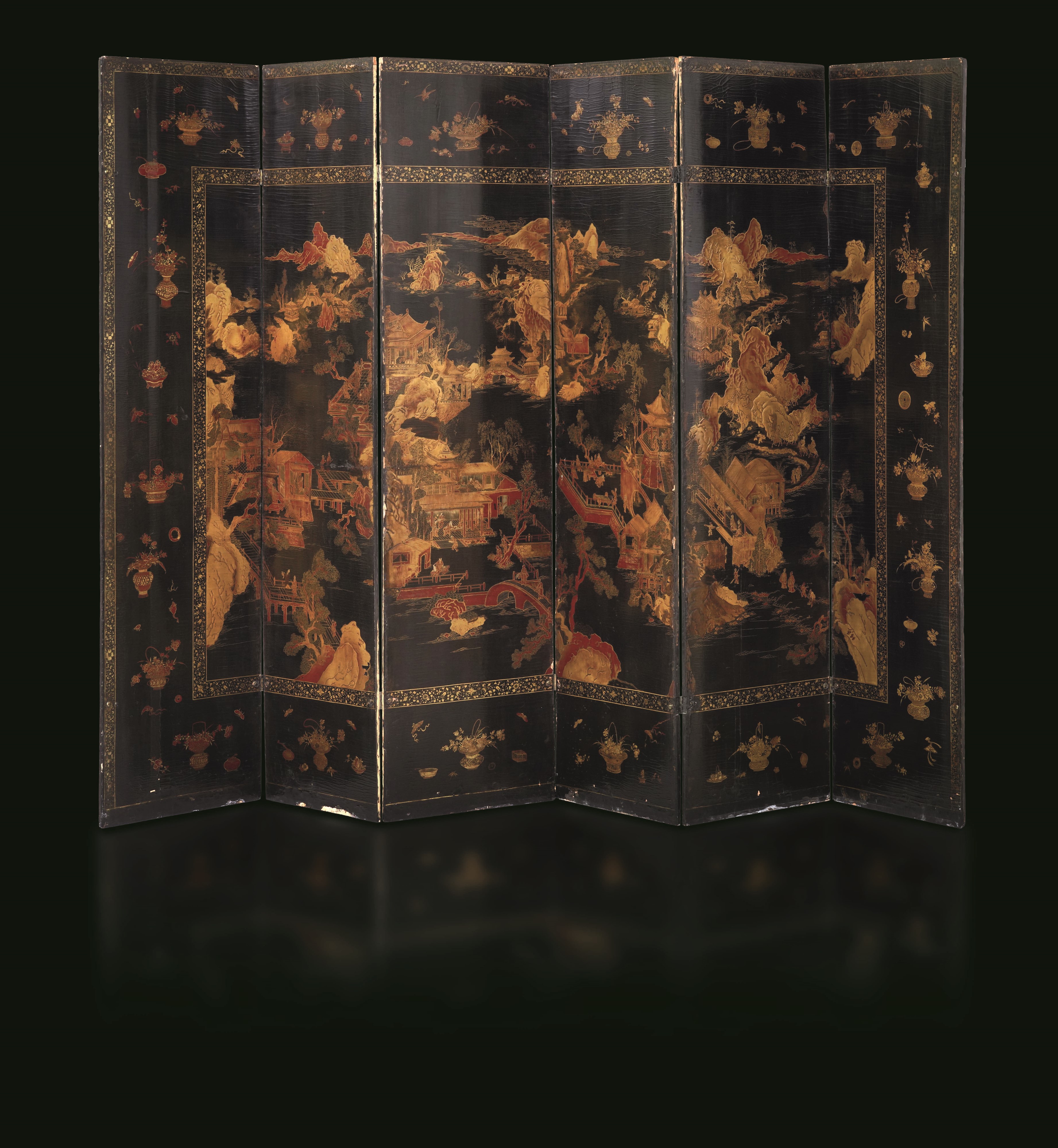 Paravento a sei ante in legno laccato con raffigurazione di villaggio e soggetti [..]
