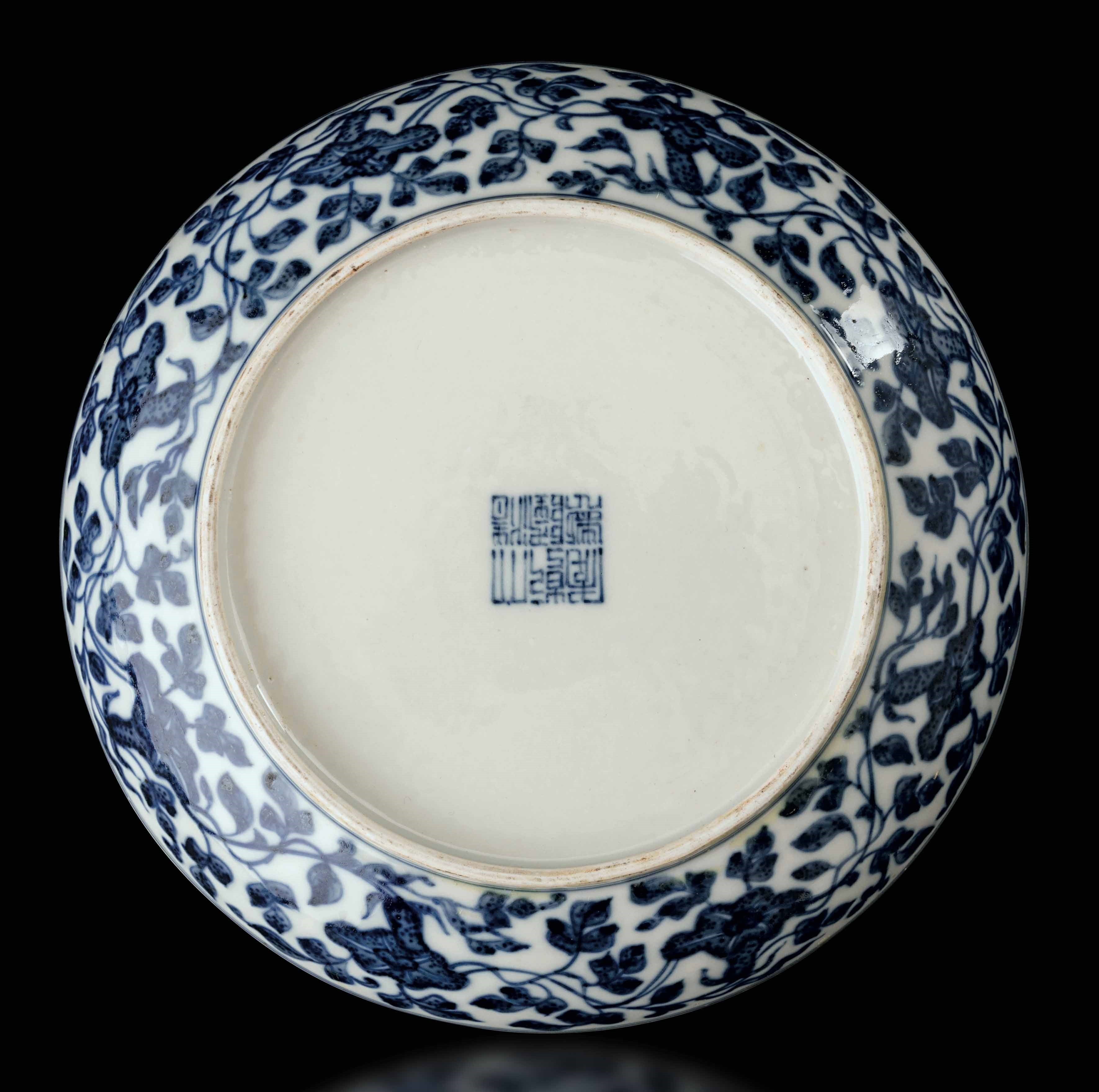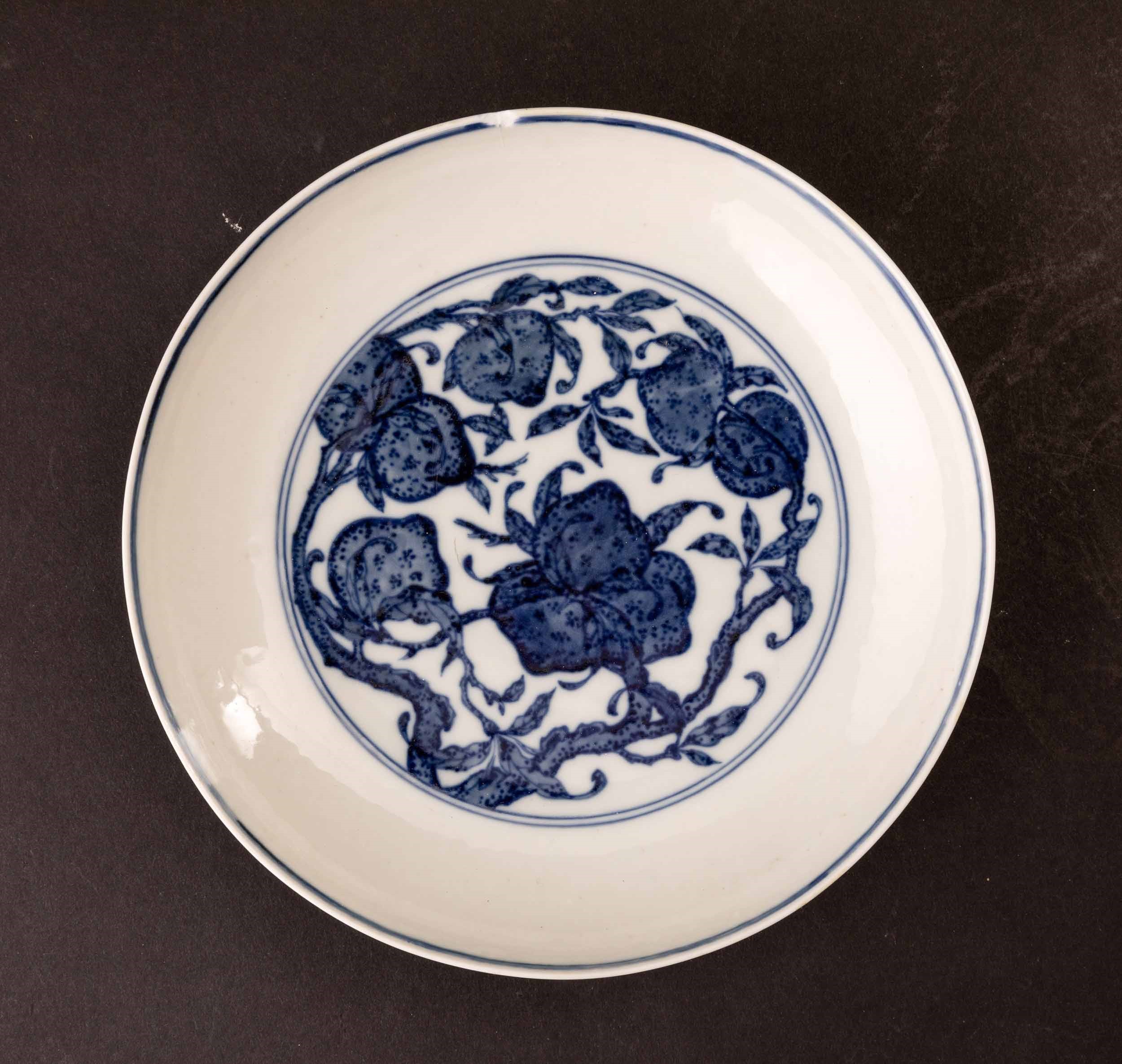 Piatto in porcellana bianca e blu con decoro centrale di pesche, Cina, Dinastia [..]