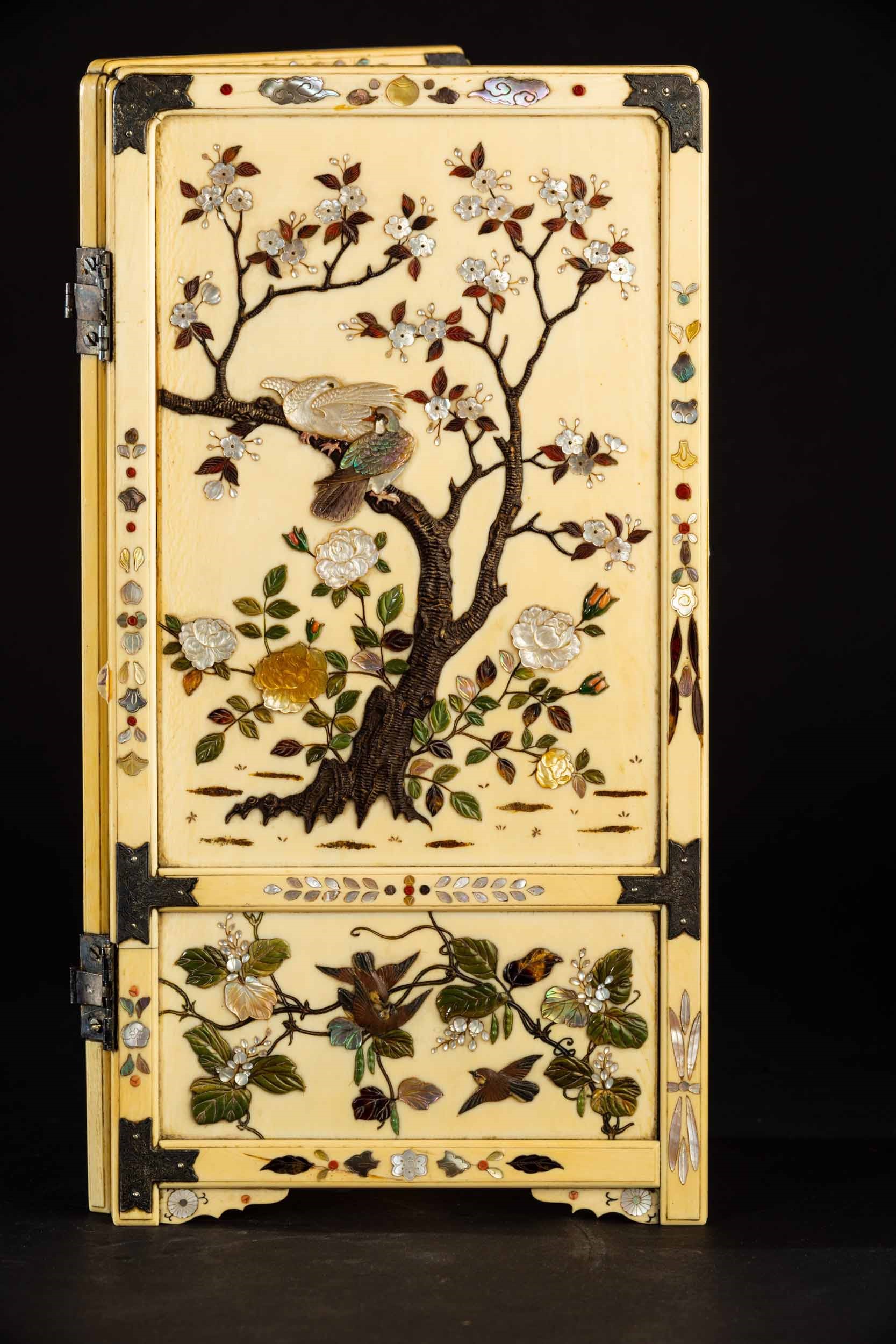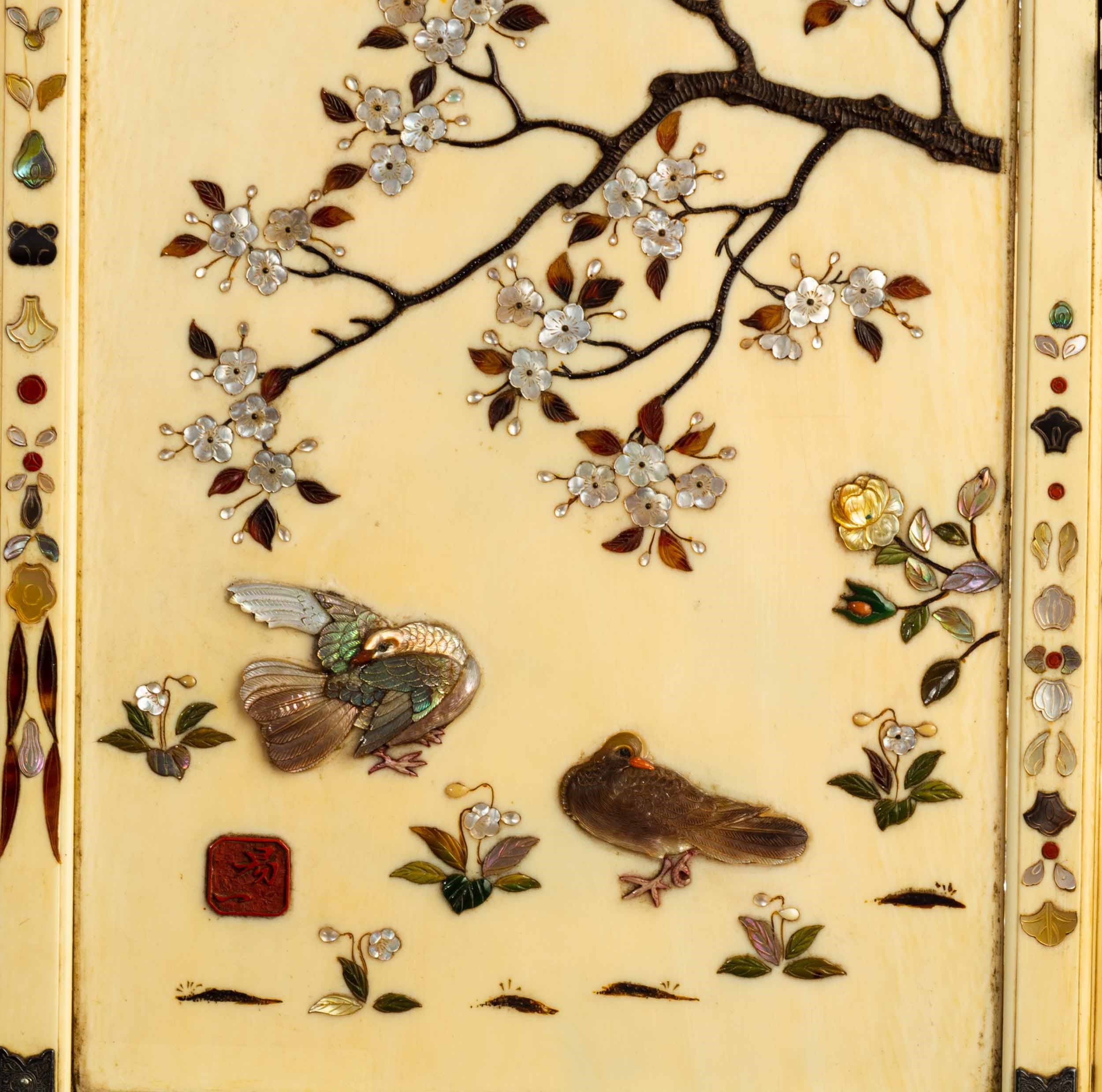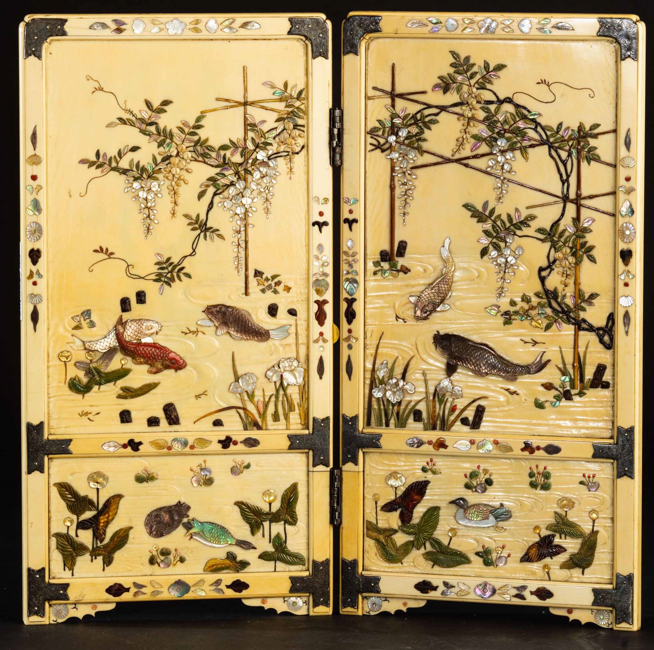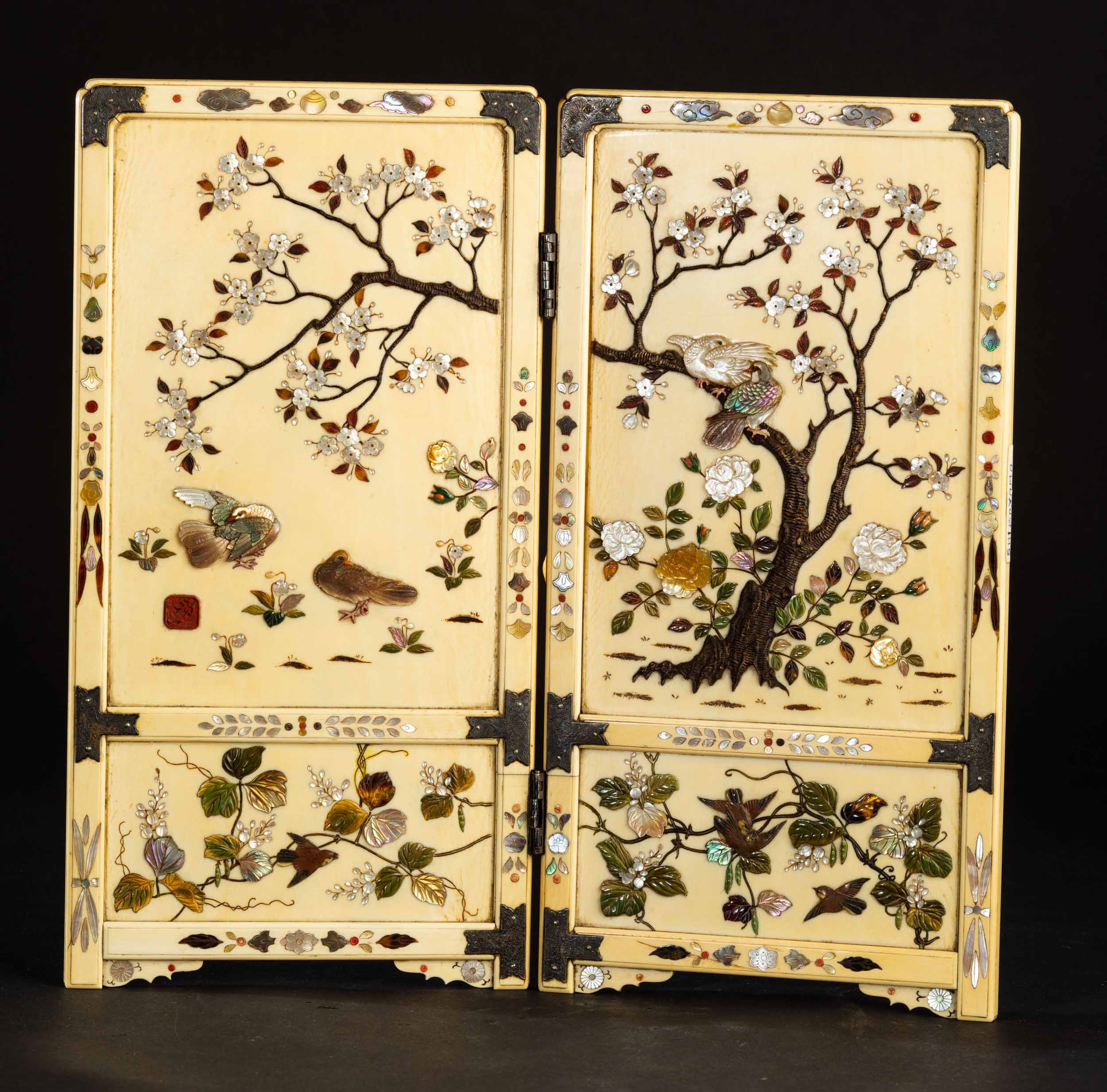 Piccolo paravento da tavolo a due ante in avorio con applicazioni in madreperla [..]