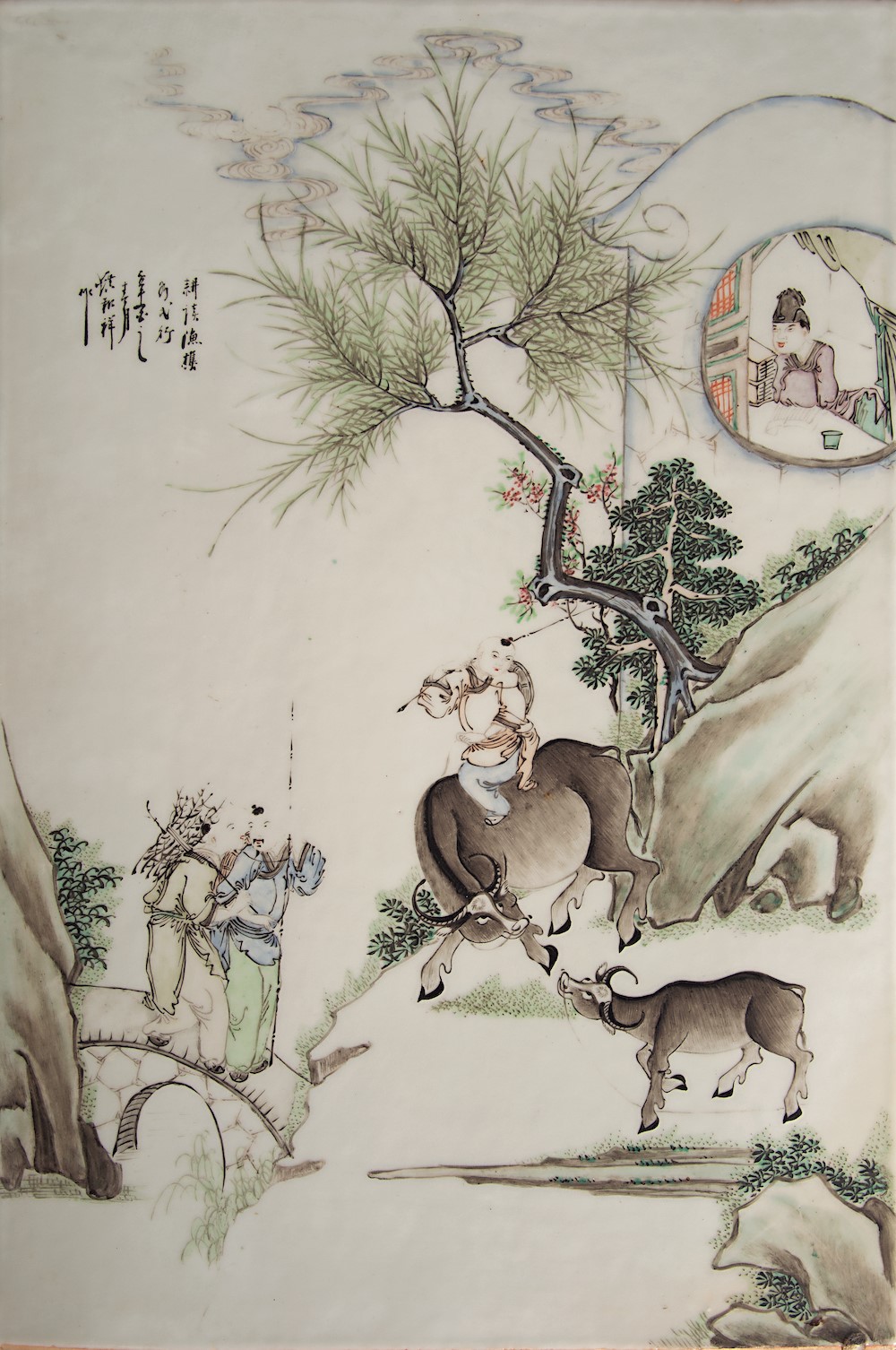 Placca in porcellana a smalti policromi con pastori e iscrizione, Cina, Dinastia [..]