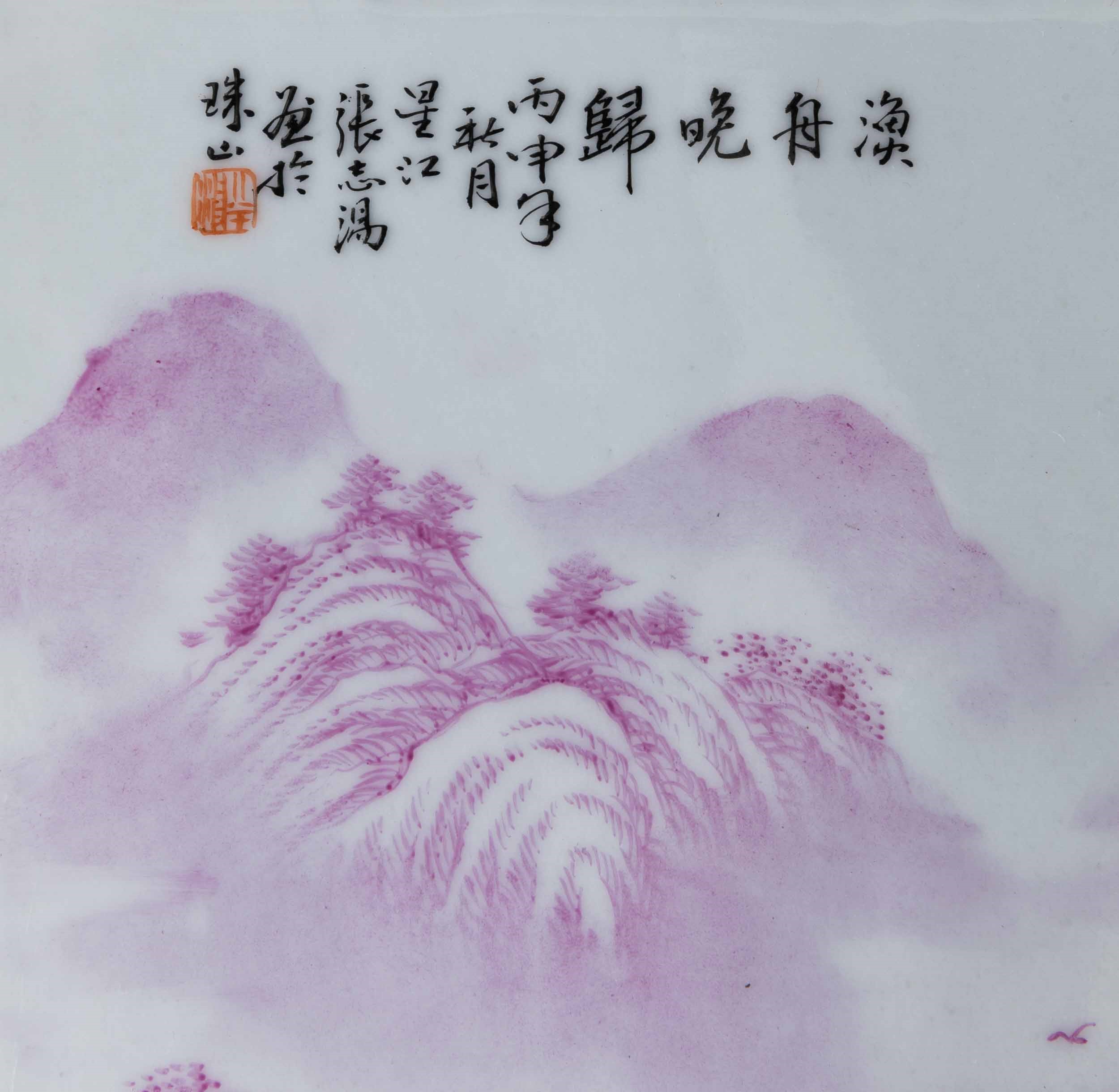 Placca in porcellana con decoro monocromo sui toni del porpora raffigurante paesaggio [..]