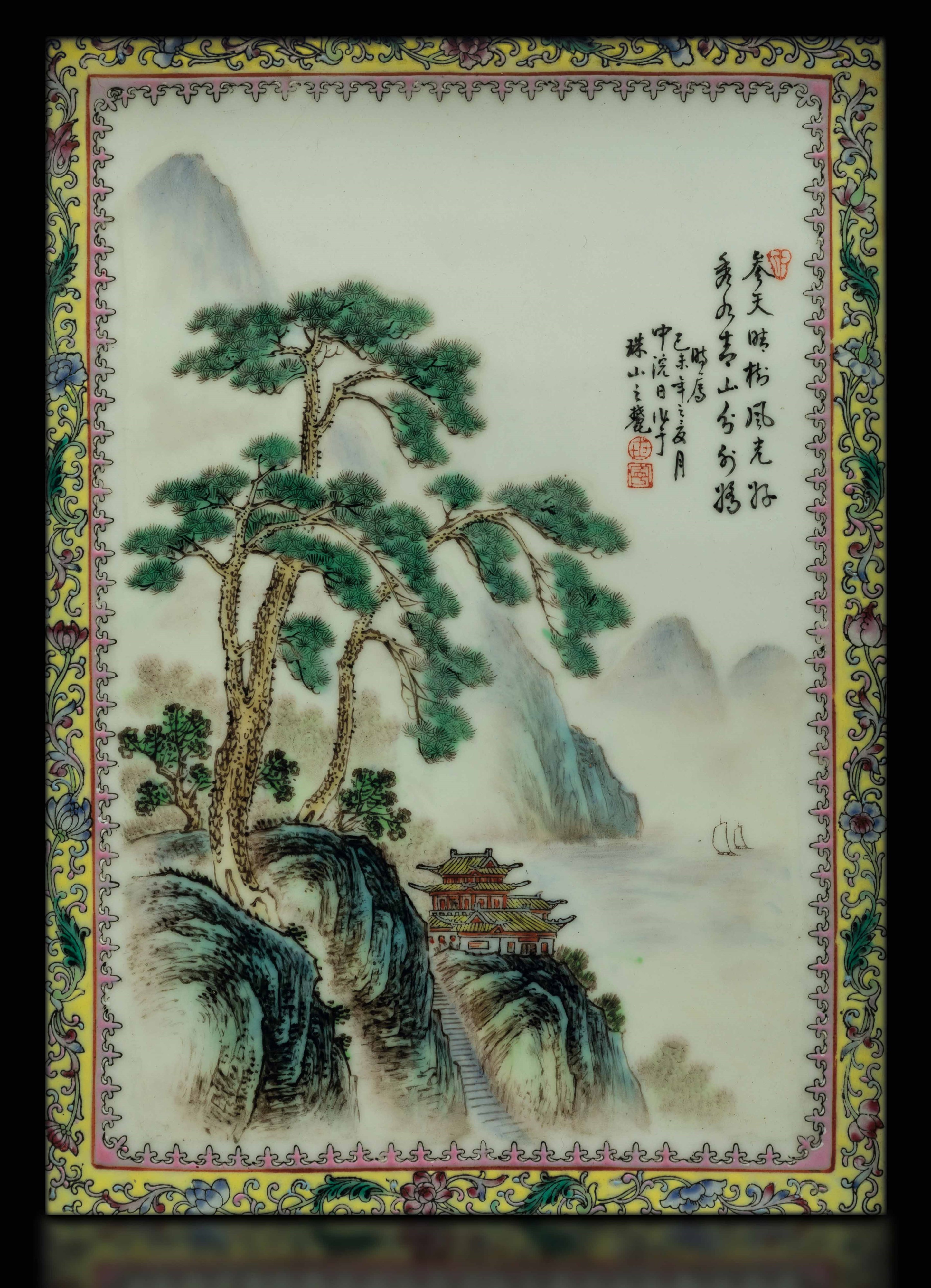 Placca in porcellana con raffigurazione di paesaggio e iscrizione, Cina, Repubblica, [..]