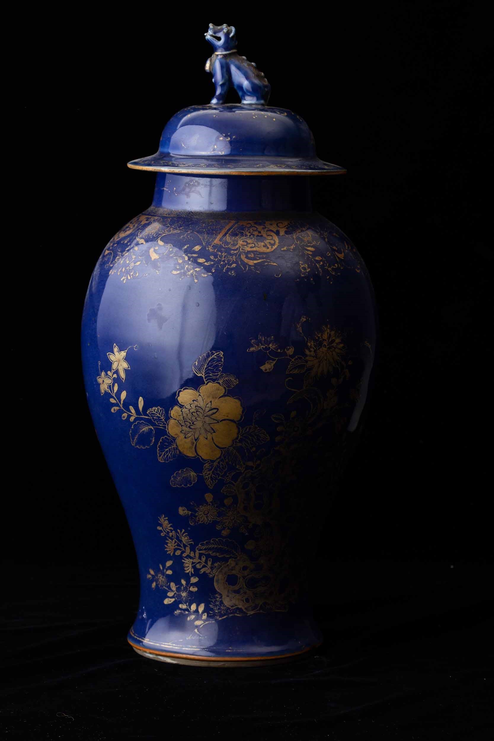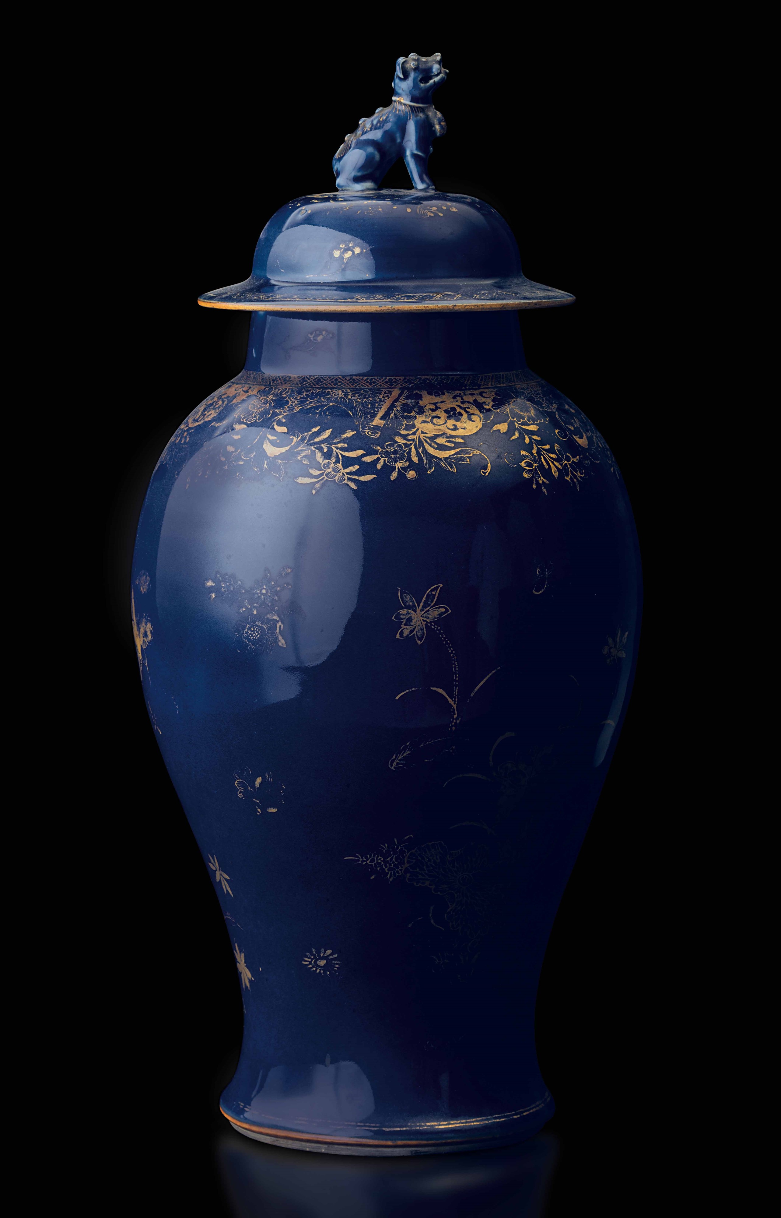 Potiche in porcellana monocroma blu con decori lumeggiati in color oro e presa del [..]
