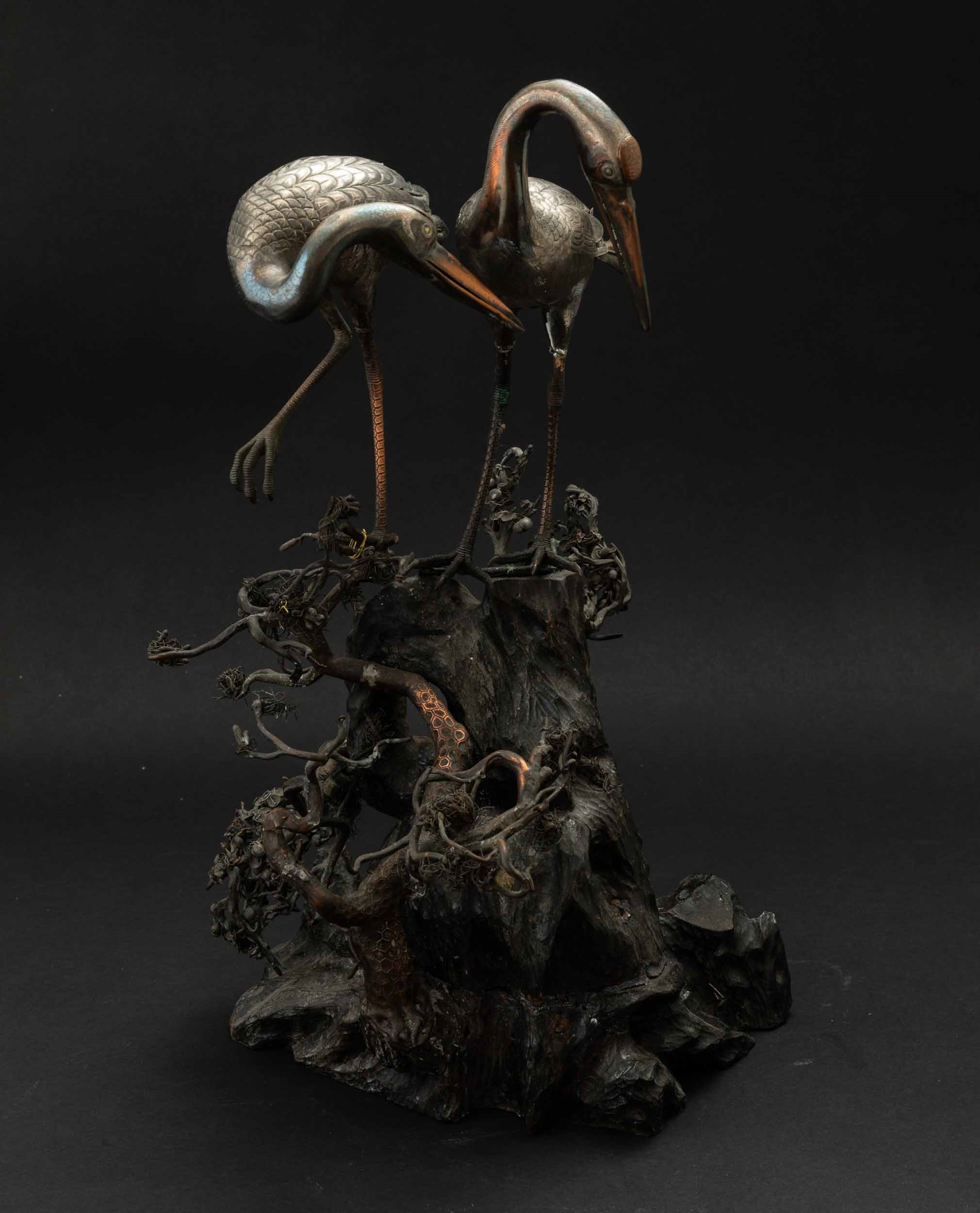 Radice in legno montata con figure di gru e altri piccoli animali in argento parzialmente [..]