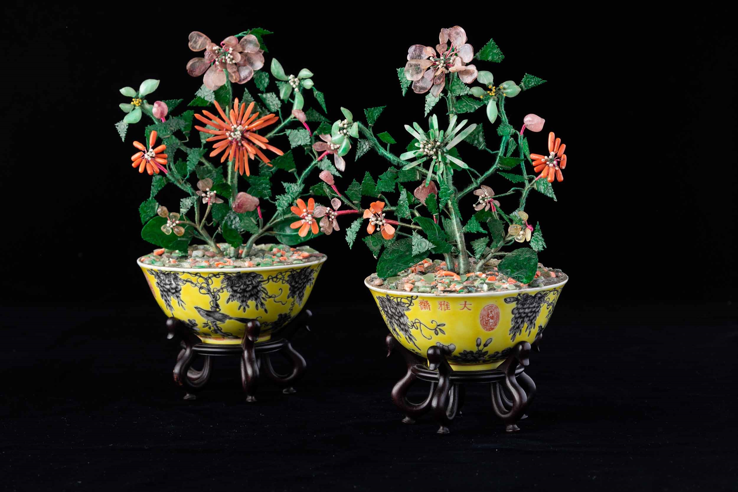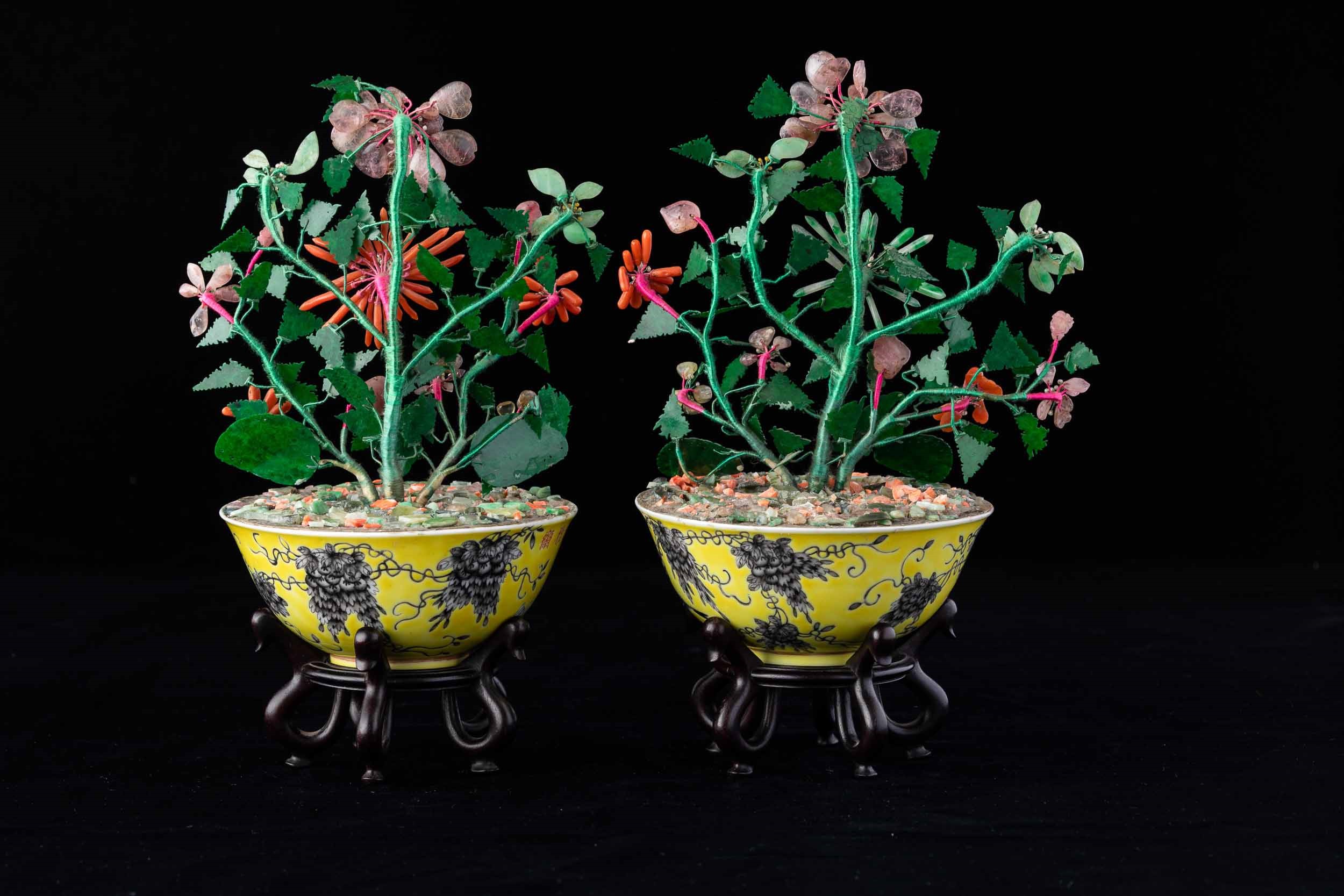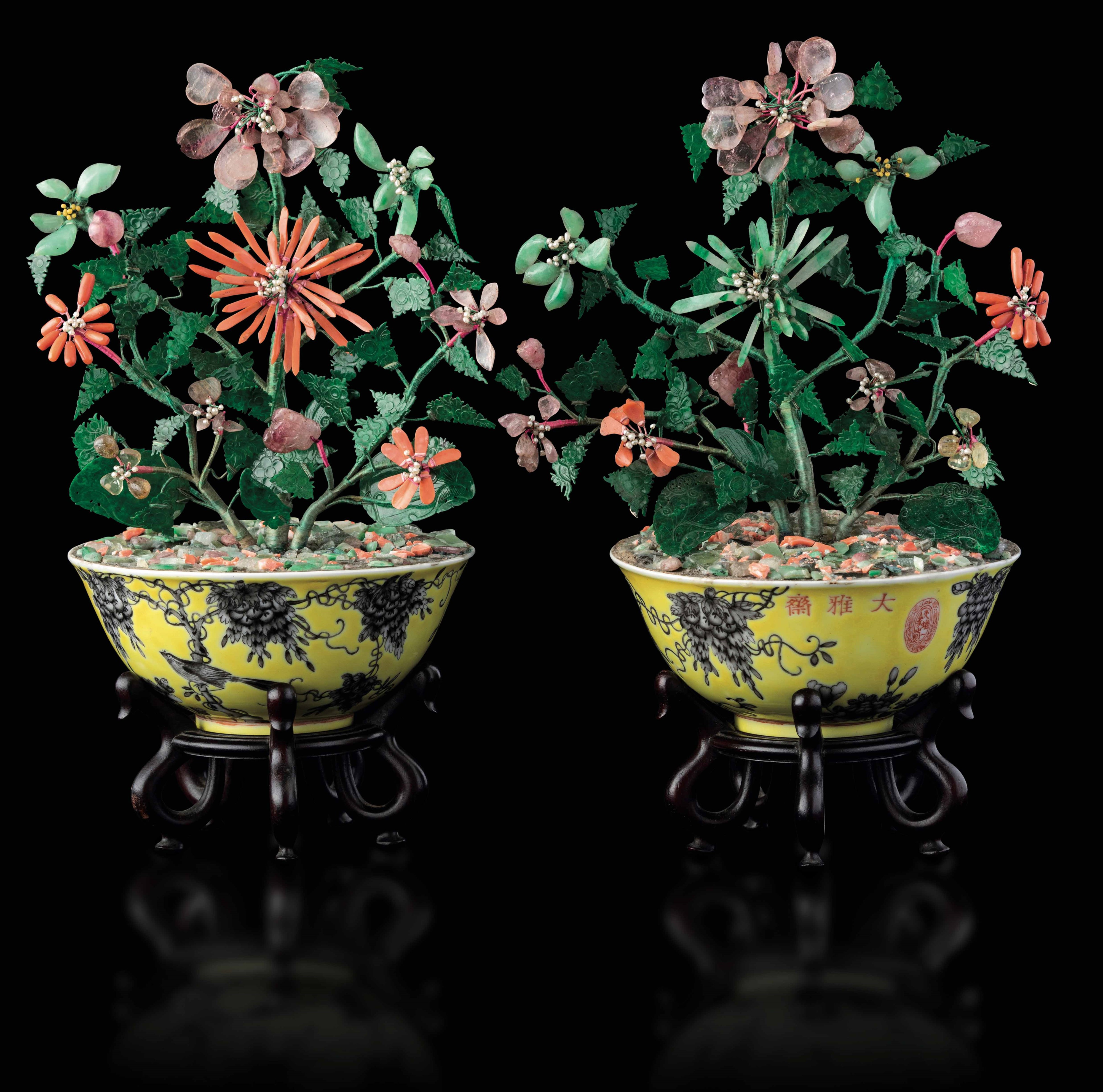 Rara coppia di ciotole in porcellana a fondo giallo con decoro naturalistico a grisaille [..]