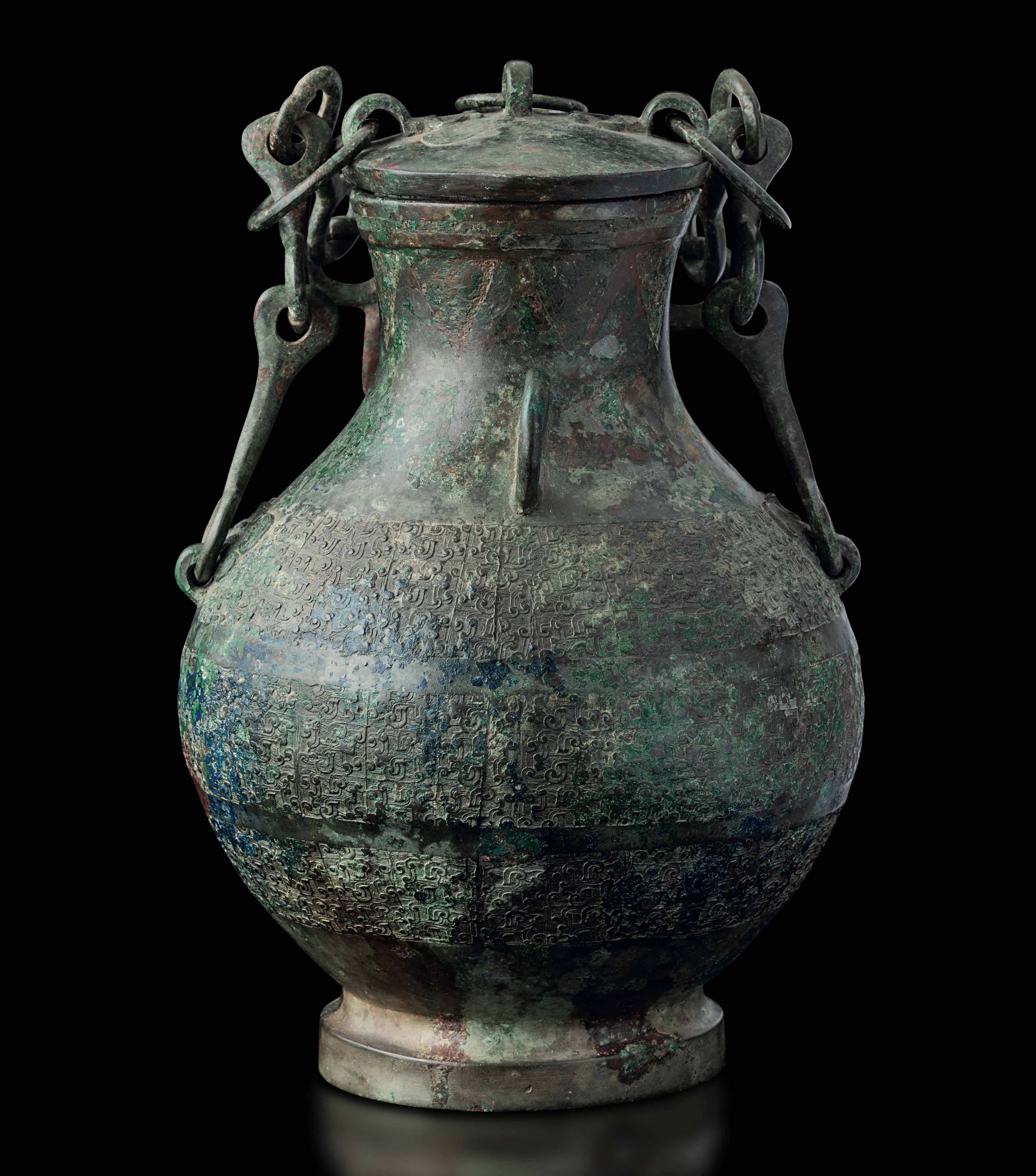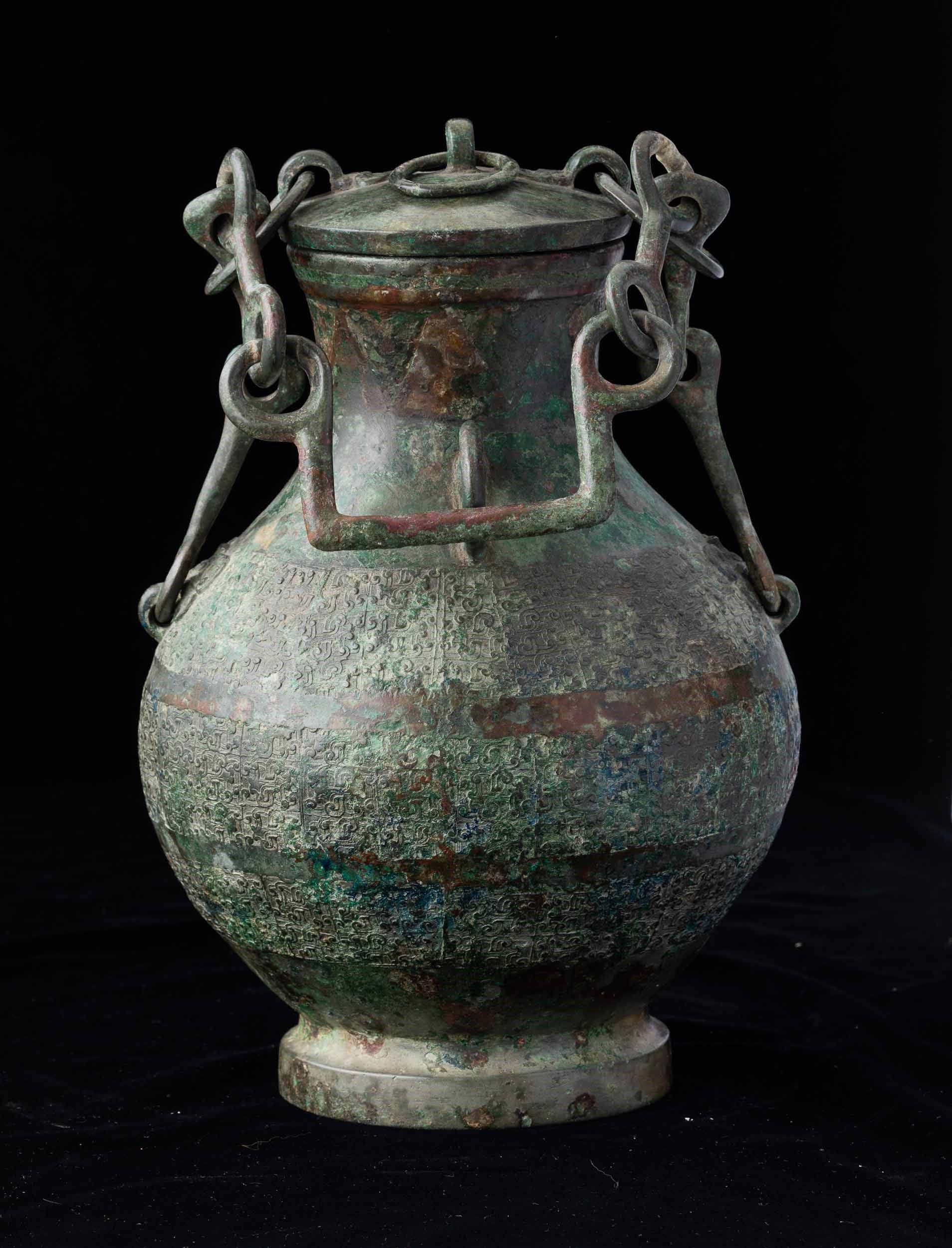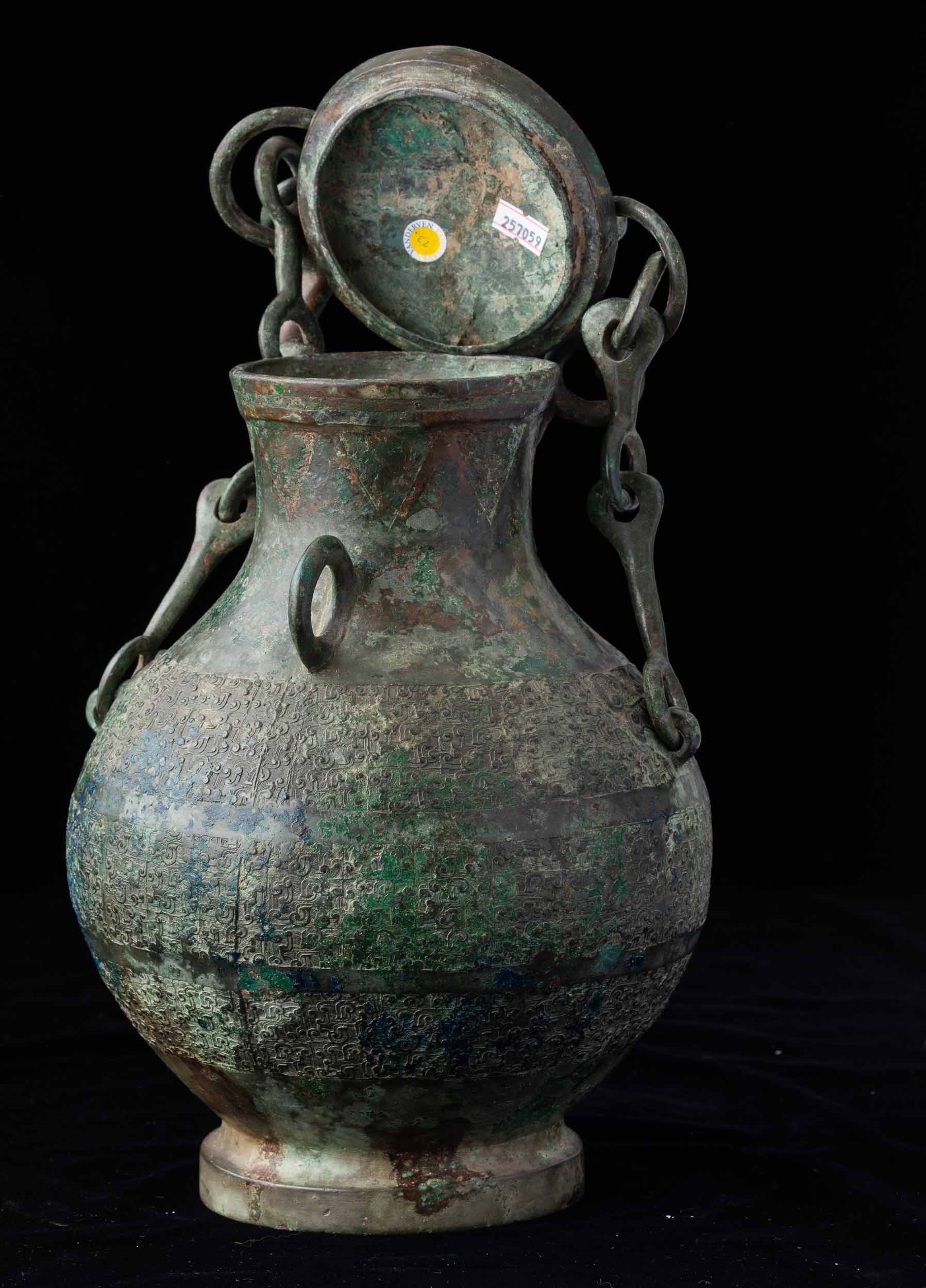Raro e magnifico vaso Hu in bronzo con coperchio, manici a catena e decori geometrici [..]