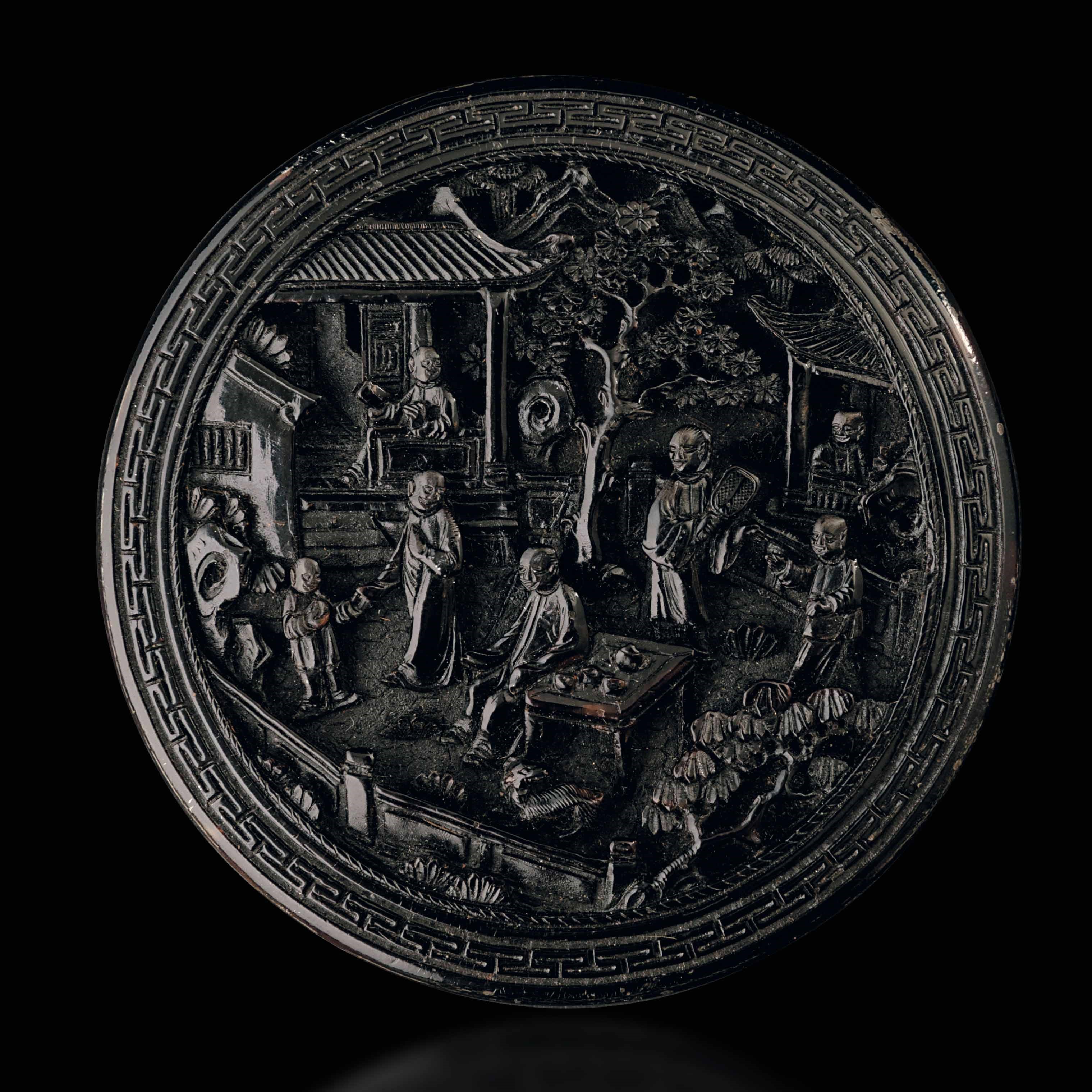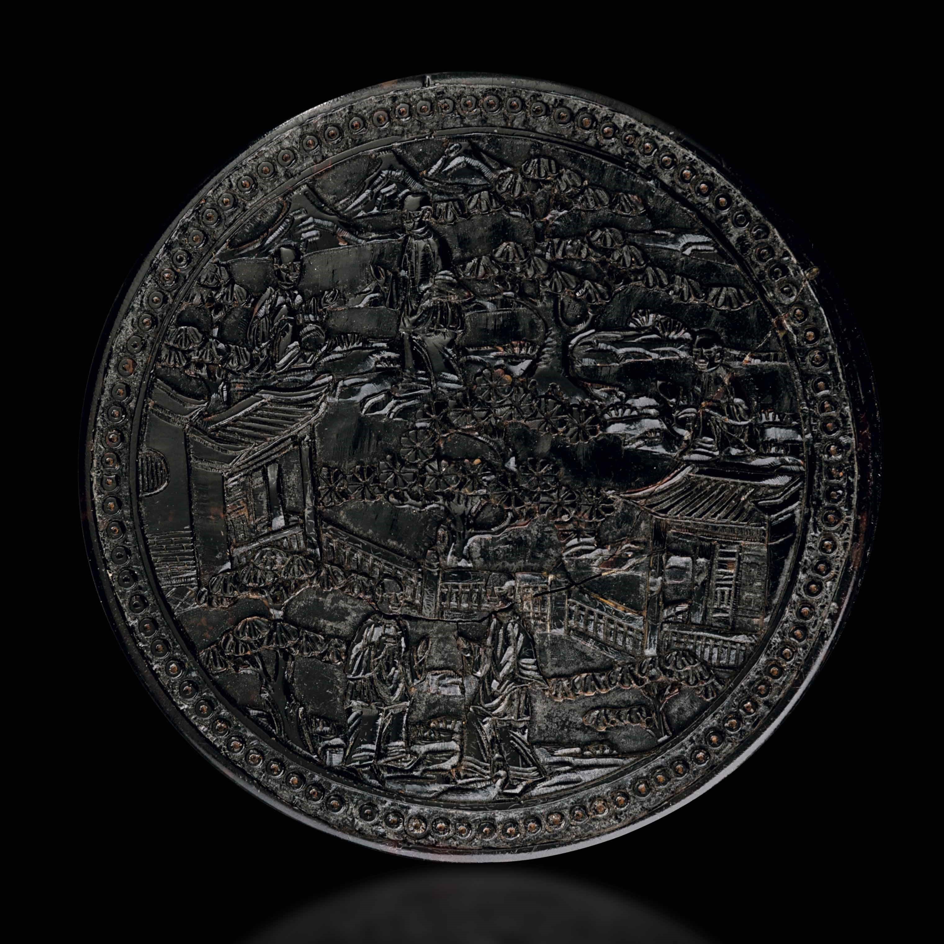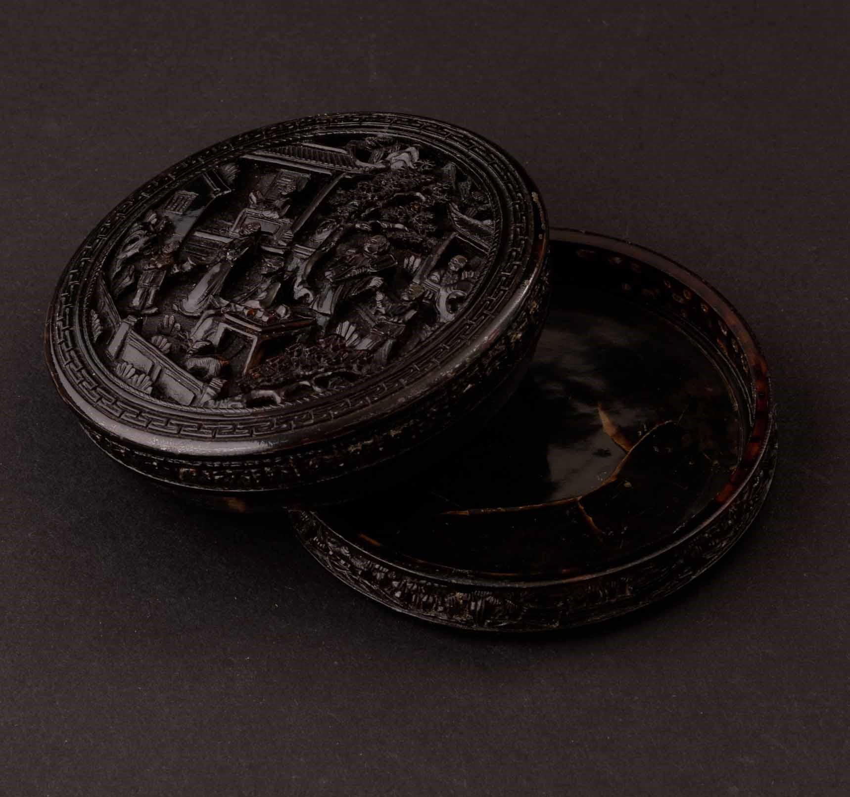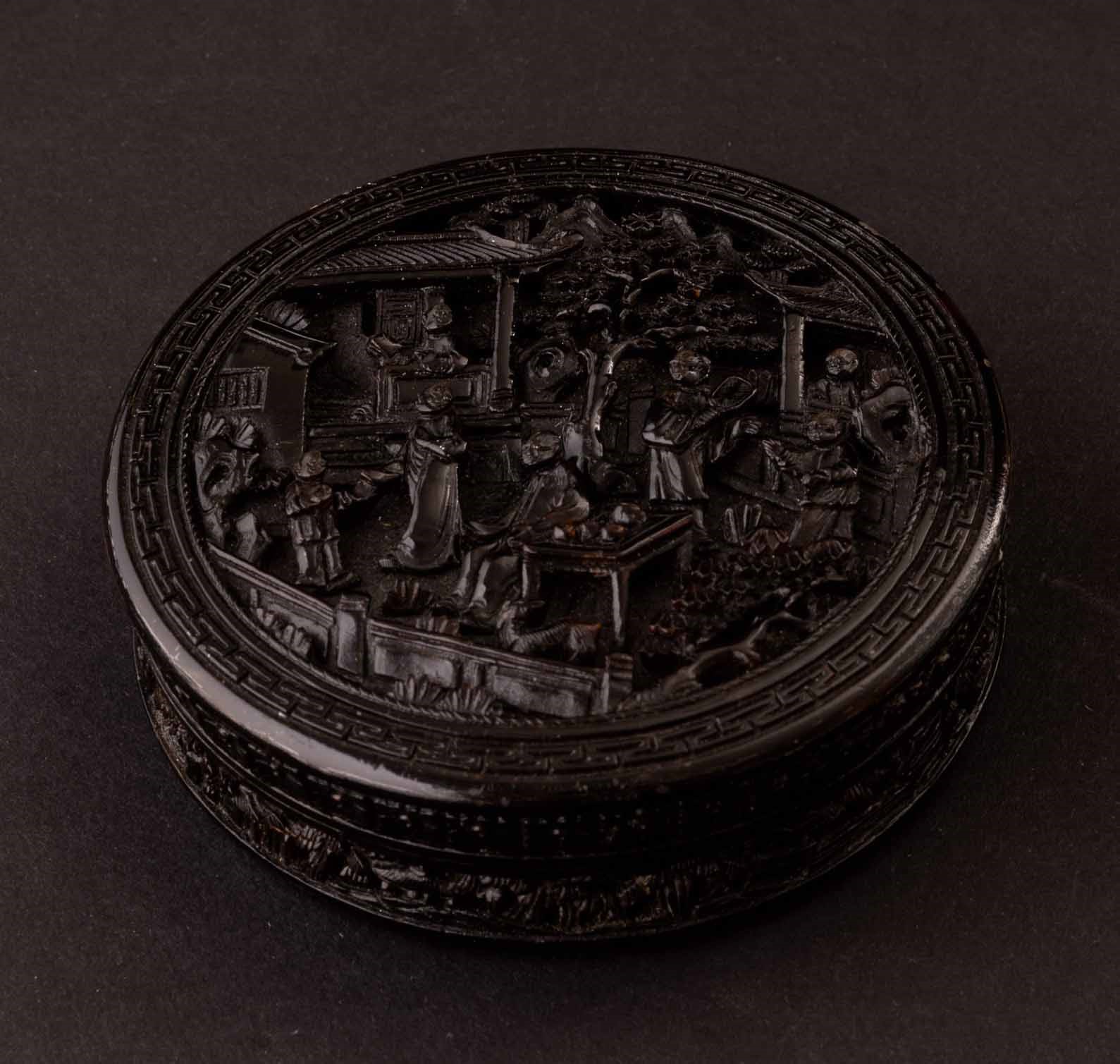 Scatola circolare scolpita in tartaruga raffigurante sul coperchio saggi con discepoli [..]